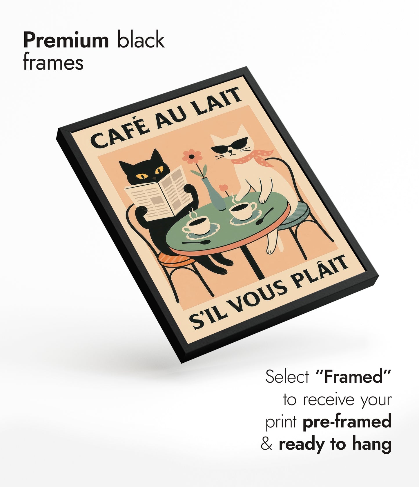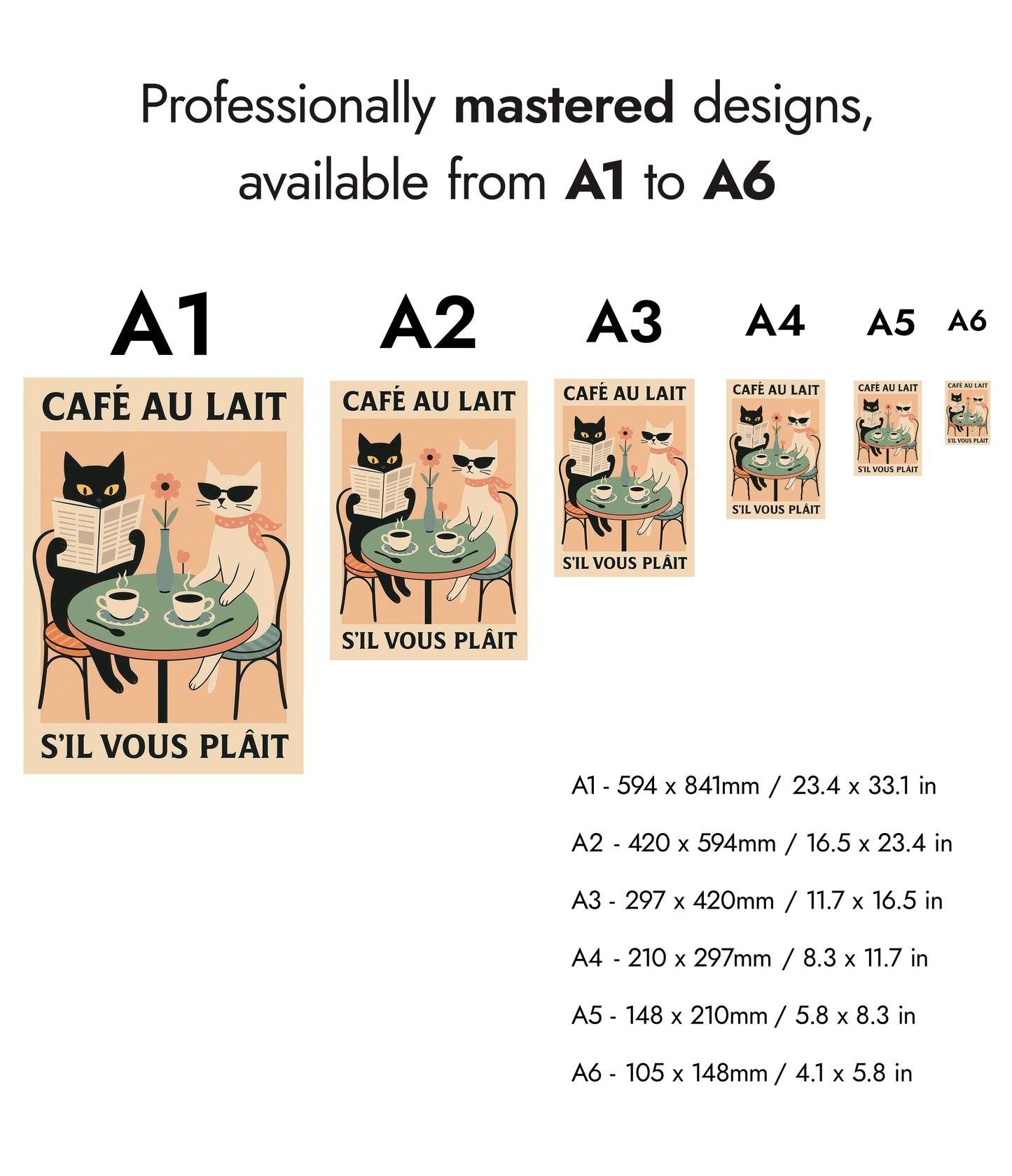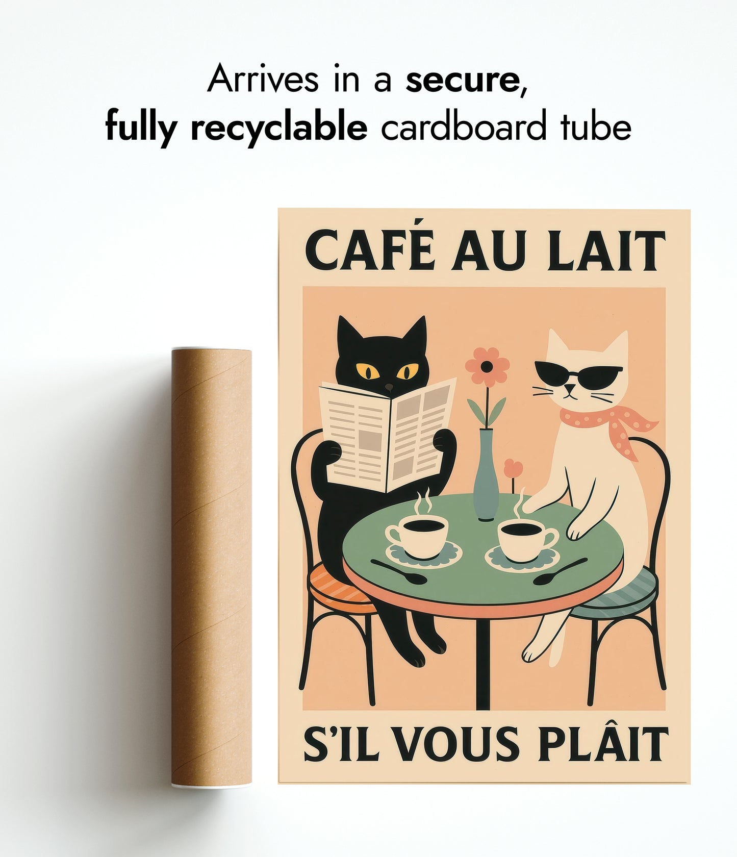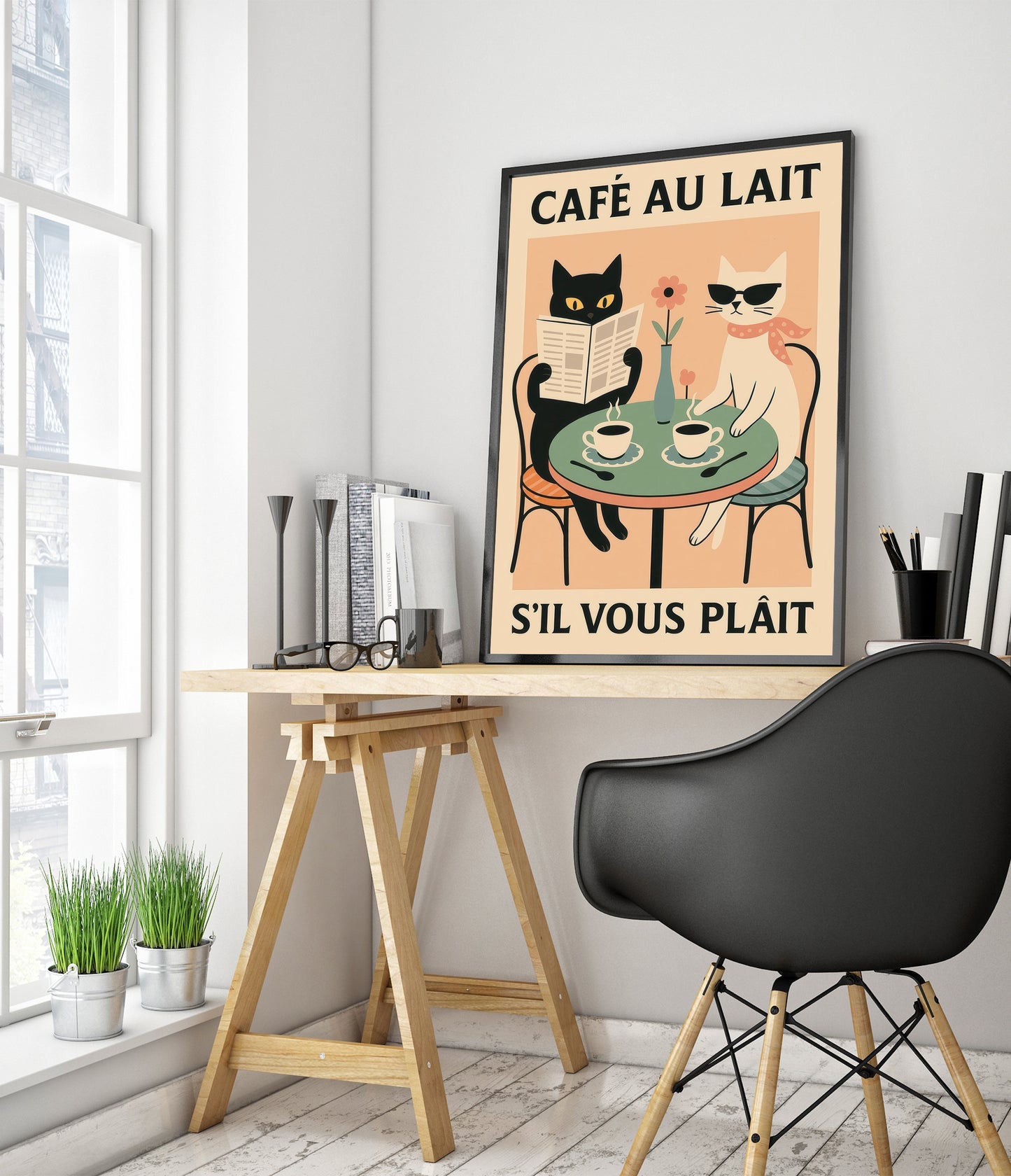 This charming poster features two whimsical cats enjoying a café au lait at a quaint French bistro table. One reads a newspaper, while the other donning sunglasses, all against a minimalist backdrop. With its playful use of typography and illustration, this art print perfectly combines elements of animal art, coffee culture, and French charm, enhancing any space with a touch of whimsy.