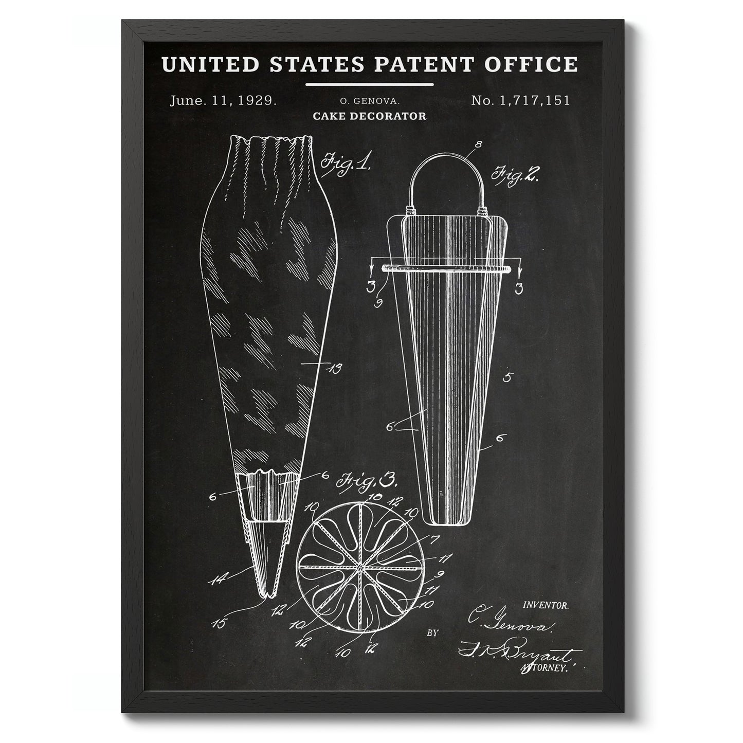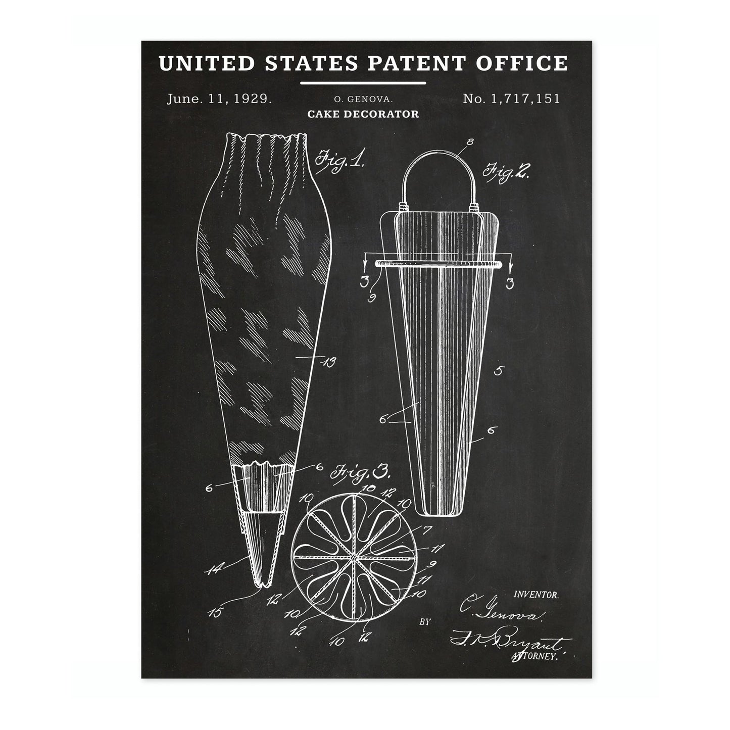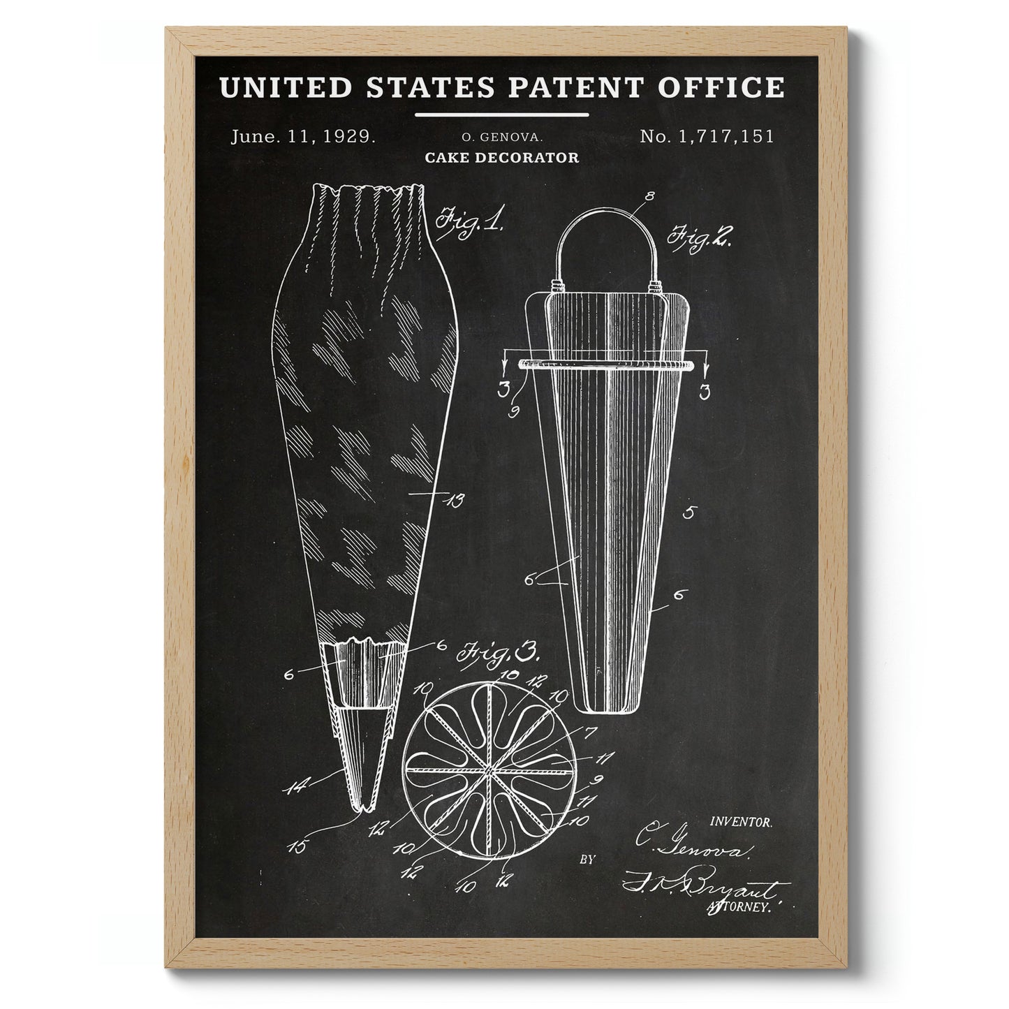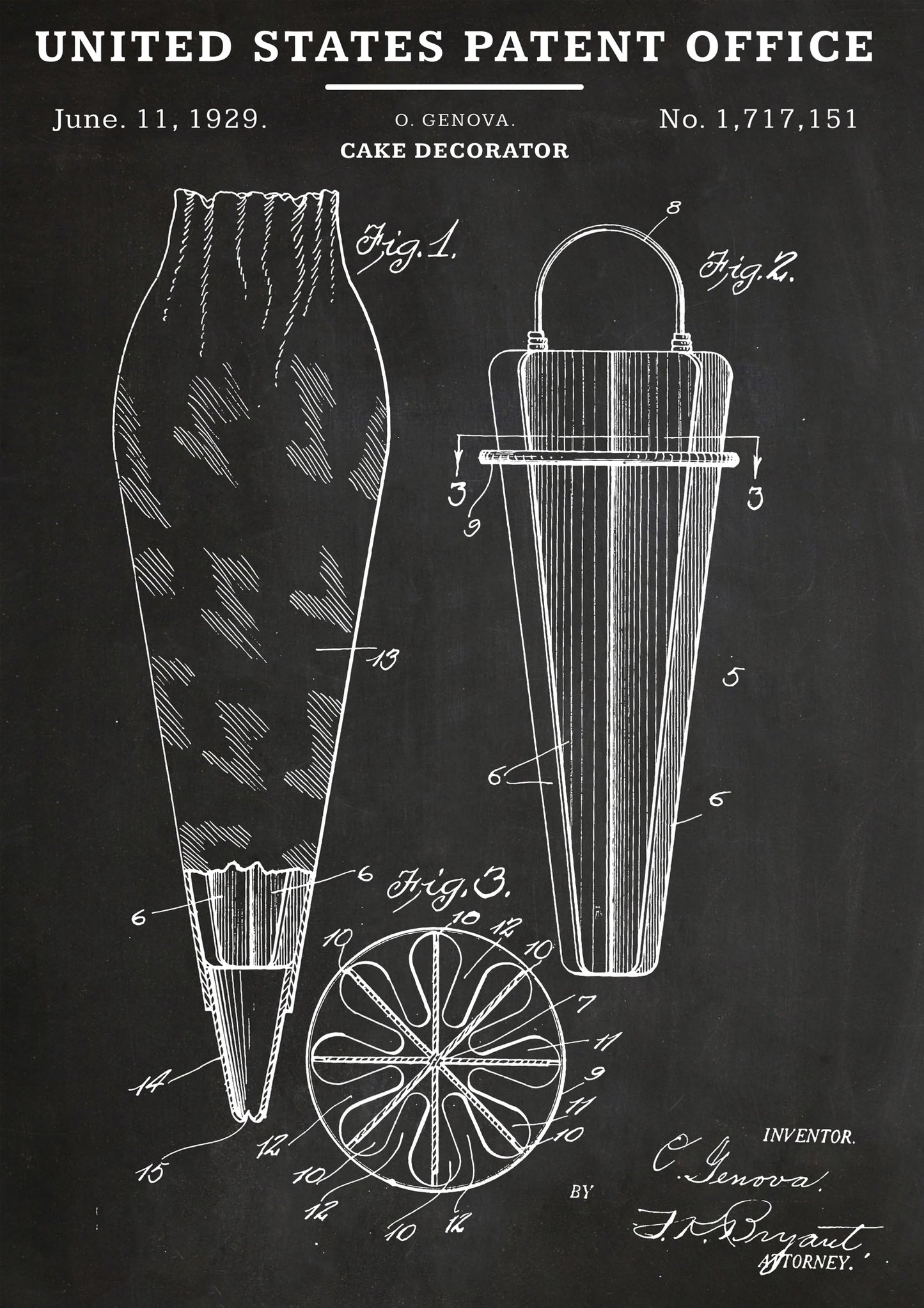 This vintage patent poster from the United States Patent Office, dated June 11, 1929, showcases O. Genova's cake decorator design. The classic black-and-white schematic illustration features detailed line art of the cake decorator mechanism, highlighting its intricate structure in figure views. Ideal for enthusiasts of baking history and nostalgic decor, this poster adds a touch of historical charm to any space.