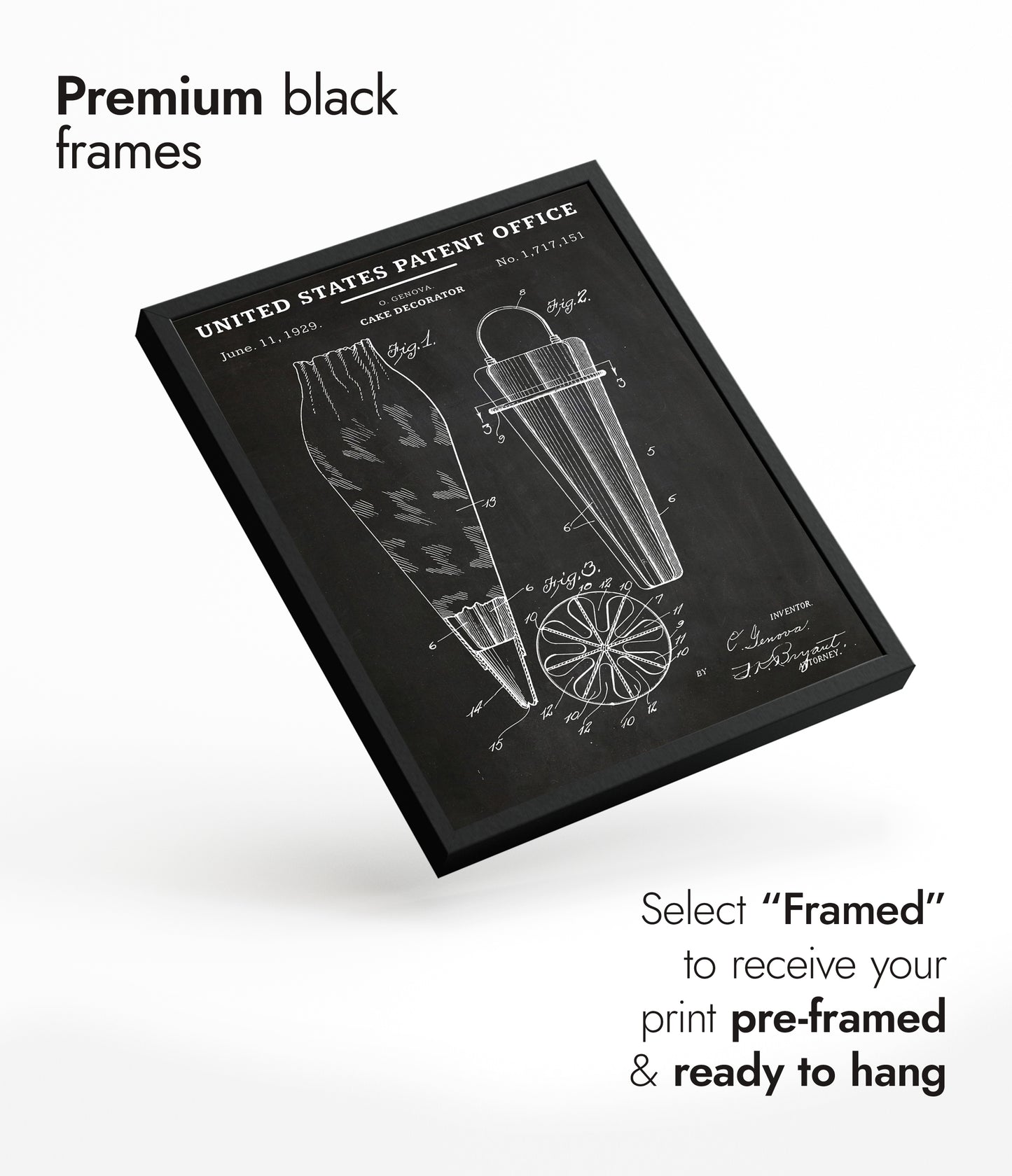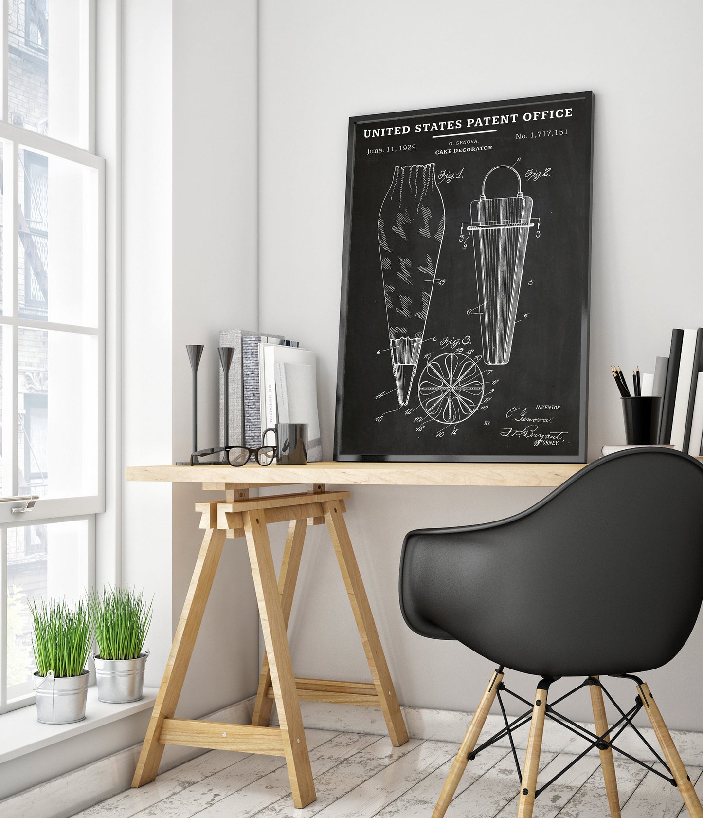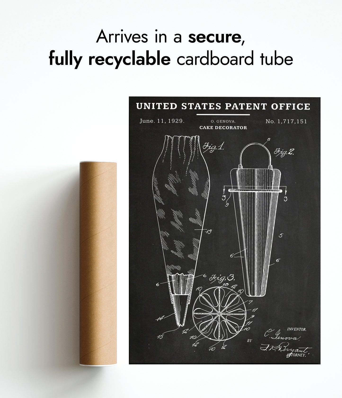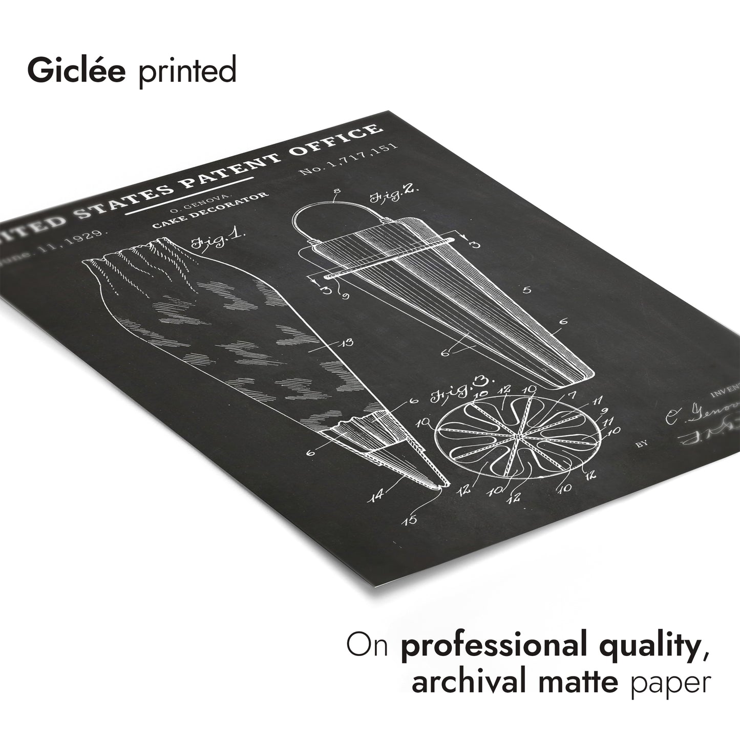 This vintage patent poster from the United States Patent Office, dated June 11, 1929, showcases O. Genova's cake decorator design. The classic black-and-white schematic illustration features detailed line art of the cake decorator mechanism, highlighting its intricate structure in figure views. Ideal for enthusiasts of baking history and nostalgic decor, this poster adds a touch of historical charm to any space.