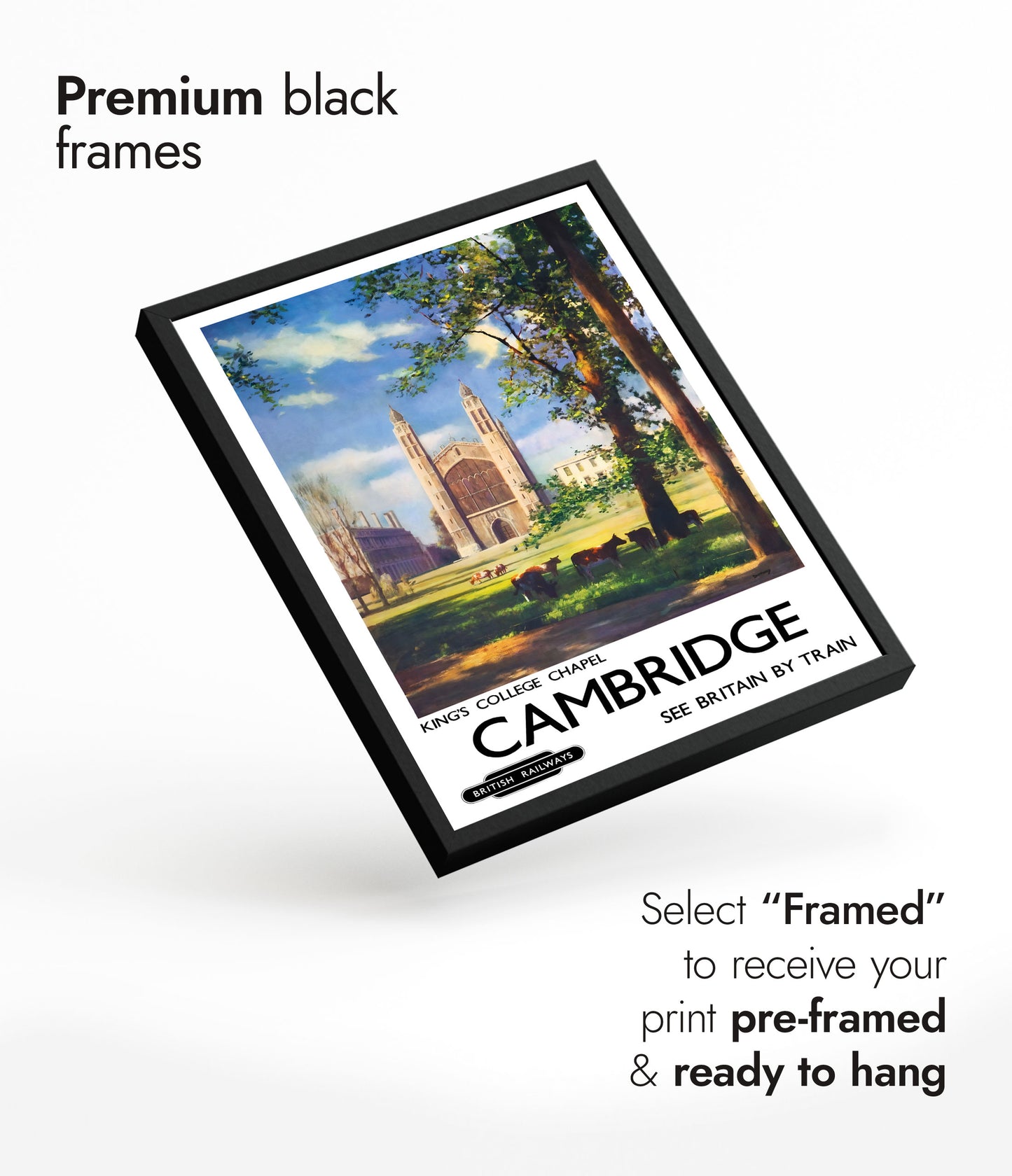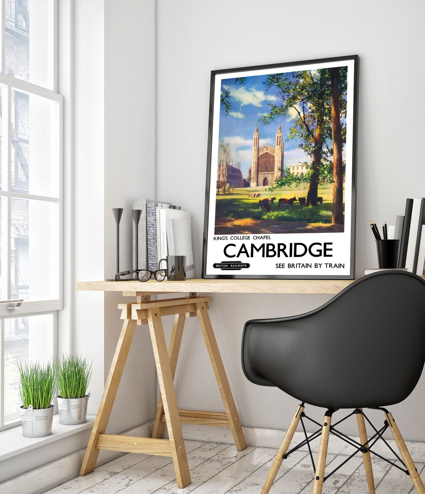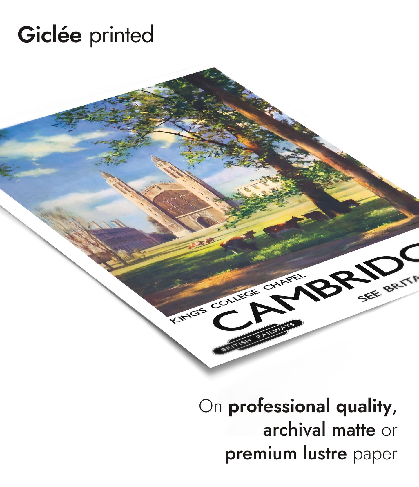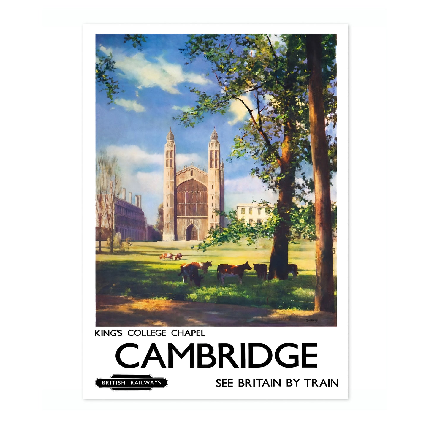 This vintage travel poster captures the grandeur of King's College Chapel in Cambridge, highlighting its intricate Gothic architecture amidst a serene pastoral scene. Majestic cows graze in the foreground beneath a clear sky, with the text "See Britain by Train" promoting travel via British Railways. Ideal for fans of English landmarks and university architecture.