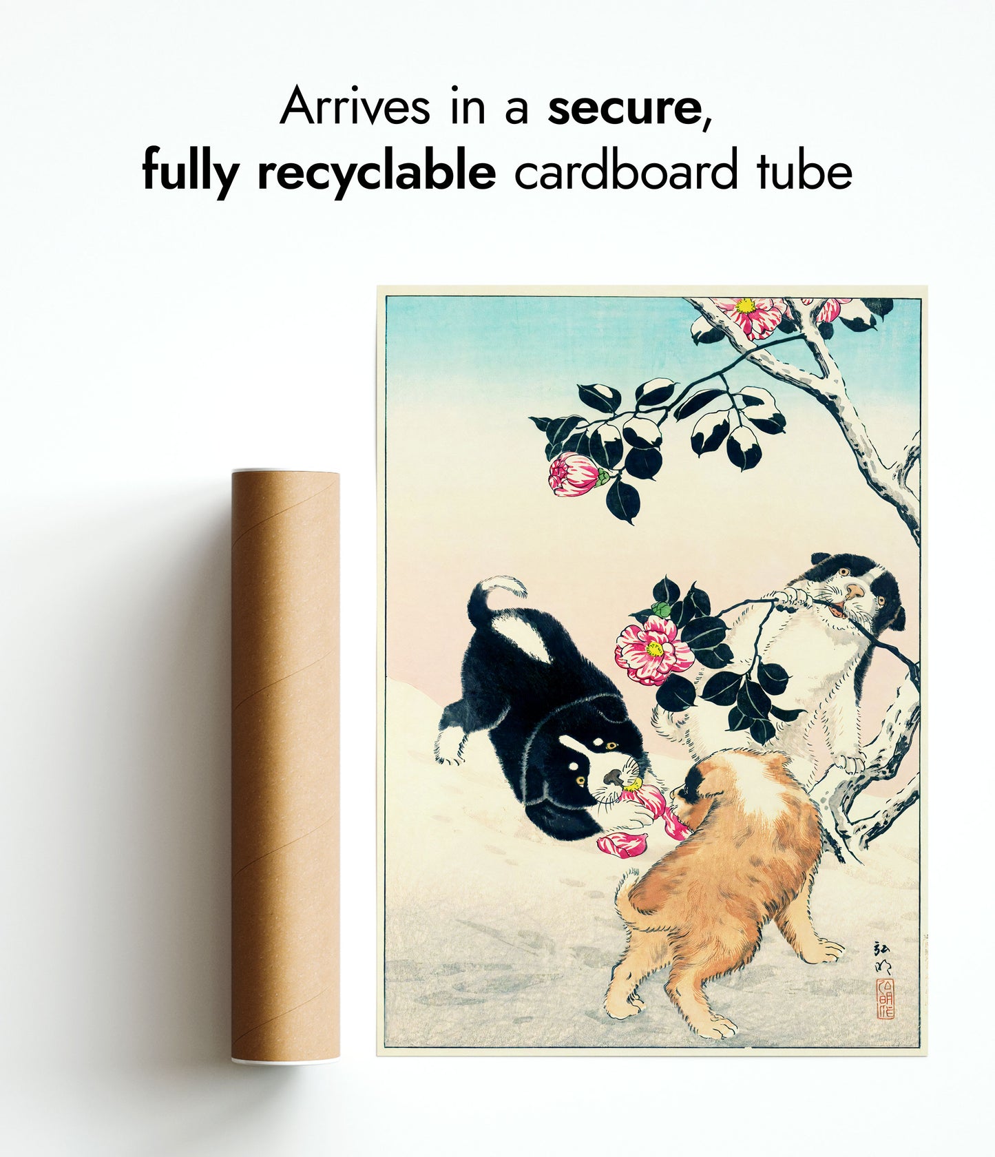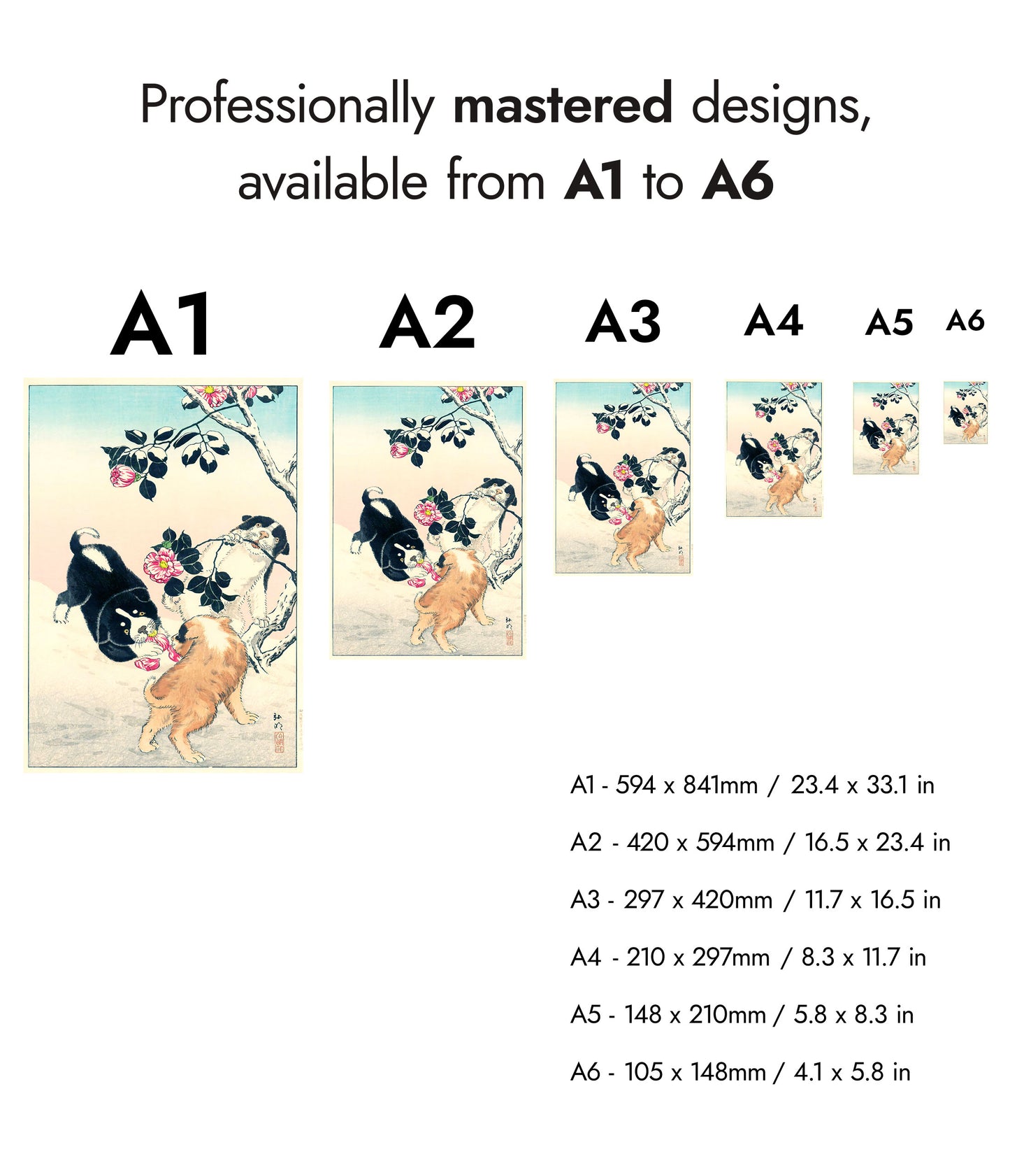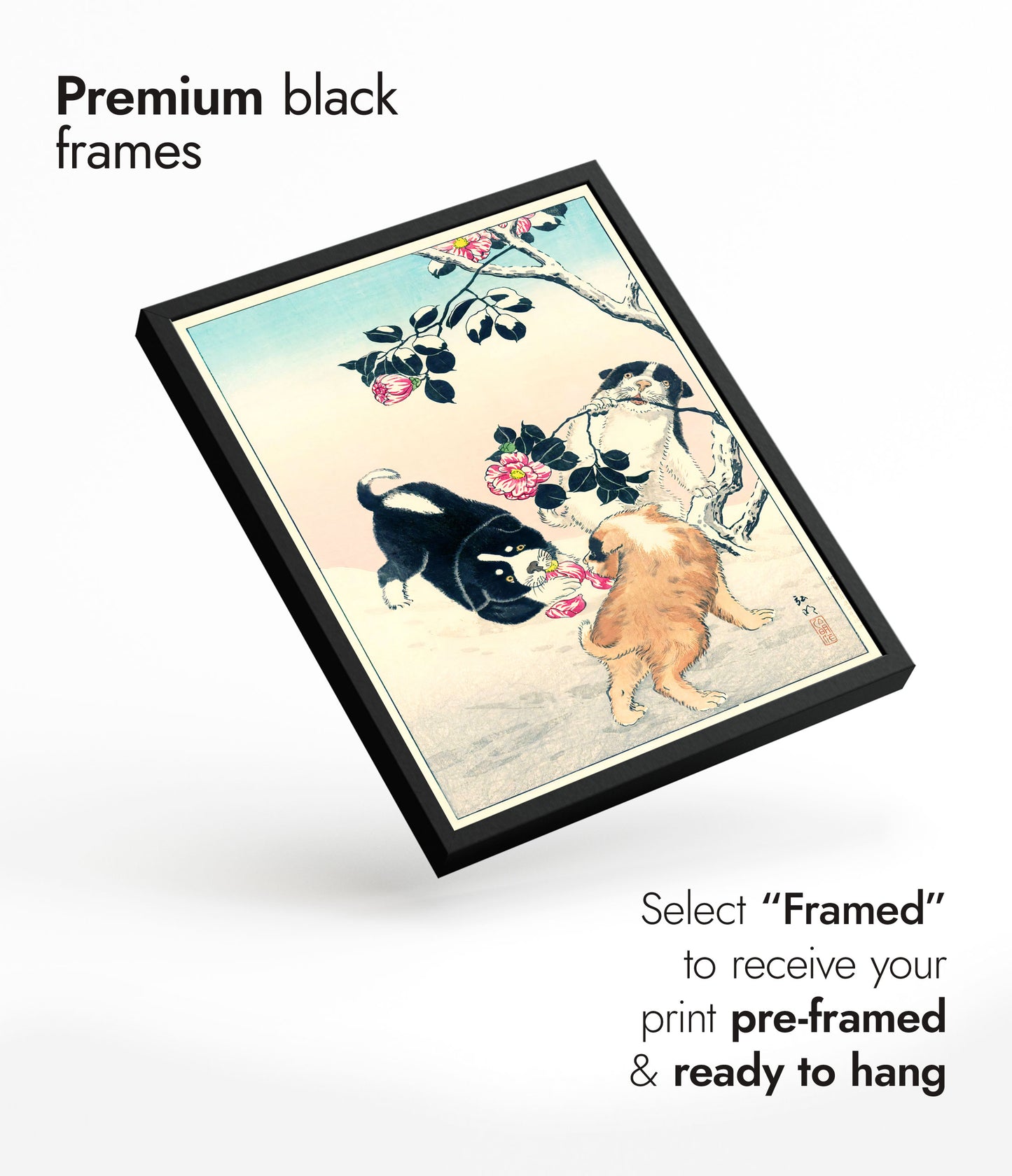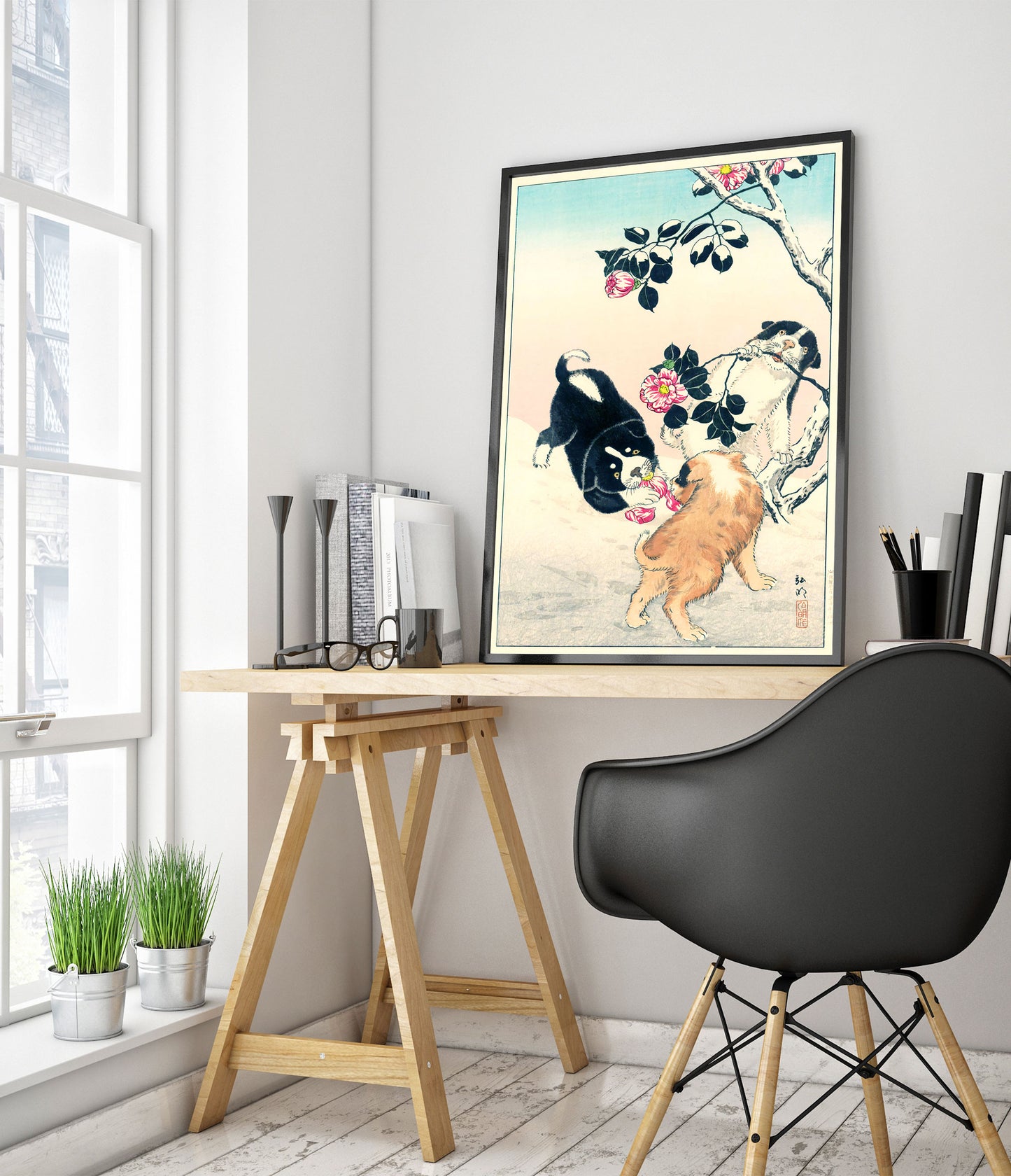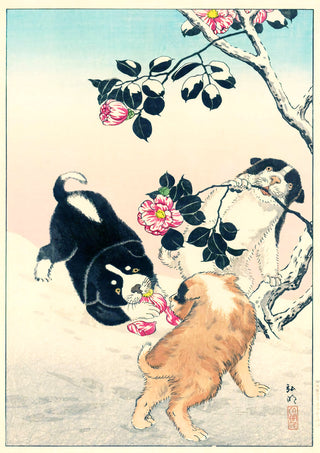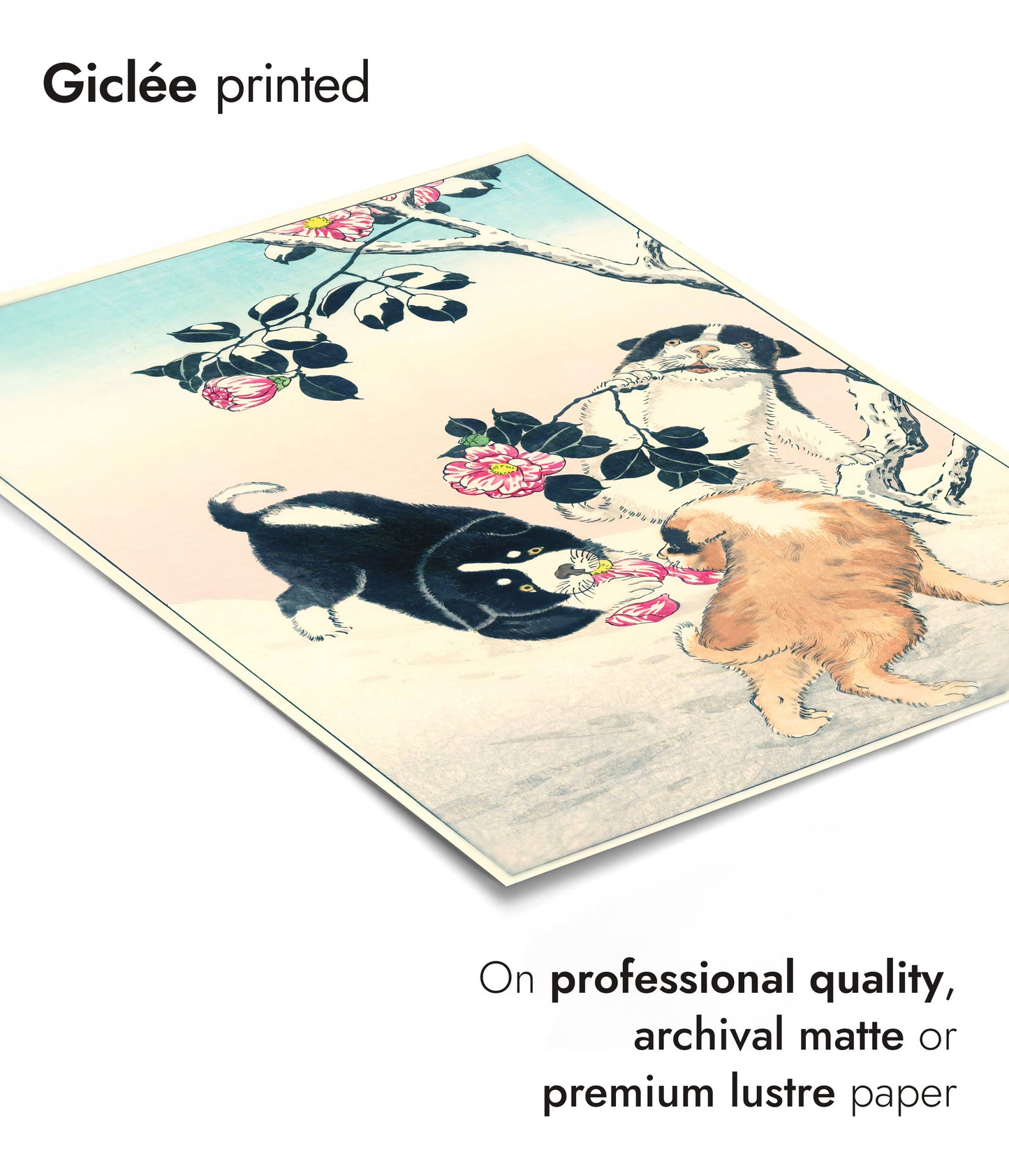 This traditional Japanese woodblock print, "Camellia and Puppies in Snow" by Hiroaki Takahashi, features playful puppies amid a serene winter landscape. Delicate camellia blossoms contrast with the snowy backdrop, encapsulating a timeless Ukiyo-E style. Ideal for adding a touch of classic Japanese artistry to your decor, this poster showcases the harmony between nature and animals.