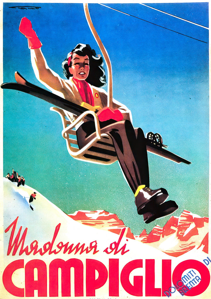 This vintage skiing poster captures the thrill of winter sports in Campiglio, Italy. Featuring a skier on a chairlift set against the snowy peaks of the Alps, the vibrant illustration highlights the excitement of European alpine destinations. Perfect for adding a retro travel vibe to your decor. Ideal for sports and travel enthusiasts.
