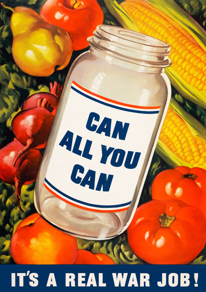 This "Can All You Can" vintage poster features a striking illustration of fresh vegetables surrounding an empty glass jar, prominently displaying a wartime slogan encouraging food preservation. The bold text and vibrant vegetables against leafy greens create a compelling and nostalgic visual. Ideal for collectors of propaganda art and food enthusiasts alike, this print embodies historical significance and vintage charm.