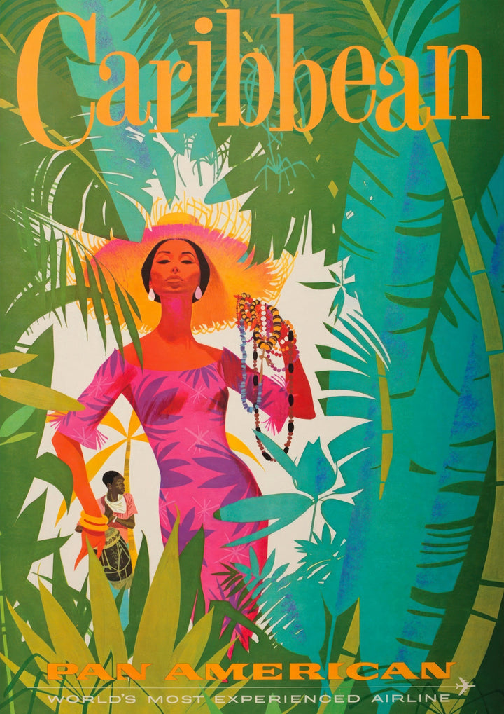 This vintage-inspired poster titled "Caribbean" captures an elegant woman adorned in a bright dress amidst lush, tropical foliage. The vibrant illustration features palm trees and dense jungle elements, exuding the lively essence of the Caribbean. Perfect for travel enthusiasts, this portrait brings a touch of exotic warmth to any space. Ideal for adding a vintage tropical vibe to your decor.