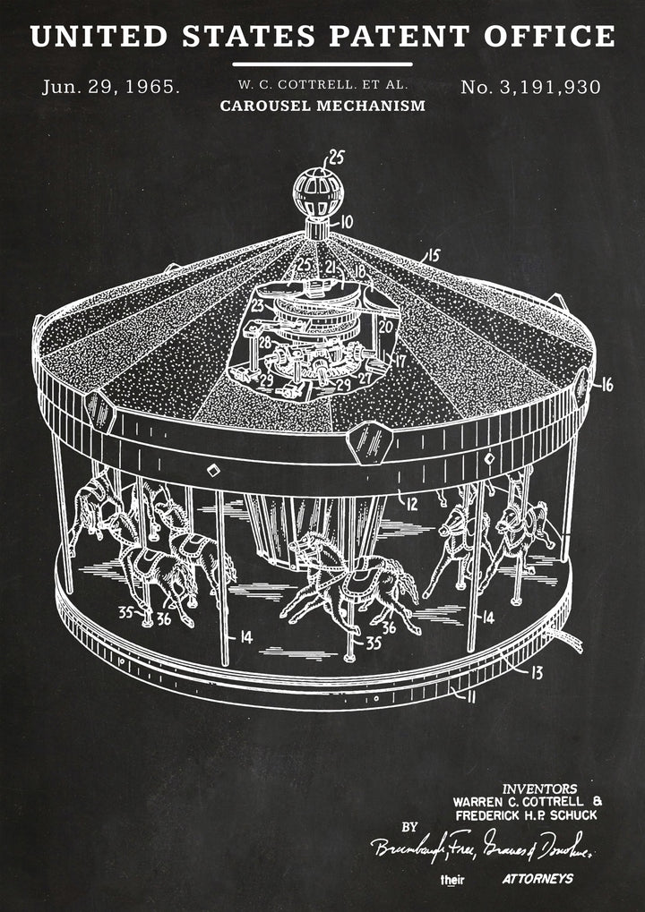 This vintage patent poster features a meticulously detailed schematic of a carousel mechanism, dated June 29, 1965. Presented in a classic blackboard style, the line art illustration captures the intricacies of this nostalgic circus ride. Ideal for enthusiasts of vintage patents and mechanical designs, this portrait print adds a touch of historical charm to any space.