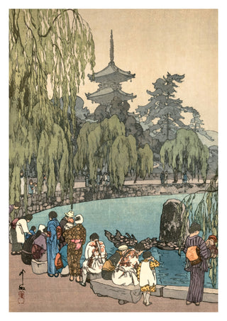 This traditional Japanese woodblock print titled "Carp & Tortoises" by Hiroshi Yoshida showcases a serene pond scene with rich details. Figures in traditional attire admire carp and tortoises near a peaceful lake framed by willows and a pagoda temple. Ideal for those who appreciate classic Japanese Ukiyo-e art, this portrait-style poster vividly captures tranquility and cultural heritage.