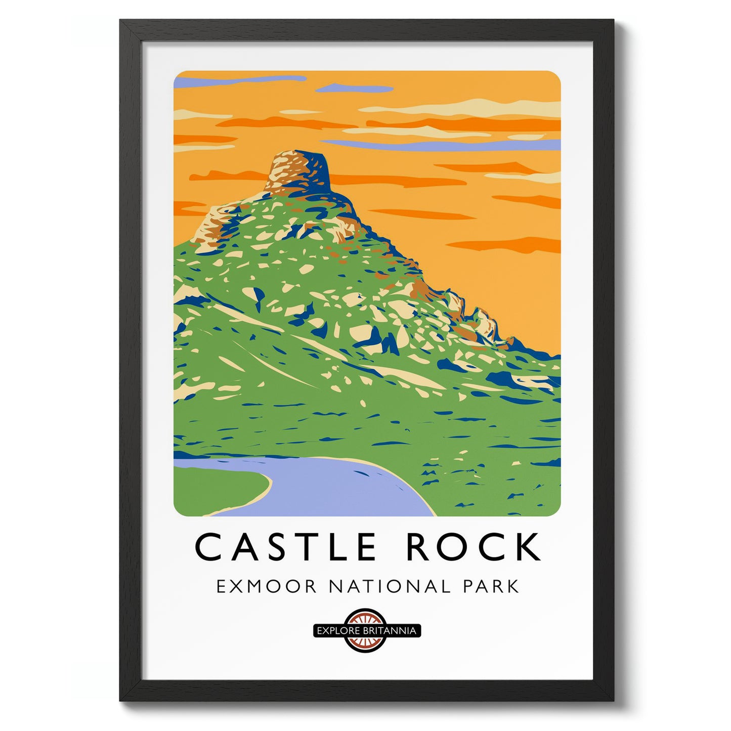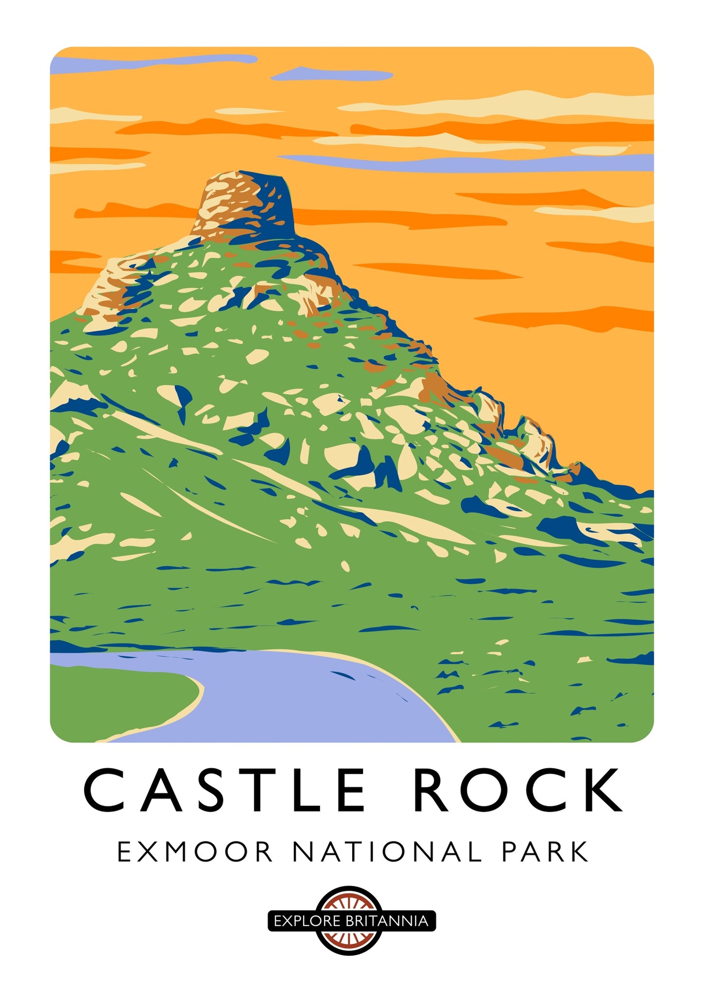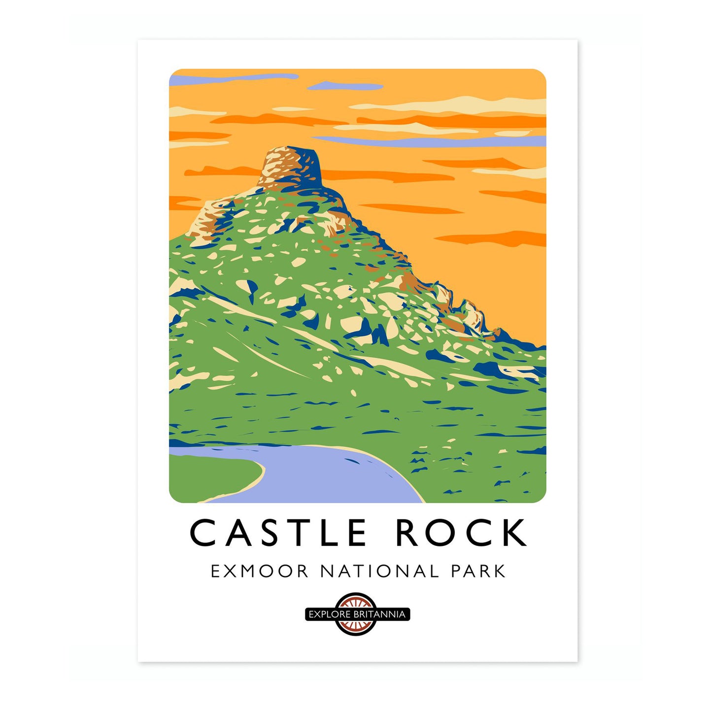 This vibrant poster of Castle Rock in Exmoor National Park captures the scenic beauty of the English landscape. The striking graphic illustration features lush green terrain crowned by the rugged Castle Rock, set against a vivid orange sky. Ideal for travel enthusiasts and nature lovers, this artwork celebrates Britain's natural wonders with a modern, illustrative style.