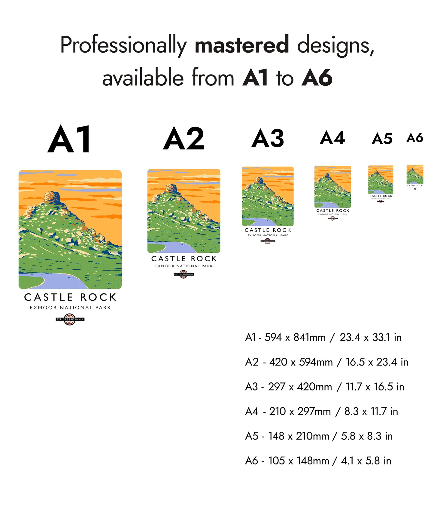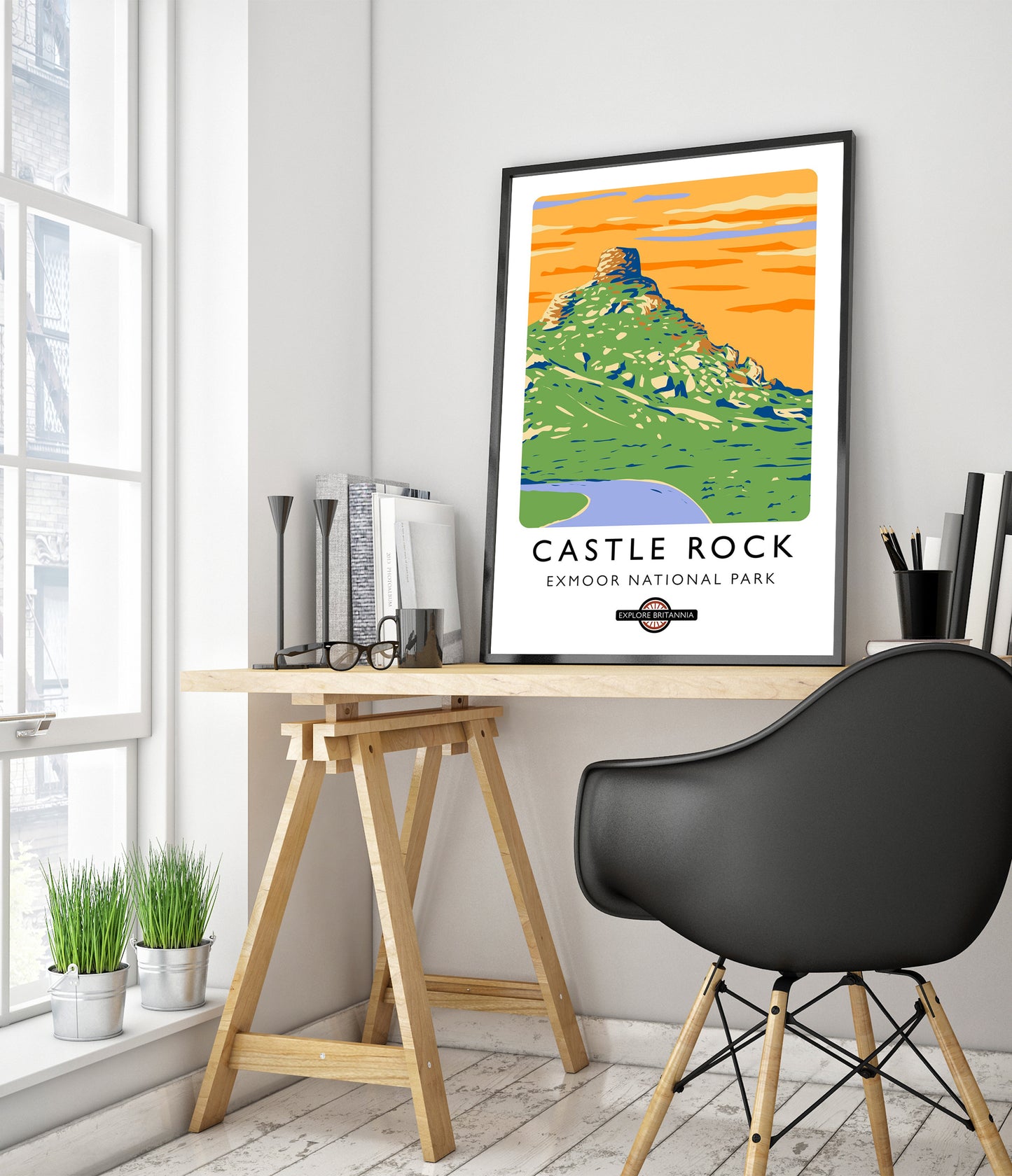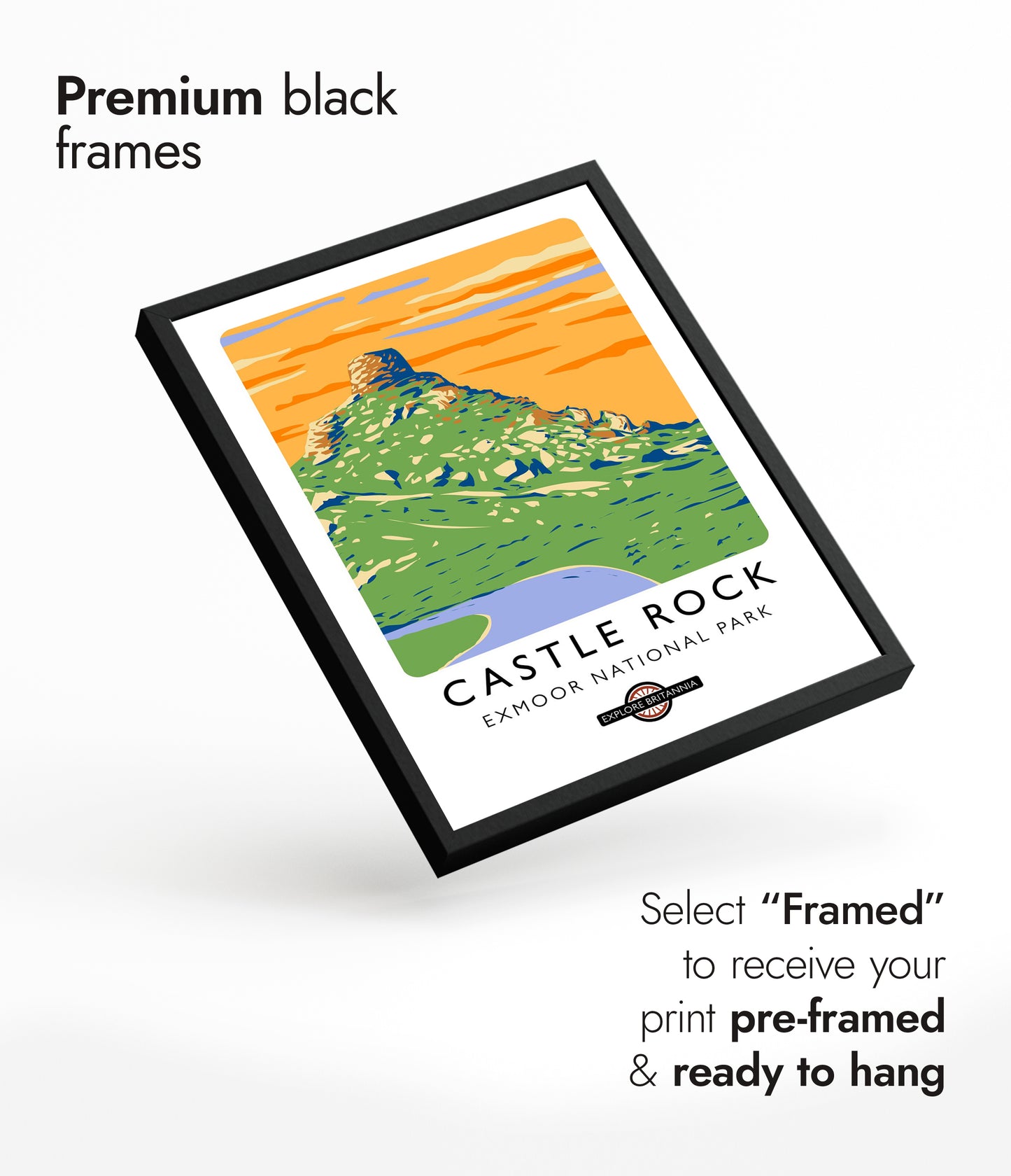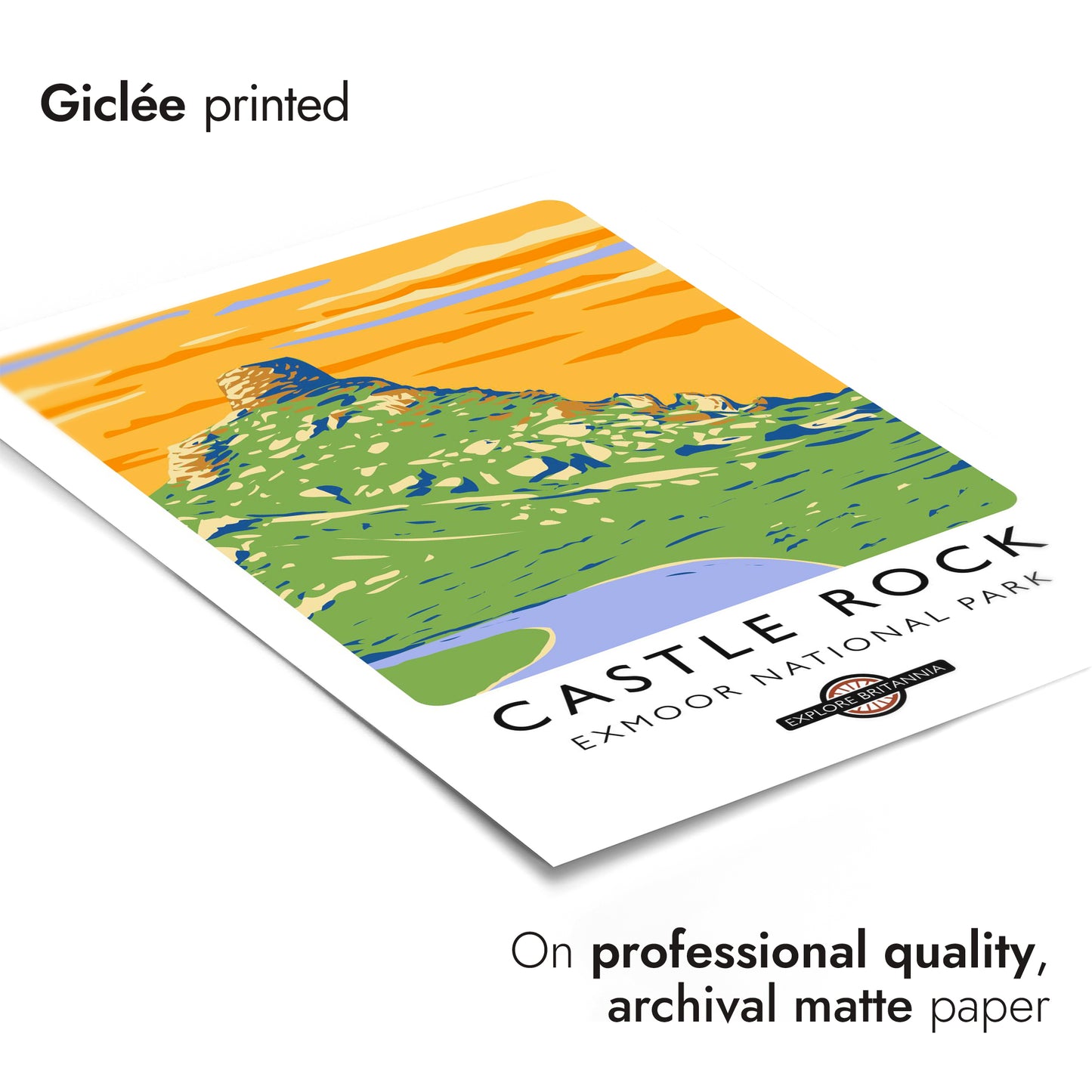 This vibrant poster of Castle Rock in Exmoor National Park captures the scenic beauty of the English landscape. The striking graphic illustration features lush green terrain crowned by the rugged Castle Rock, set against a vivid orange sky. Ideal for travel enthusiasts and nature lovers, this artwork celebrates Britain's natural wonders with a modern, illustrative style.