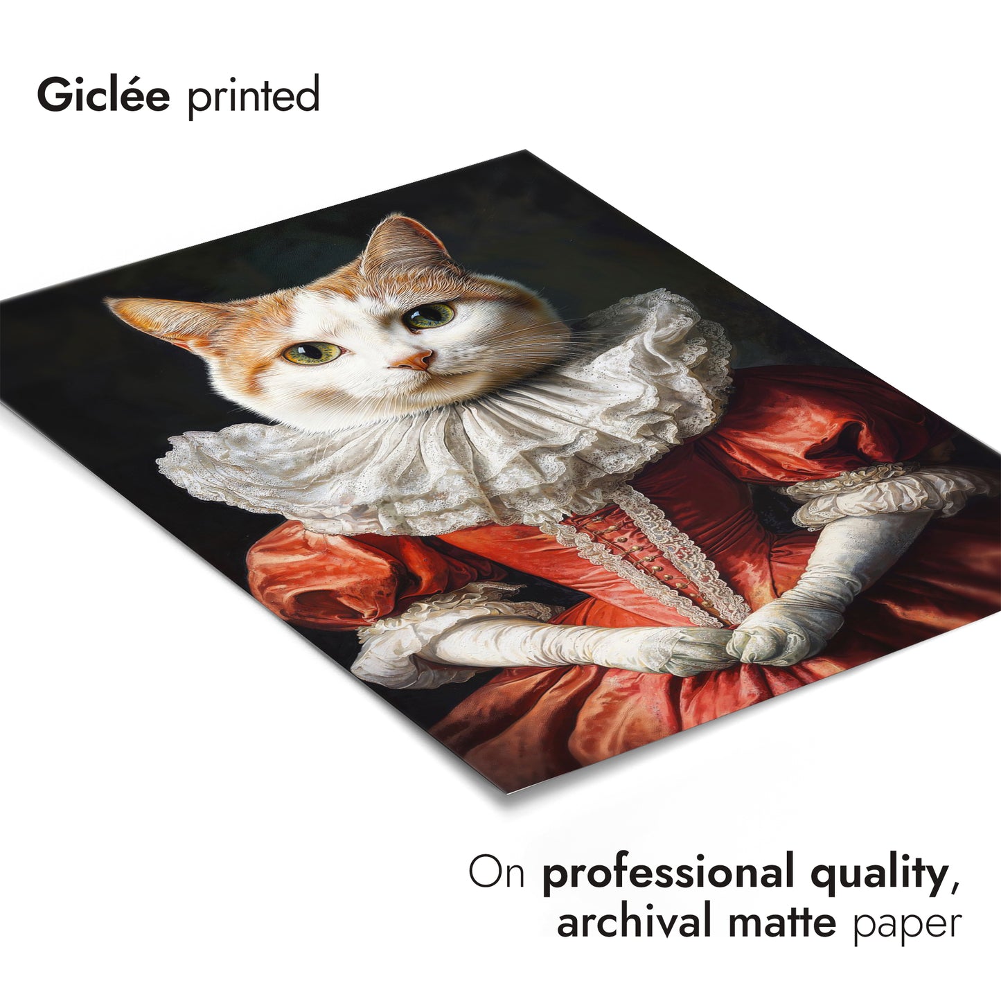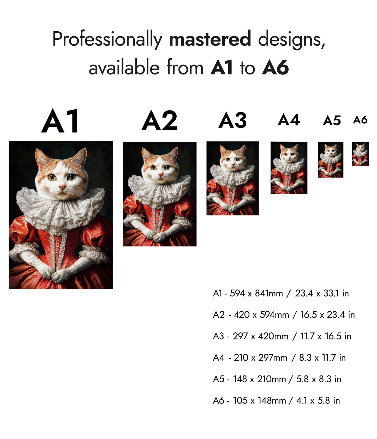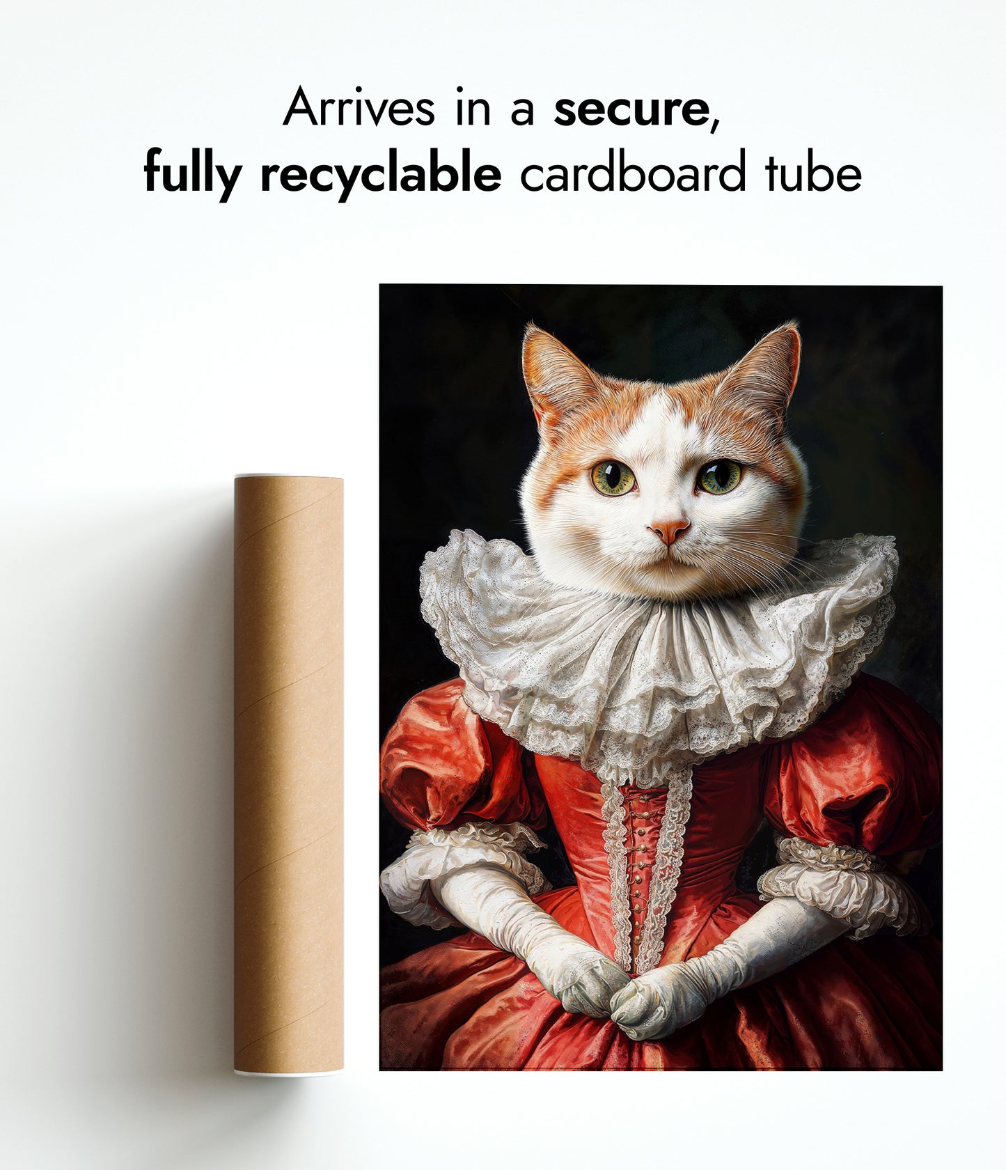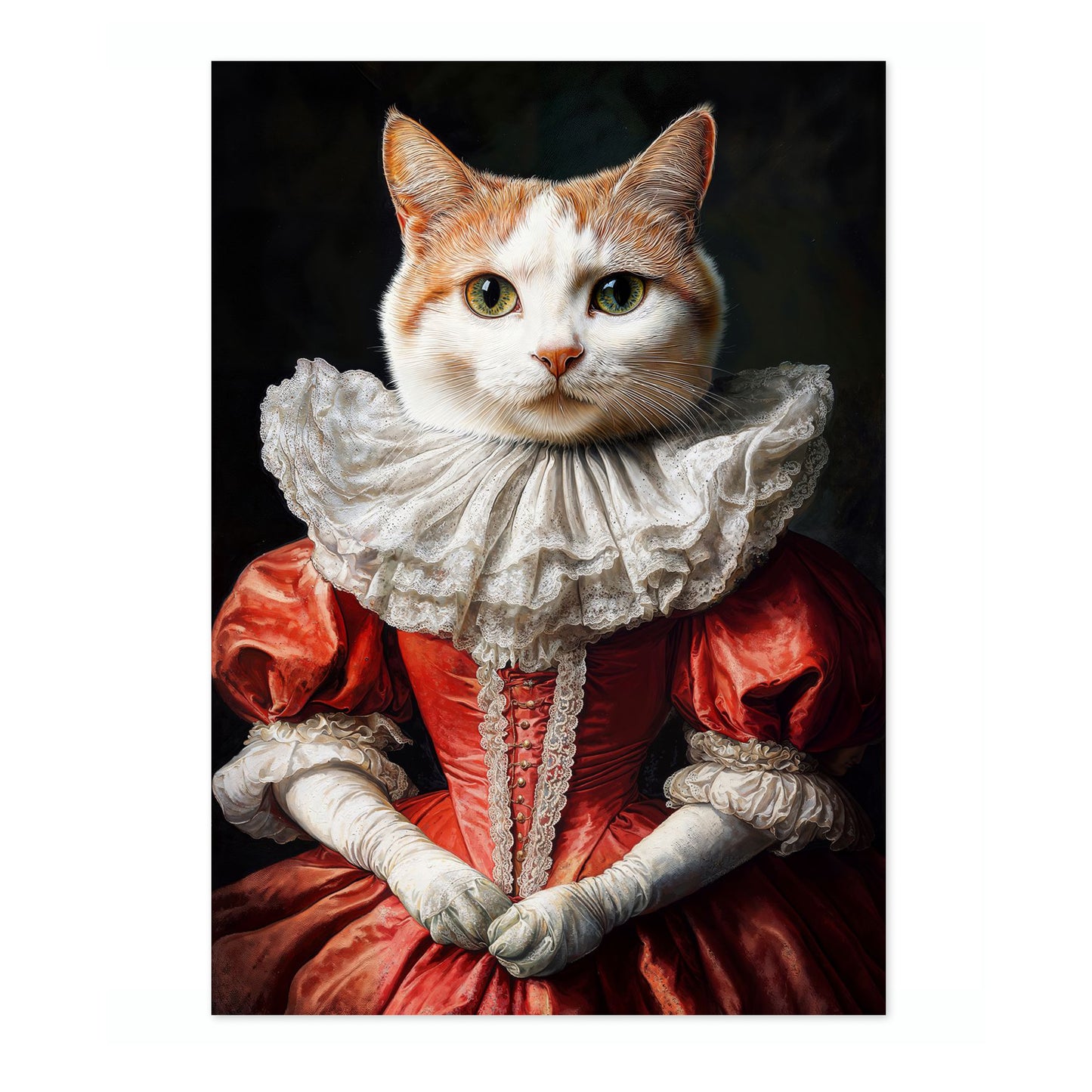 This whimsical poster features a poised cat in opulent Tudor attire, complete with a lacy ruff and exaggerated sleeves. The feline's gentle expression contrasts with the elegance of its costume, creating a humorous yet sophisticated historical-themed artwork. Ideal for cat lovers and enthusiasts of vintage aesthetics, this illustration melds nature and grandeur seamlessly.