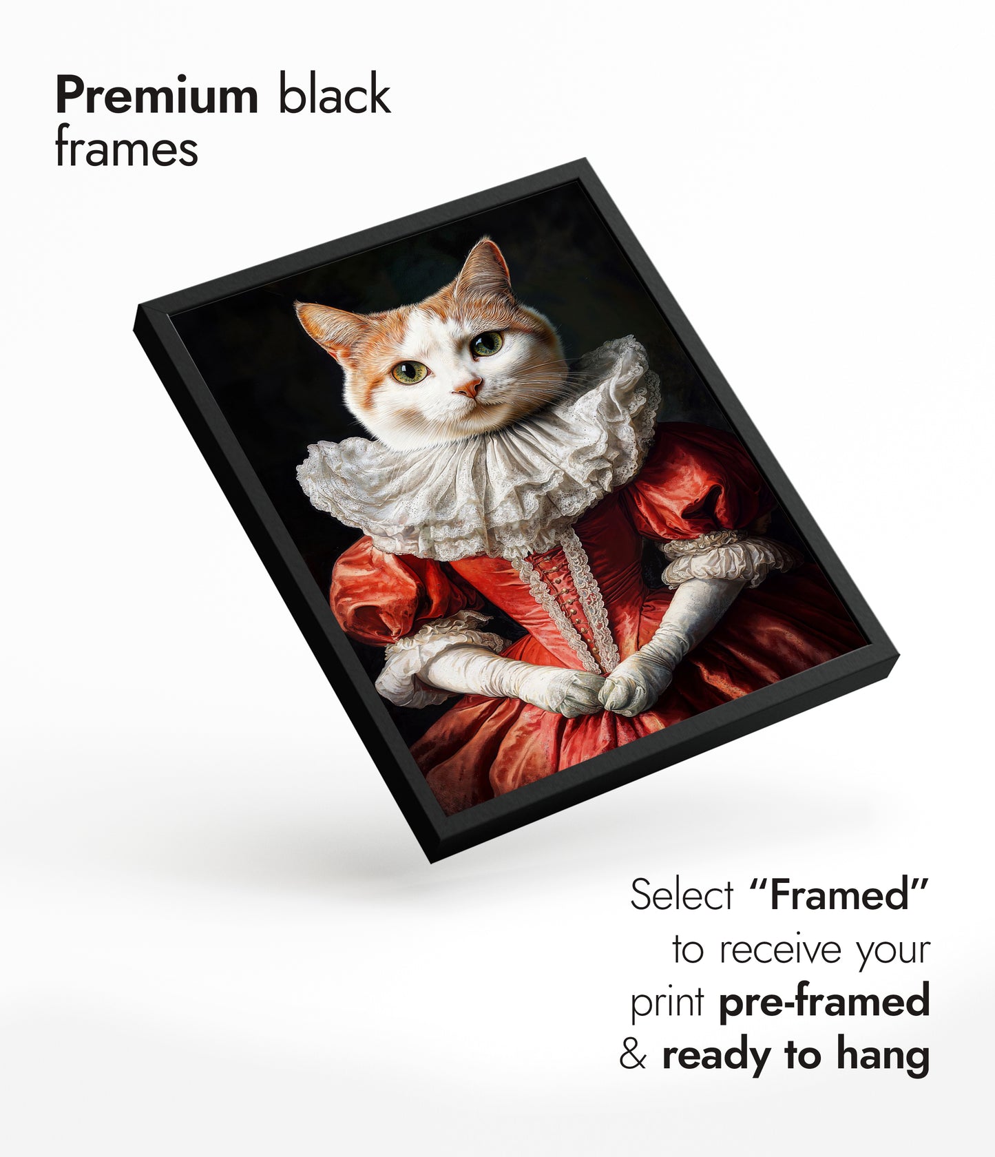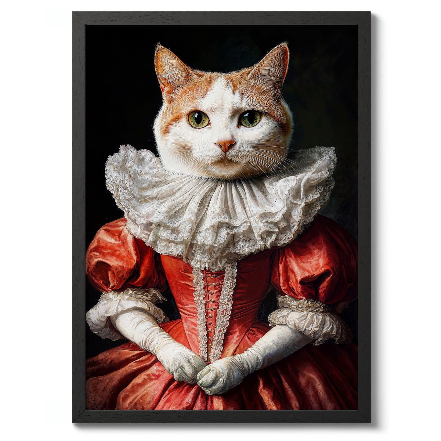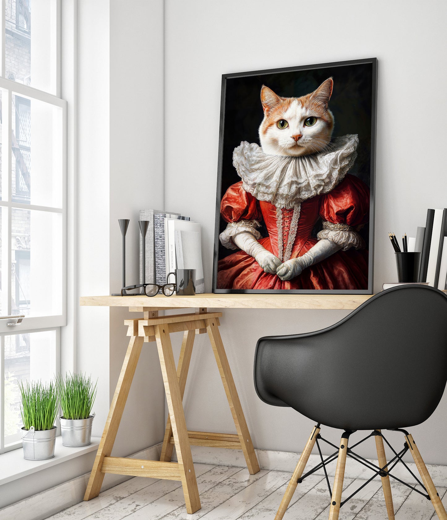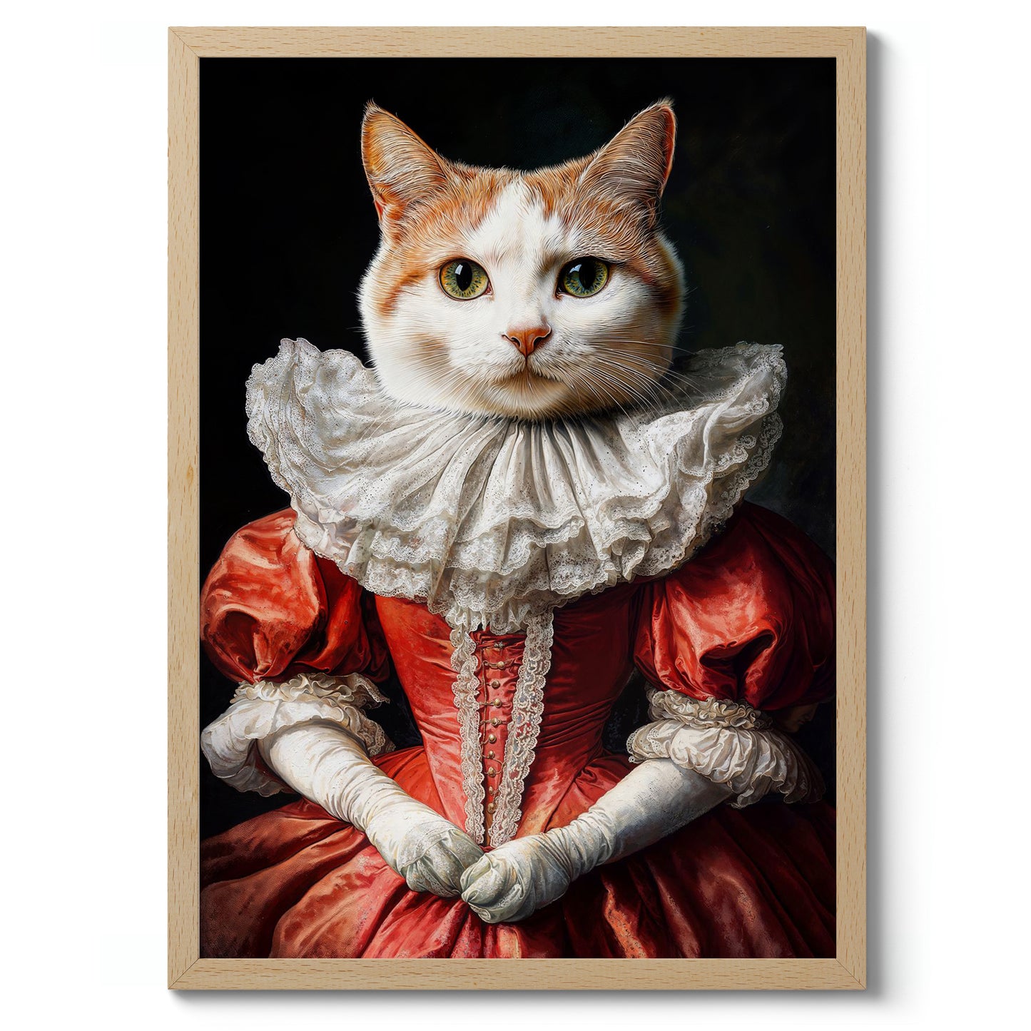 This whimsical poster features a poised cat in opulent Tudor attire, complete with a lacy ruff and exaggerated sleeves. The feline's gentle expression contrasts with the elegance of its costume, creating a humorous yet sophisticated historical-themed artwork. Ideal for cat lovers and enthusiasts of vintage aesthetics, this illustration melds nature and grandeur seamlessly.