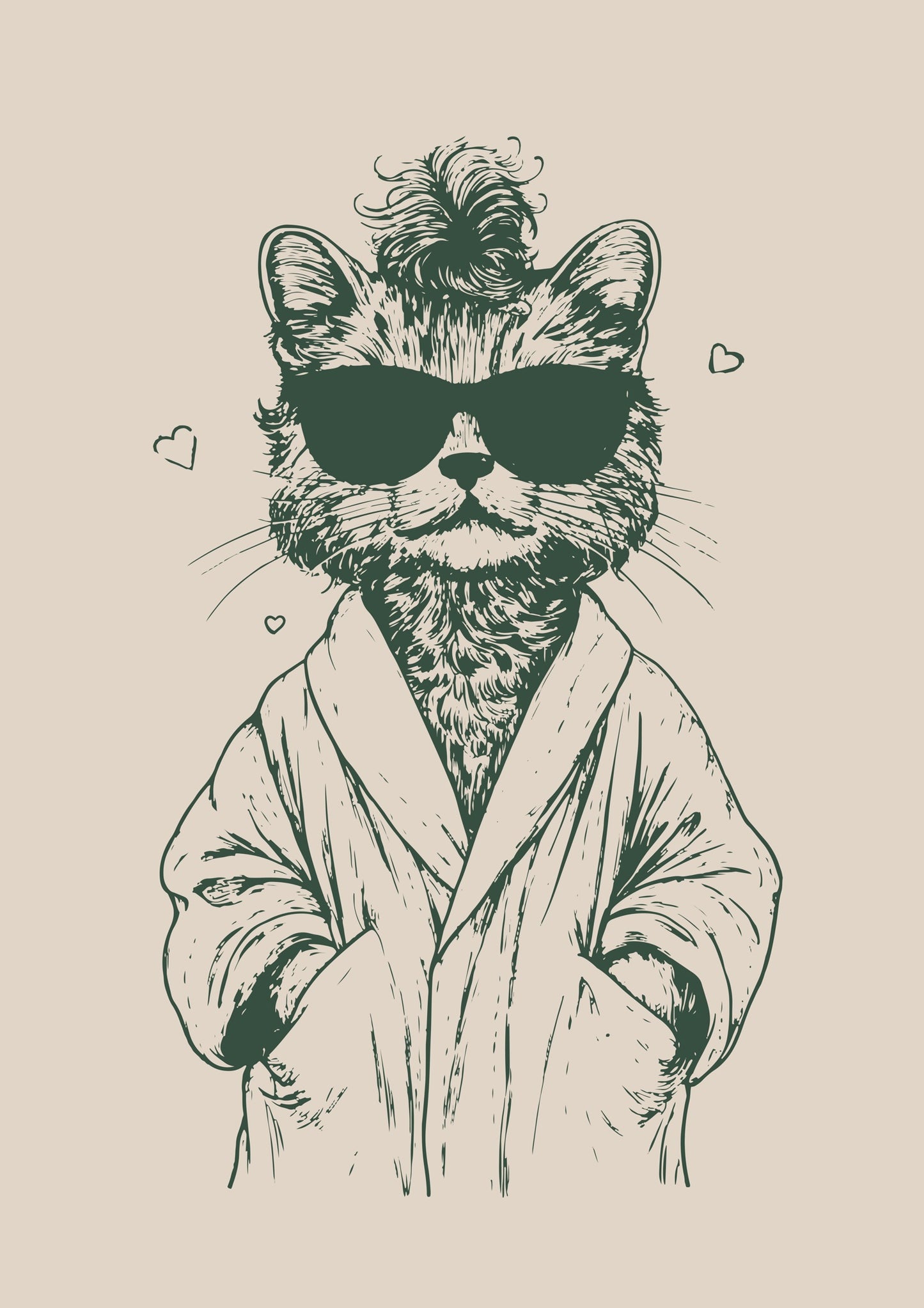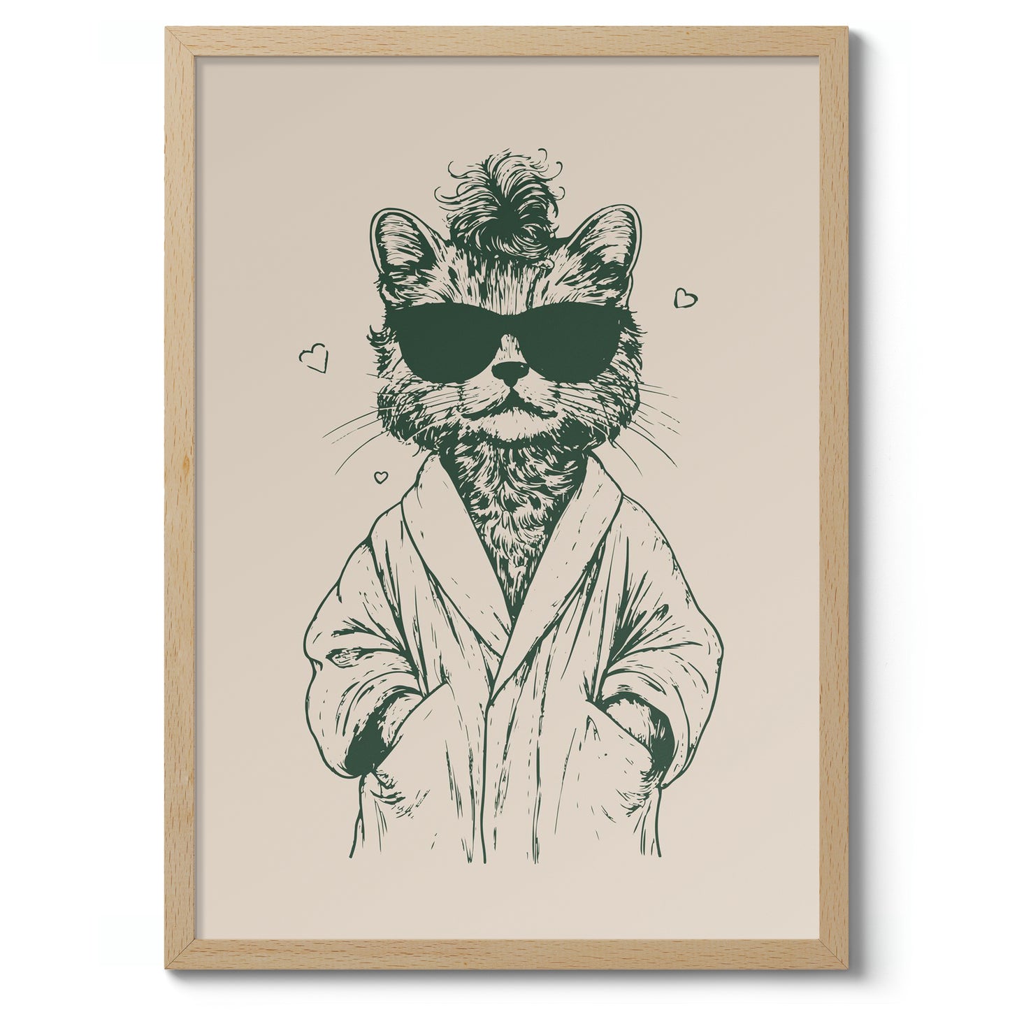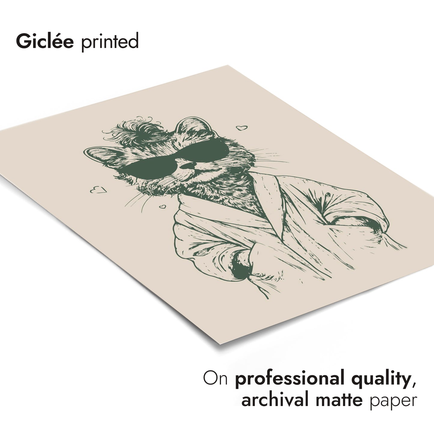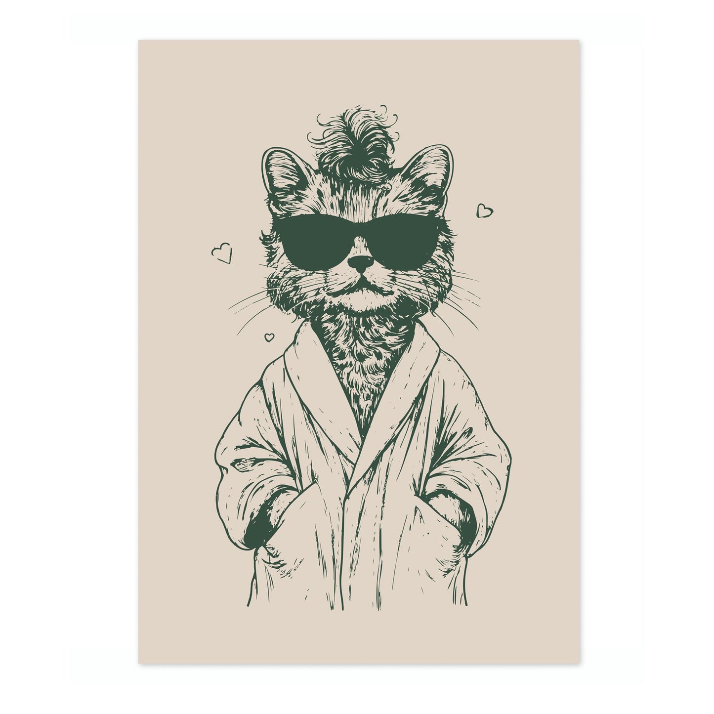 This playful poster features a stylish cat donning a bathrobe and sunglasses, exuding a whimsical charm. The line drawing captures intricate details and humorous undertones, set against a soft beige backdrop. Ideal for adding a pop of personality to your space, especially in areas with a bathroom theme. Perfect for cat enthusiasts and those who appreciate quirky art.