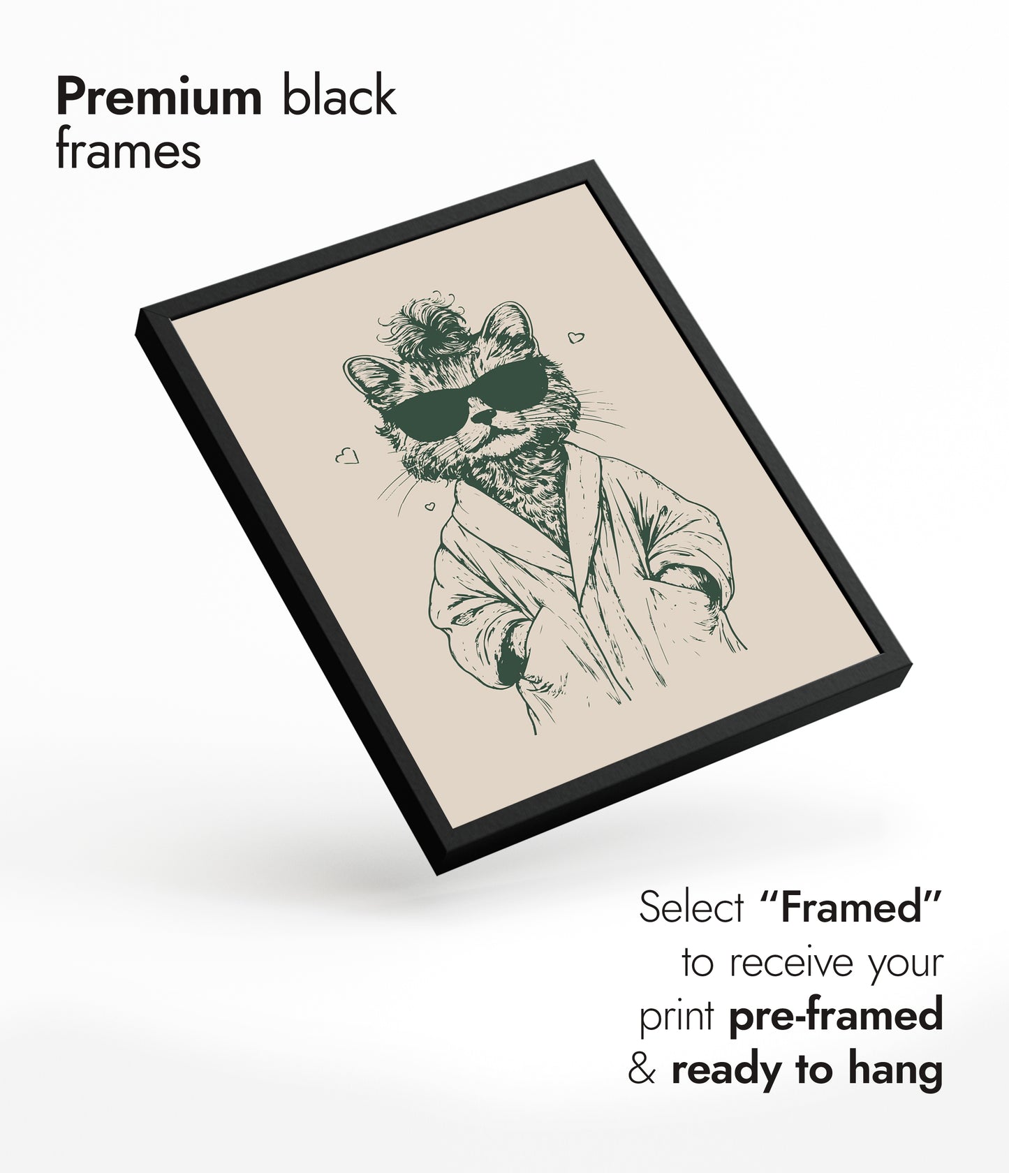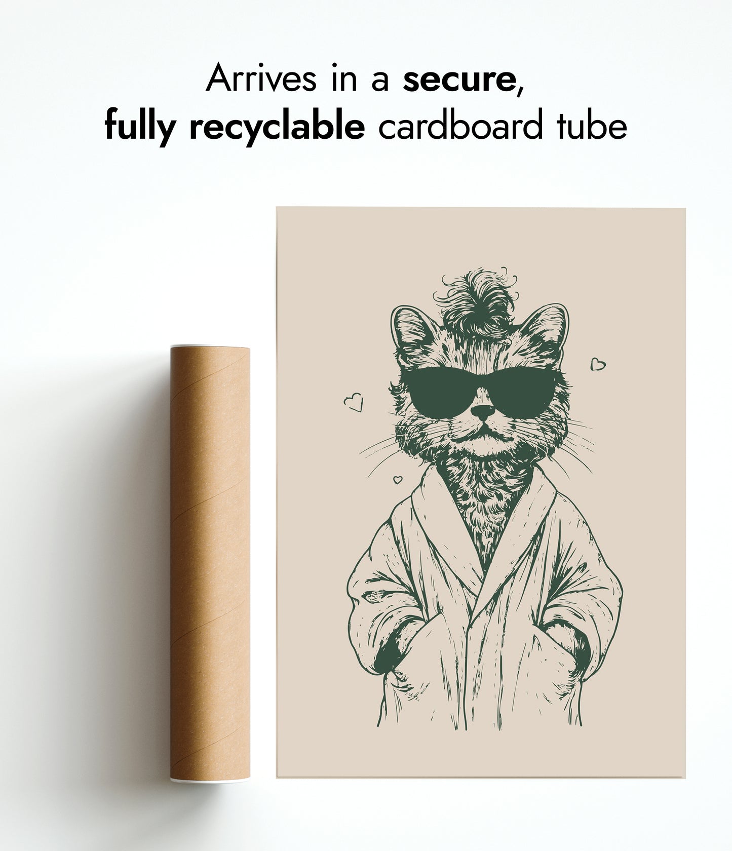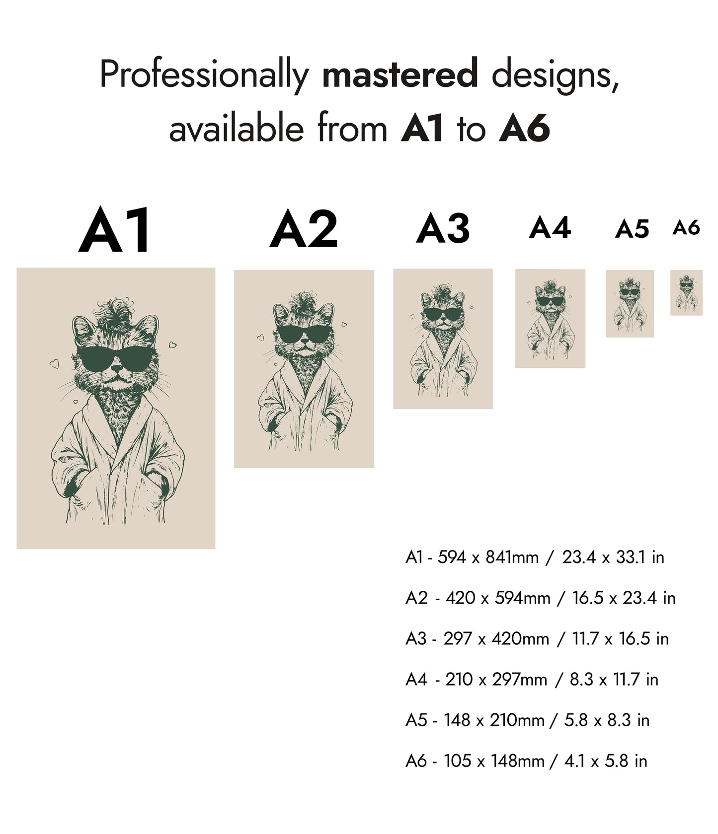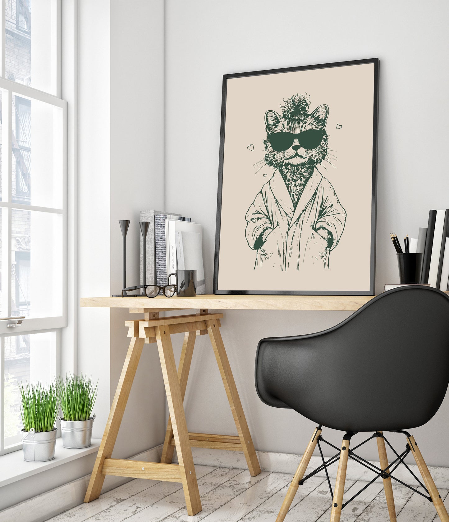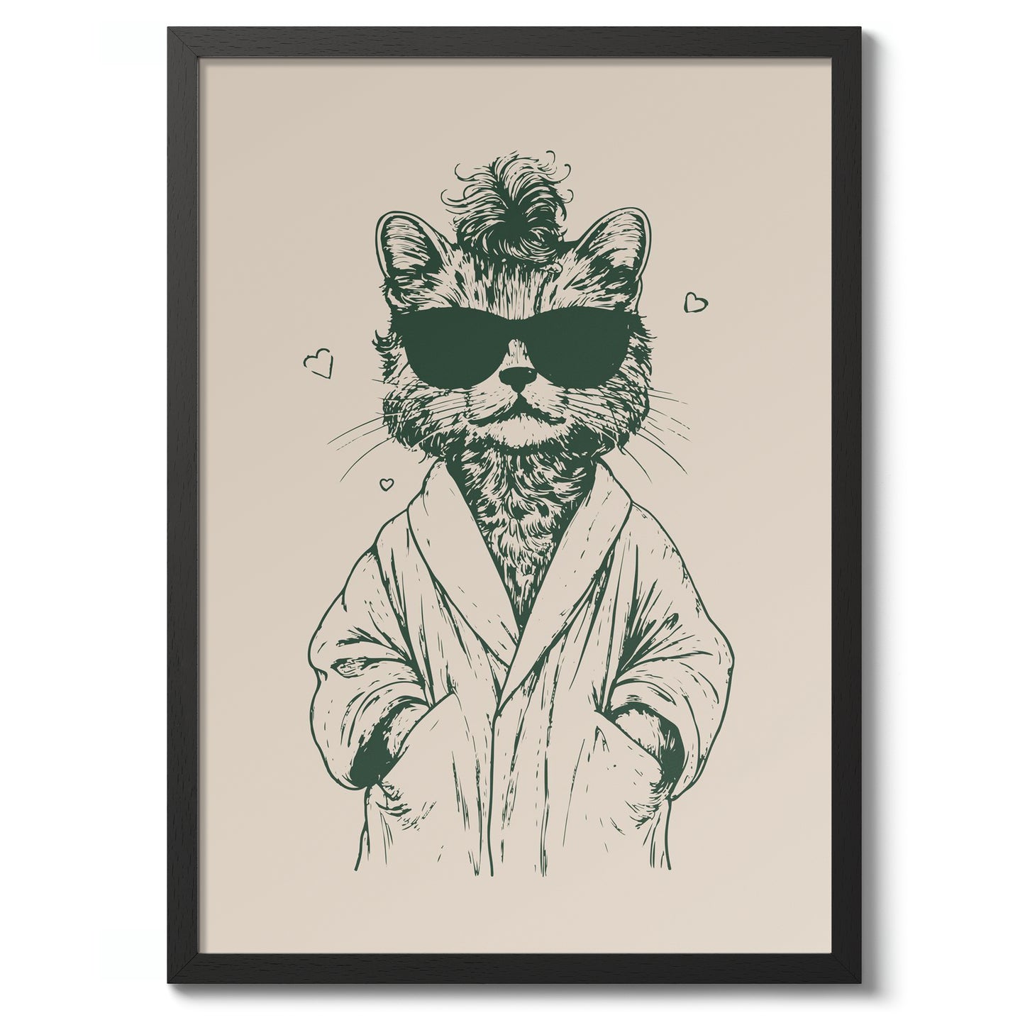This playful poster features a stylish cat donning a bathrobe and sunglasses, exuding a whimsical charm. The line drawing captures intricate details and humorous undertones, set against a soft beige backdrop. Ideal for adding a pop of personality to your space, especially in areas with a bathroom theme. Perfect for cat enthusiasts and those who appreciate quirky art.