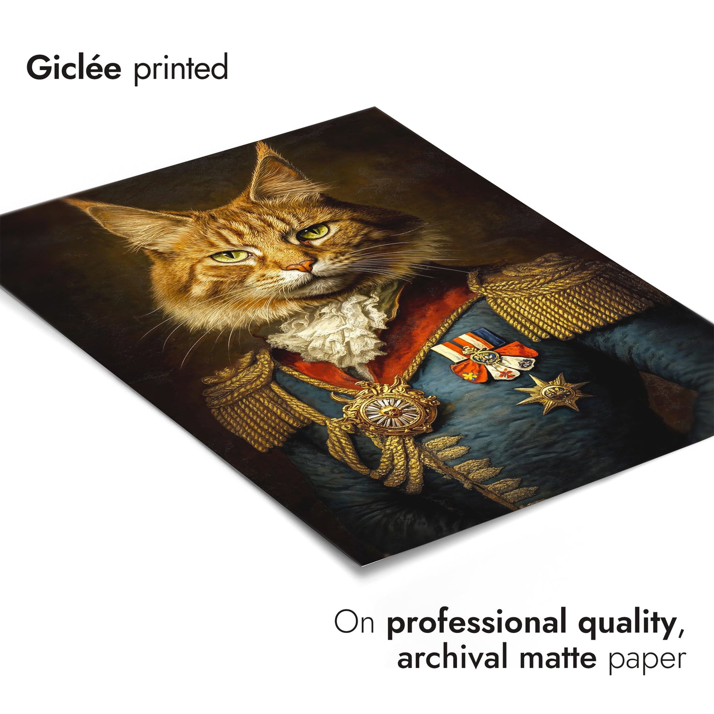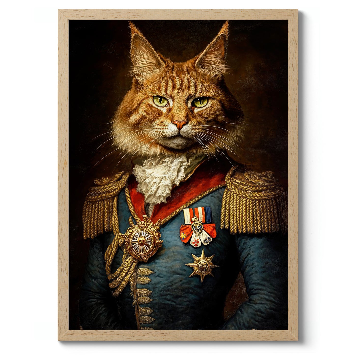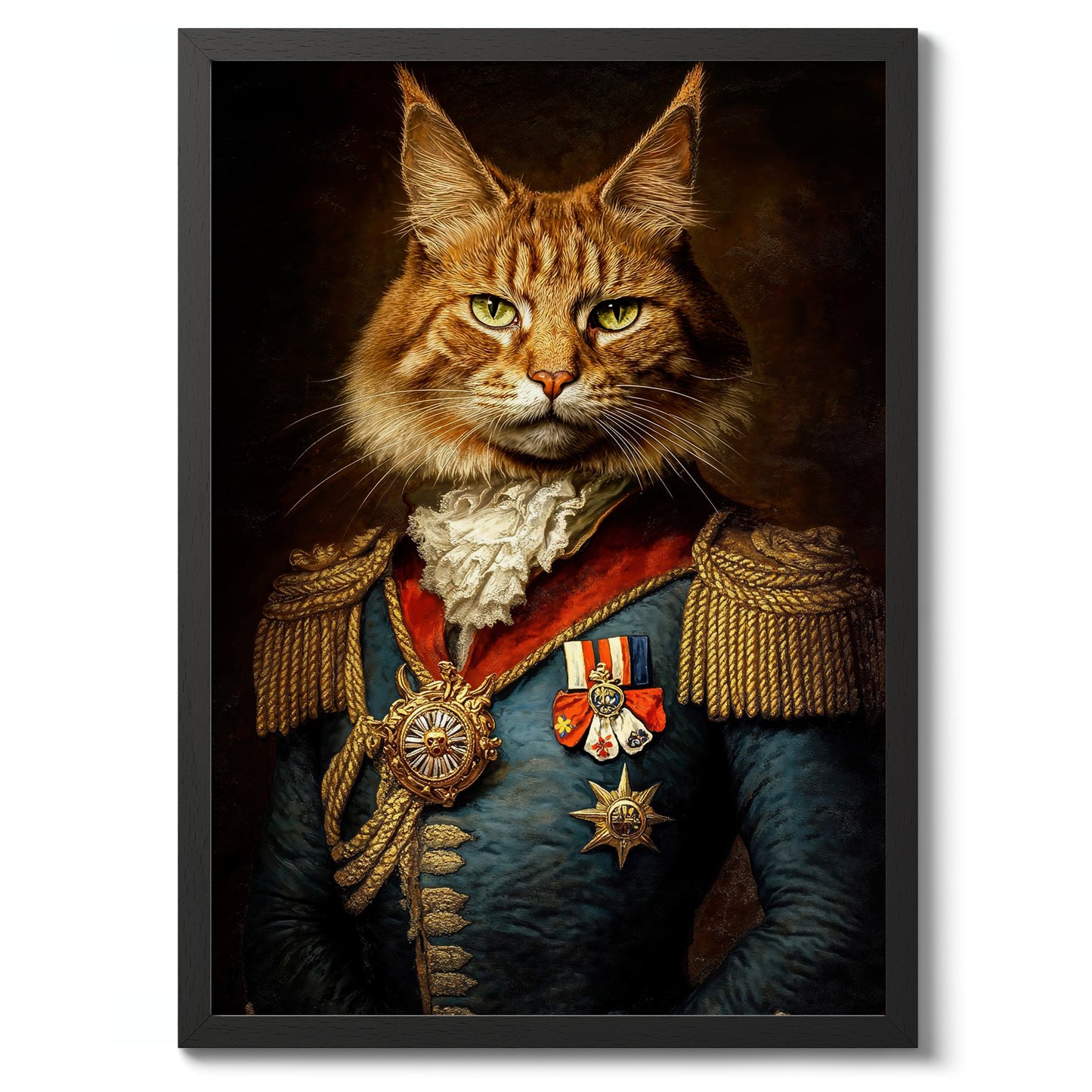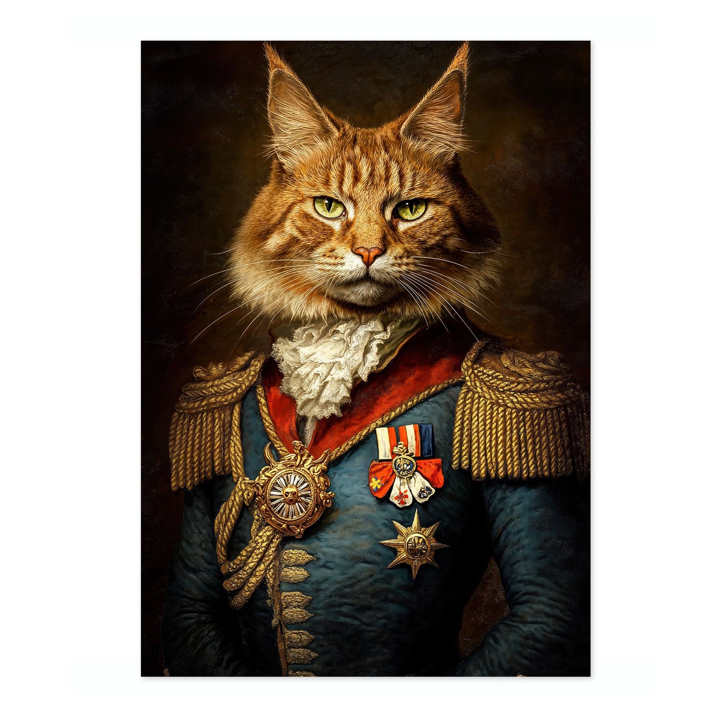 This "Cat General" poster showcases a regal feline dressed in ornate military attire, complete with medals and epaulets, against a dark, textured background. The illustration blends elements of humor and historic elegance, capturing the essence of a vintage painting. Ideal for animal and history enthusiasts, this striking piece adds a whimsical touch to any space.