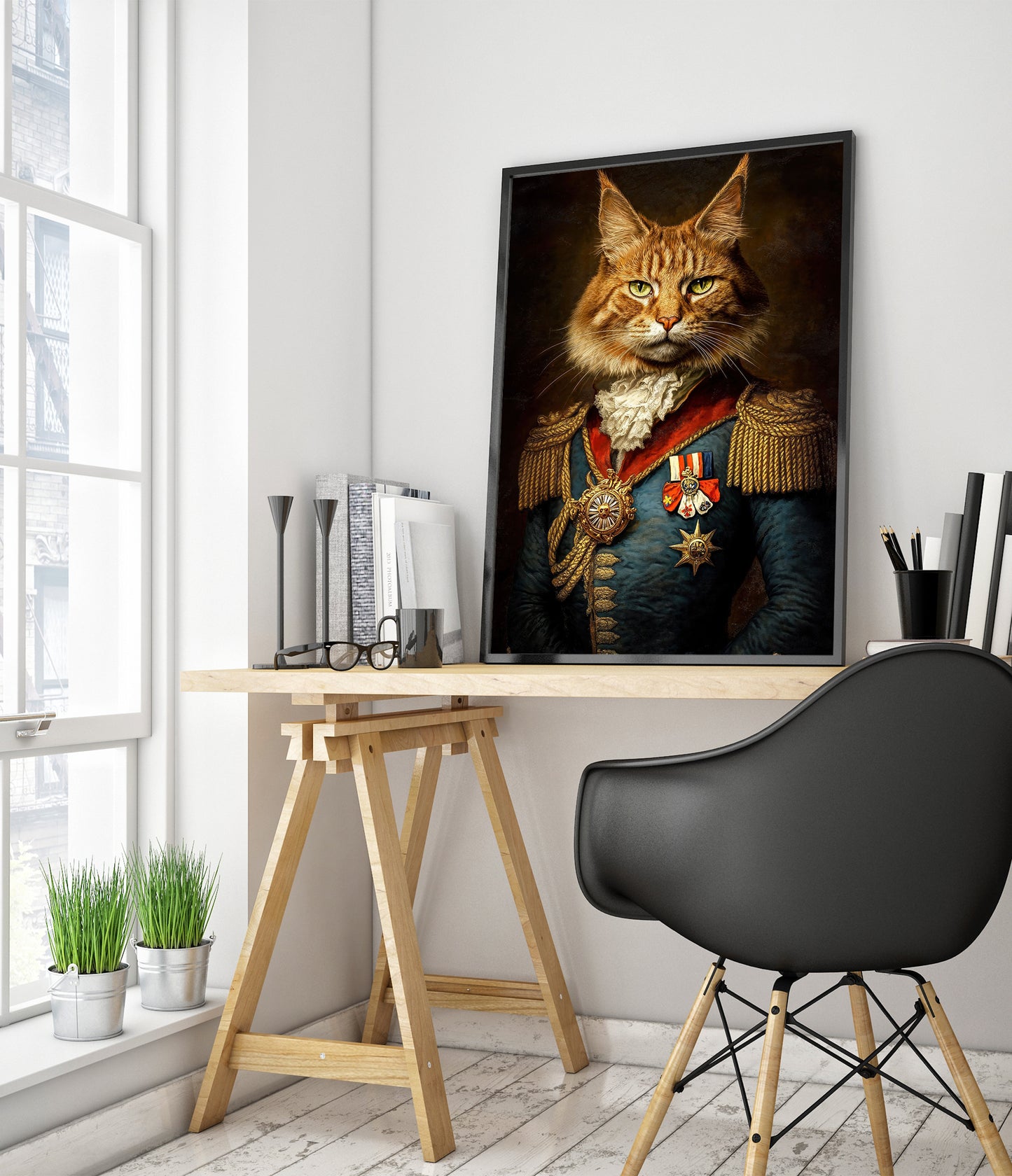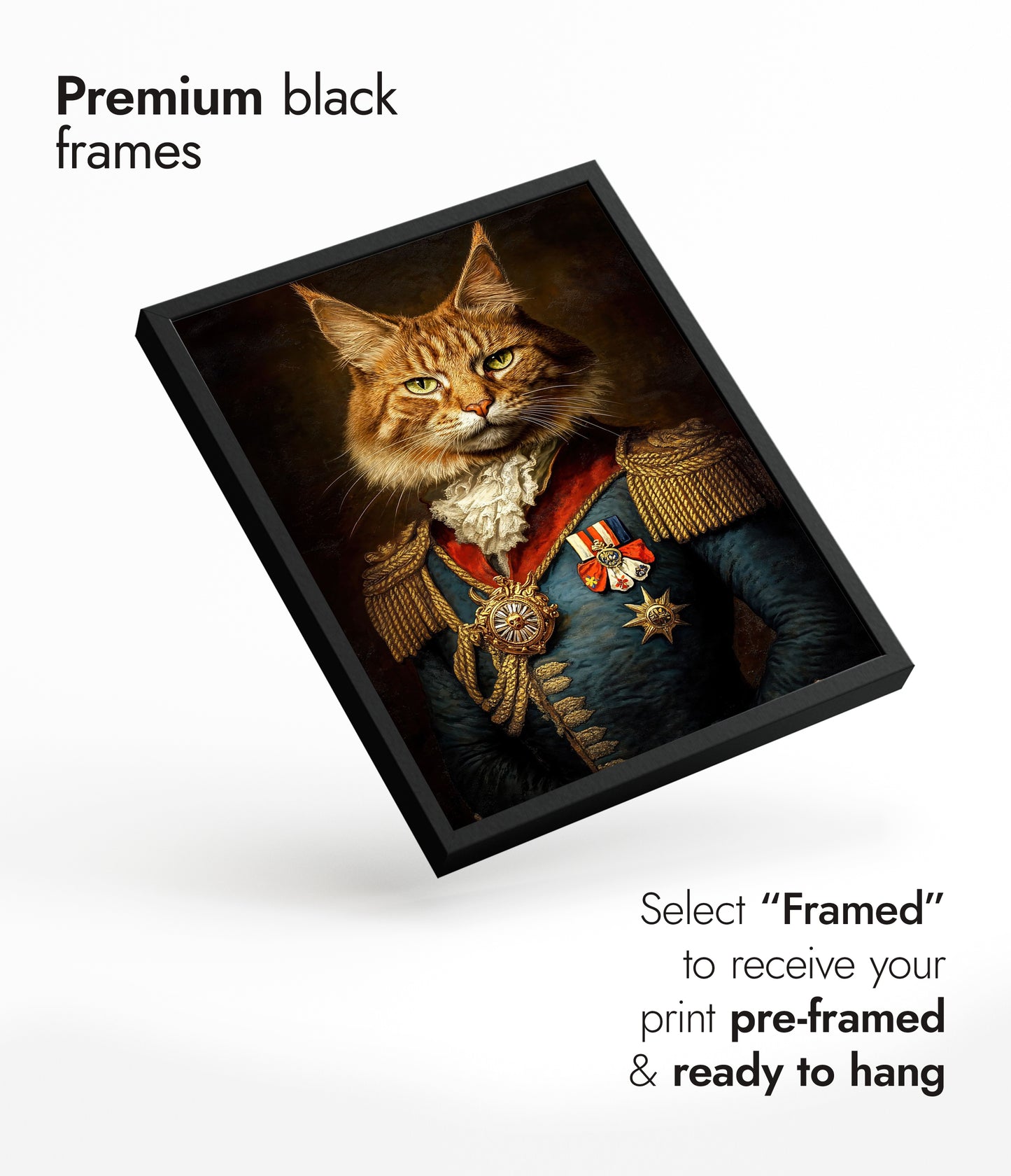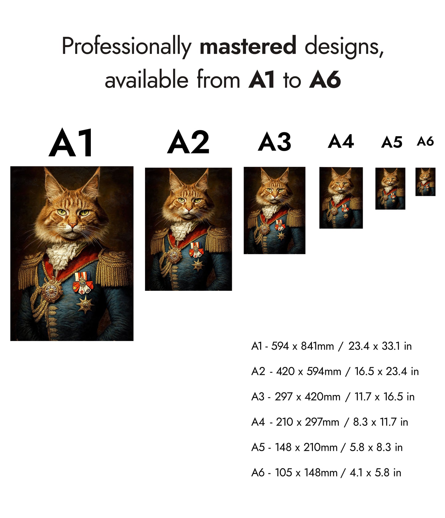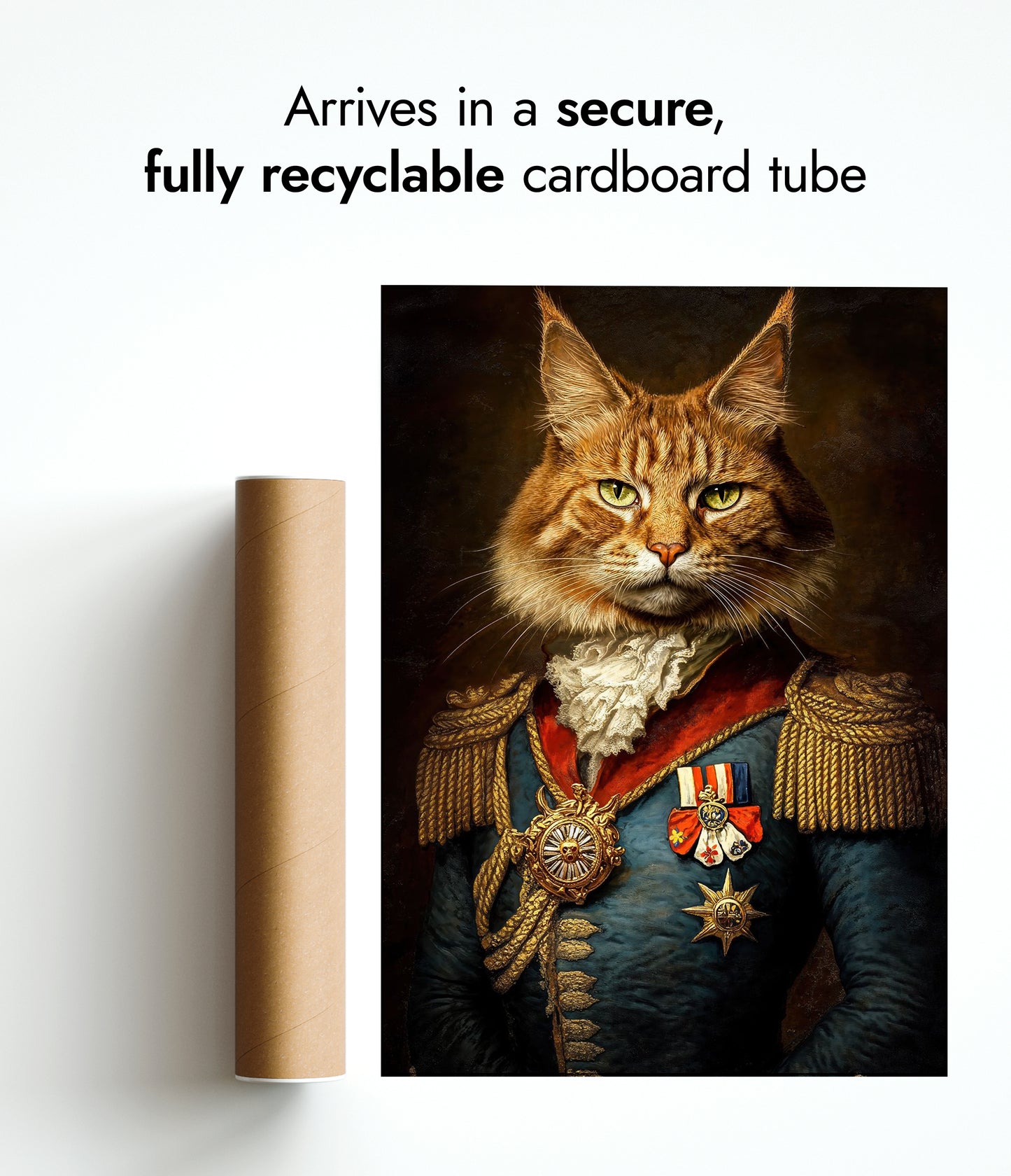 This "Cat General" poster showcases a regal feline dressed in ornate military attire, complete with medals and epaulets, against a dark, textured background. The illustration blends elements of humor and historic elegance, capturing the essence of a vintage painting. Ideal for animal and history enthusiasts, this striking piece adds a whimsical touch to any space.