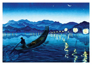 "Catching Whitebait at Nakaumi" by Oda Kazuma depicts a serene night scene with a lone fisherman on a boat under a crescent moon. The tranquil lake reflects lantern lights, while distant mountains enhance the peaceful ambiance. This traditional Japanese woodblock illustration captures the nocturnal beauty of Nakaumi, making it a captivating poster for any art enthusiast.