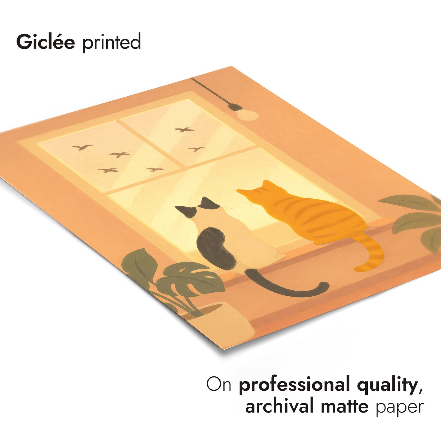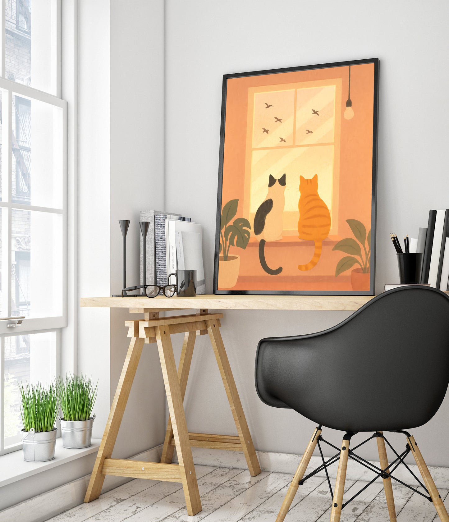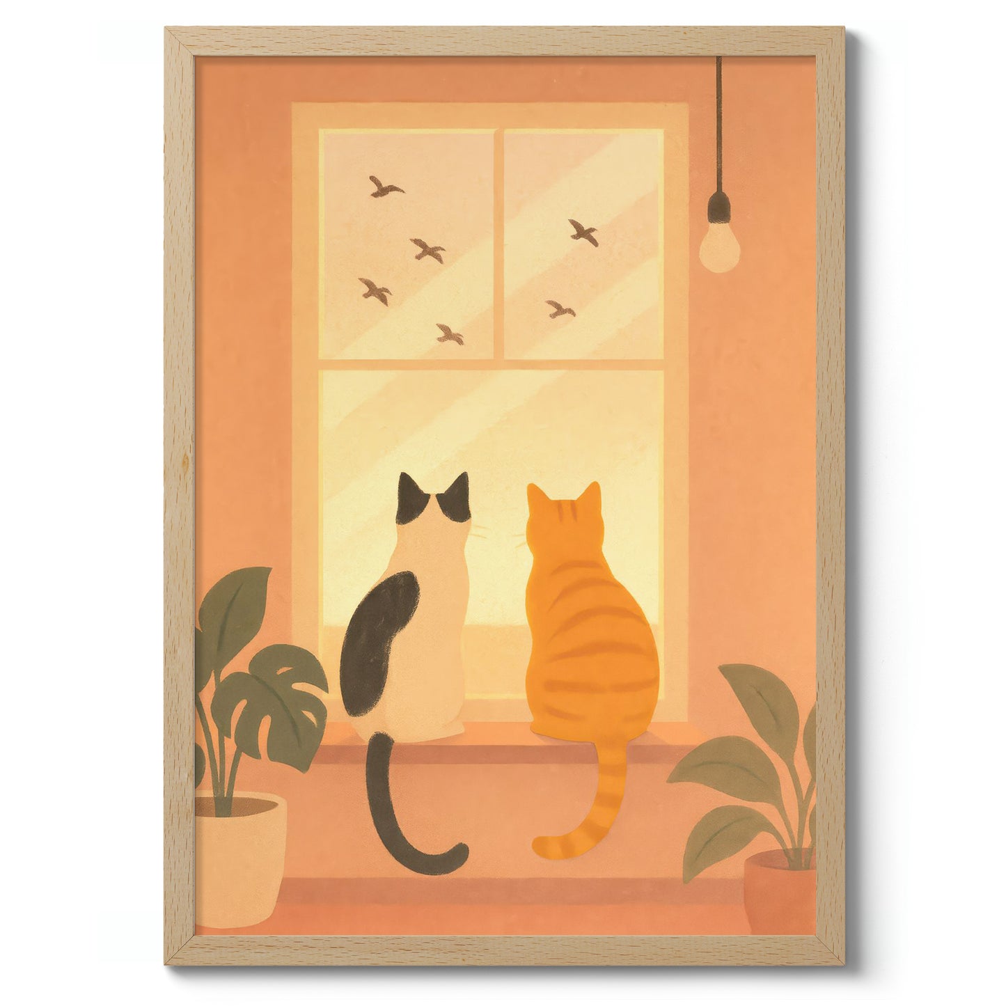 This art print titled "Cats Windowsill" features two serene cats gazing out a sunlit window, captivated by birds in the distance. The cozy illustration boasts warm orange hues and subtle boho influences, making it ideal as a bathroom or nature-themed poster. Complemented by lush greenery, this tranquil scene perfectly captures a moment of feline fascination.