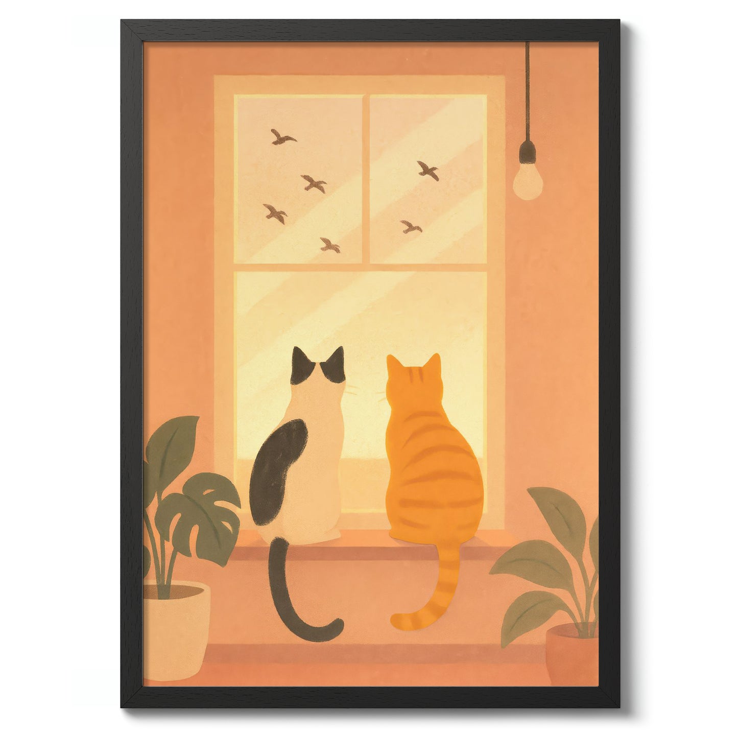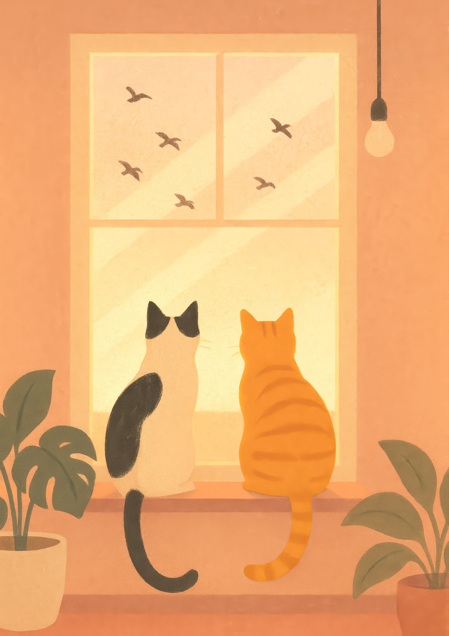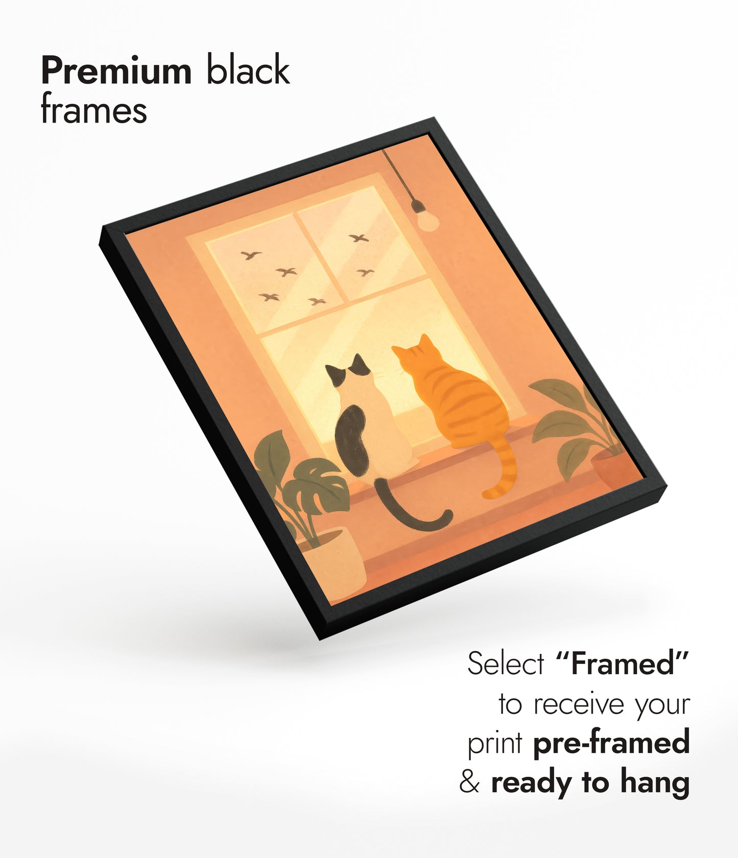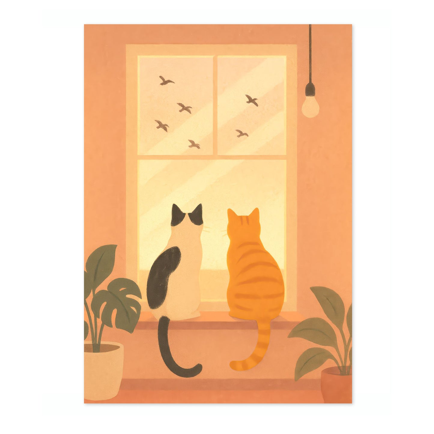 This art print titled "Cats Windowsill" features two serene cats gazing out a sunlit window, captivated by birds in the distance. The cozy illustration boasts warm orange hues and subtle boho influences, making it ideal as a bathroom or nature-themed poster. Complemented by lush greenery, this tranquil scene perfectly captures a moment of feline fascination.