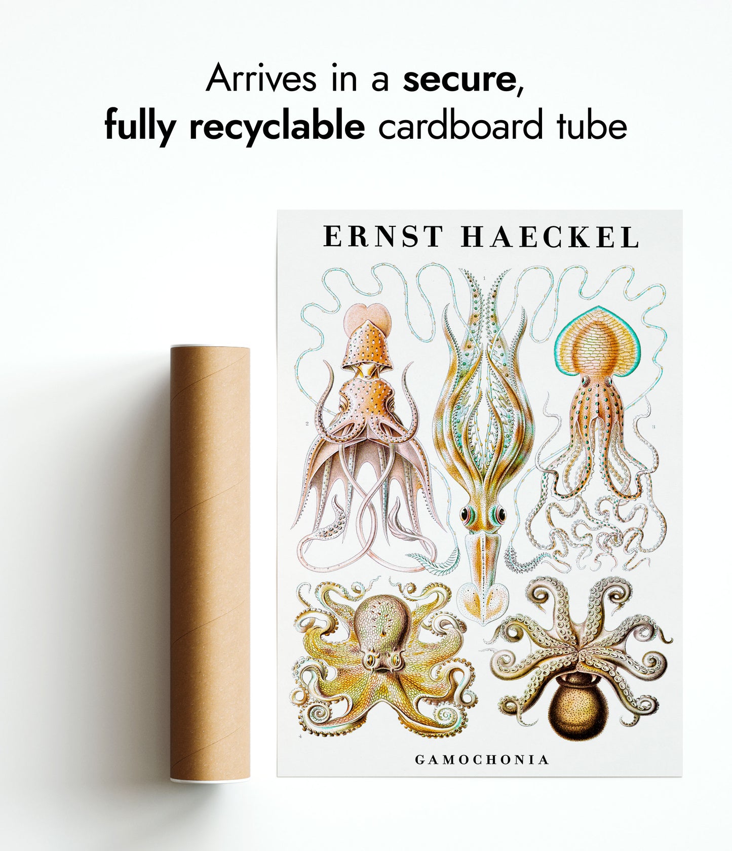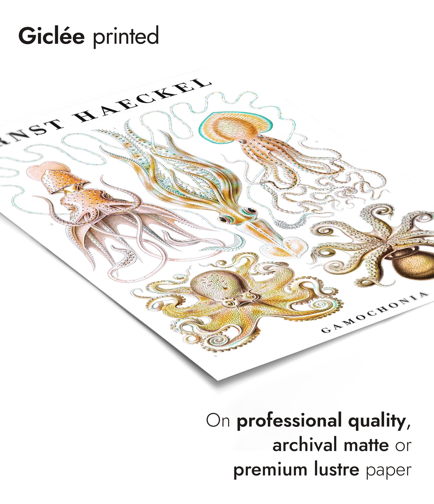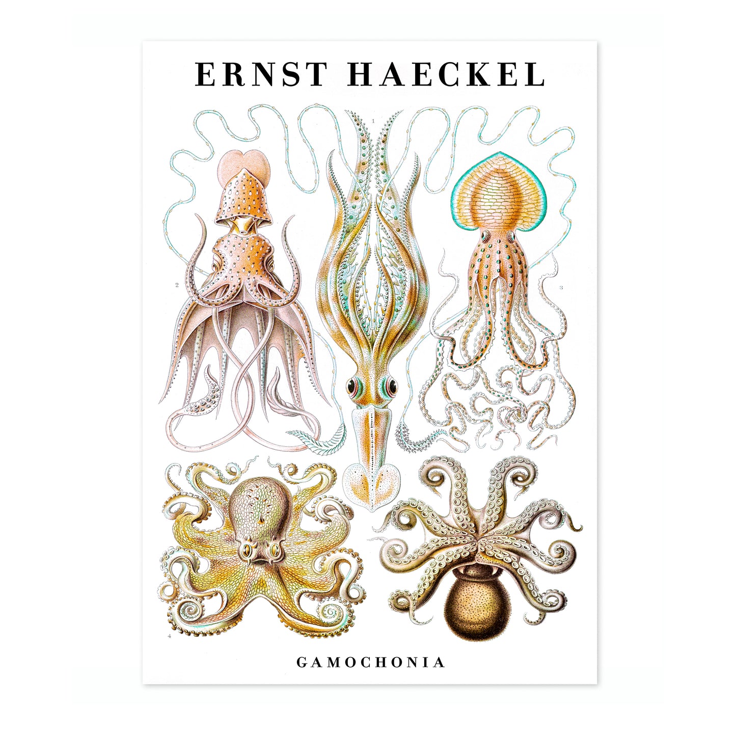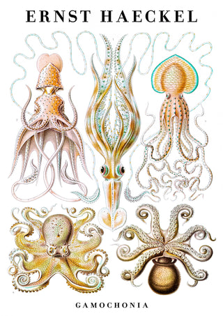 This vintage poster showcases Ernst Haeckel's intricate illustrations of cephalopods, including squid and octopus. The detailed portrayal highlights the diverse forms and beauty of these sea creatures against a white backdrop. Ideal for zoology enthusiasts and art lovers, this nature-themed portrait captures the essence of marine life through scientific artistry. Perfect for adding a touch of vintage elegance to any space.
