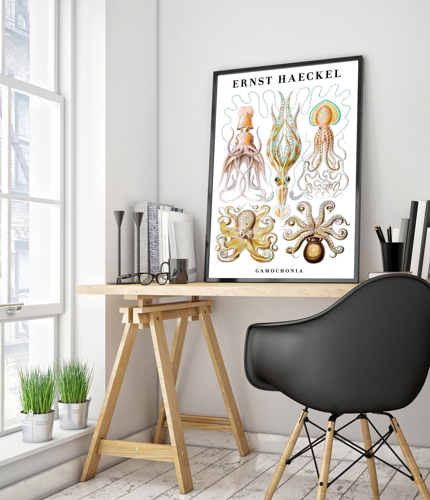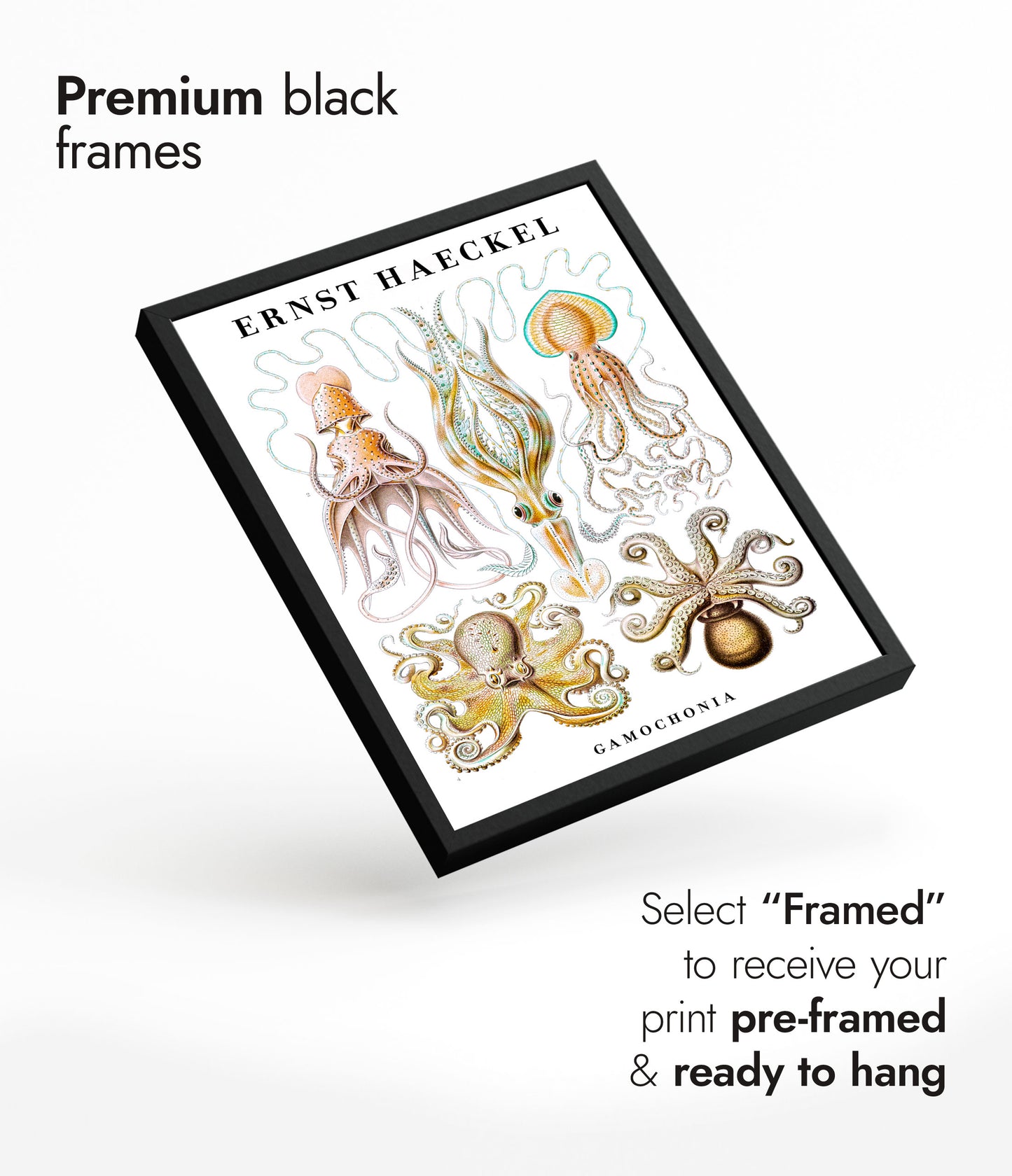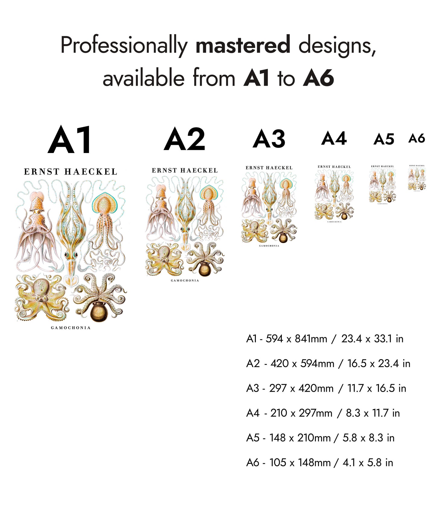 This vintage poster showcases Ernst Haeckel's intricate illustrations of cephalopods, including squid and octopus. The detailed portrayal highlights the diverse forms and beauty of these sea creatures against a white backdrop. Ideal for zoology enthusiasts and art lovers, this nature-themed portrait captures the essence of marine life through scientific artistry. Perfect for adding a touch of vintage elegance to any space.