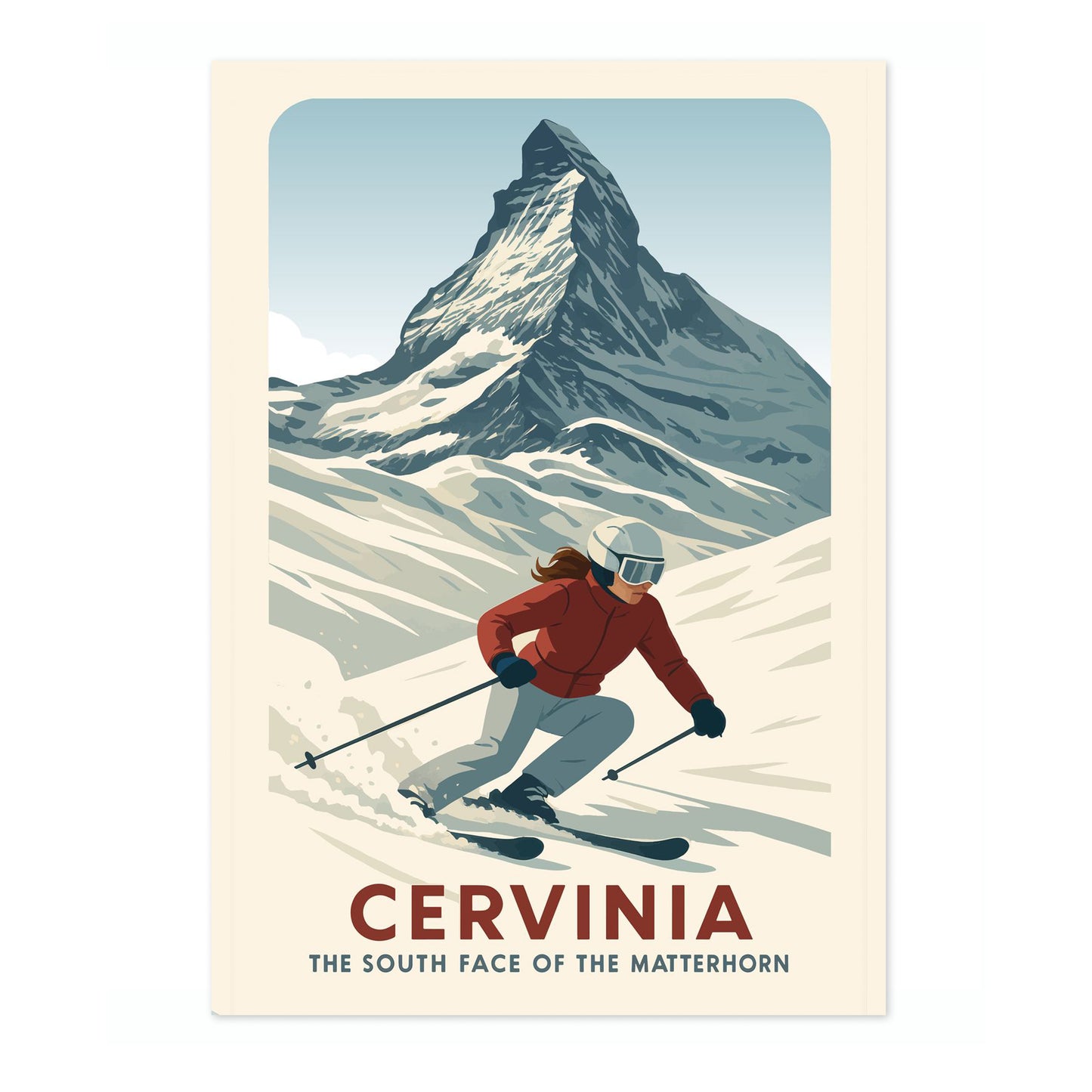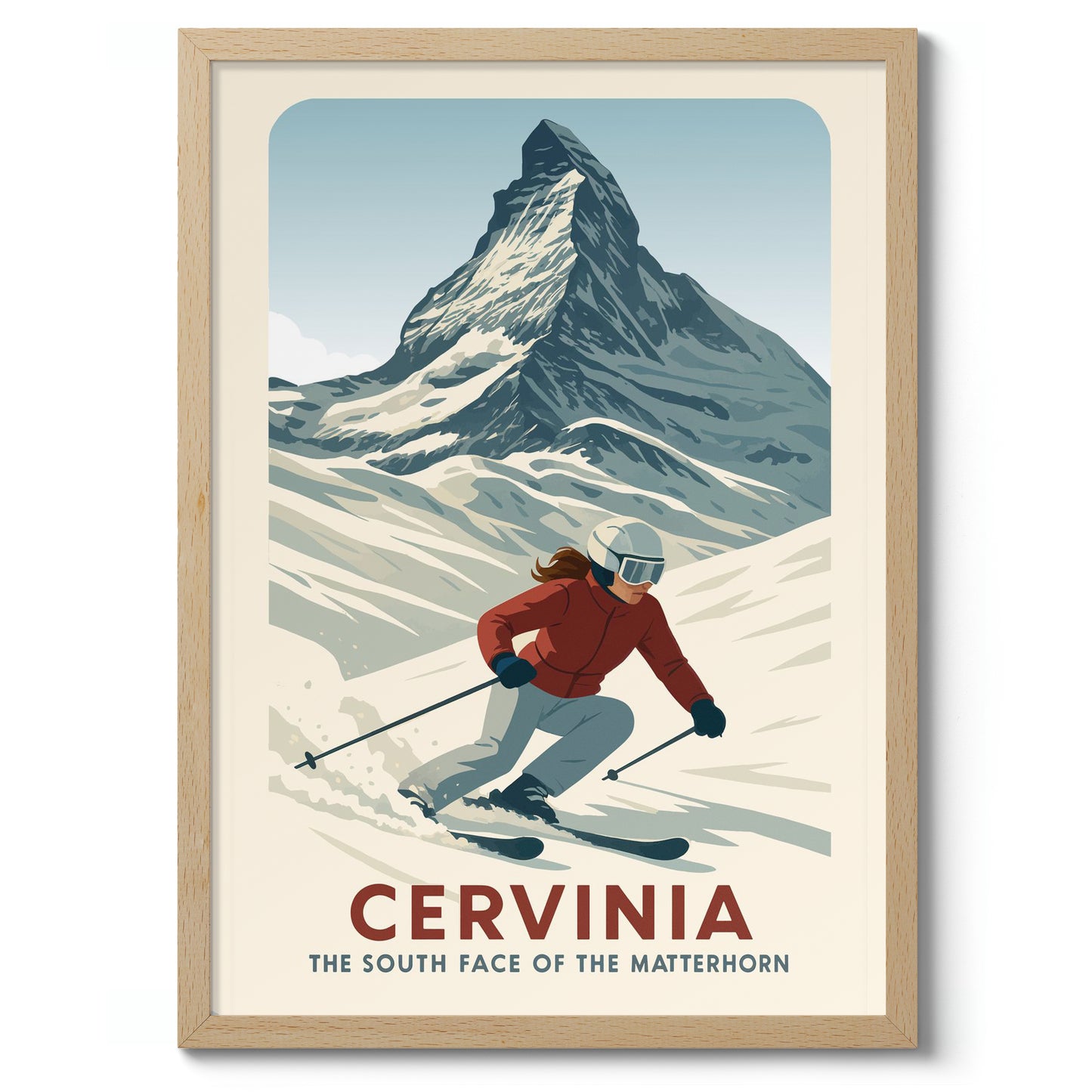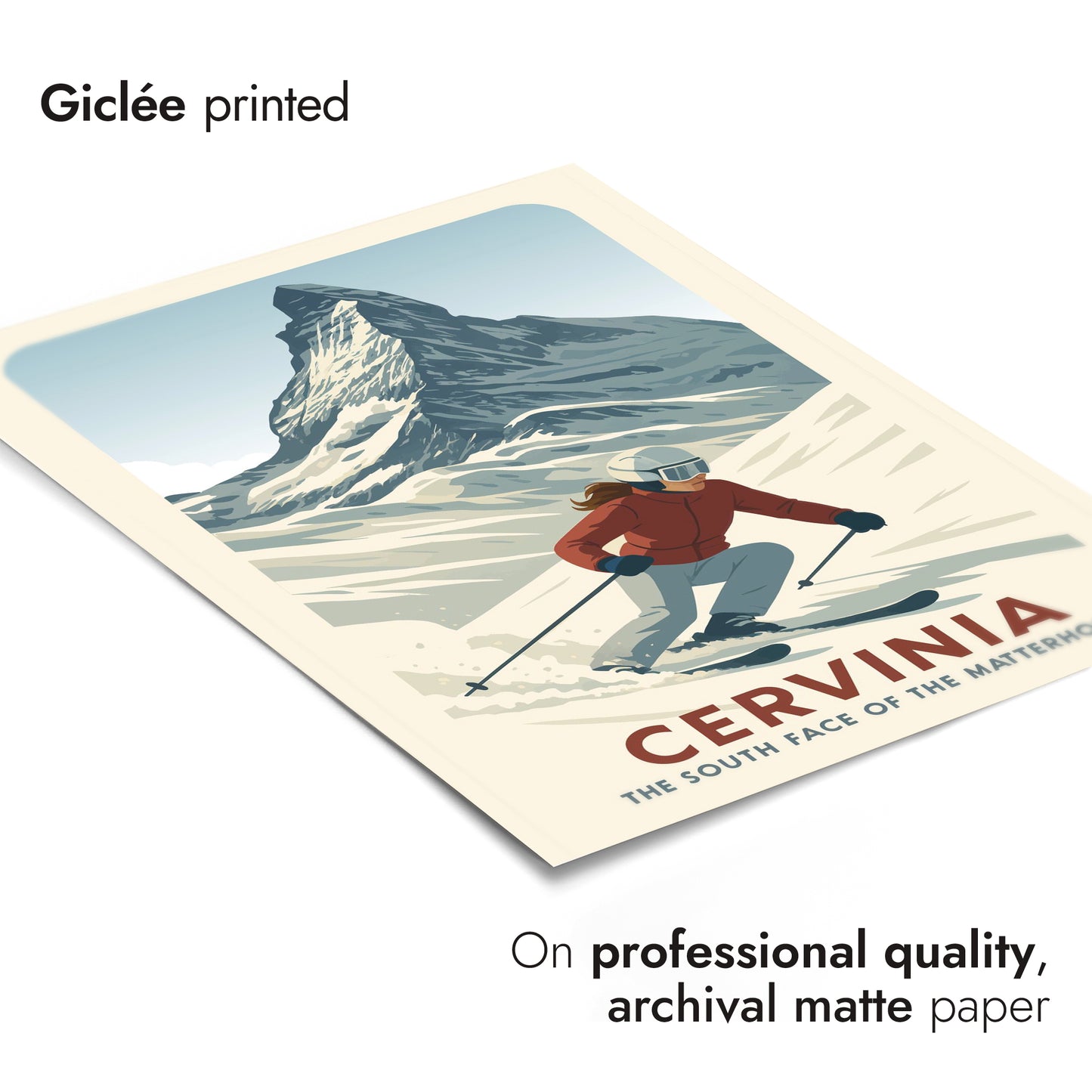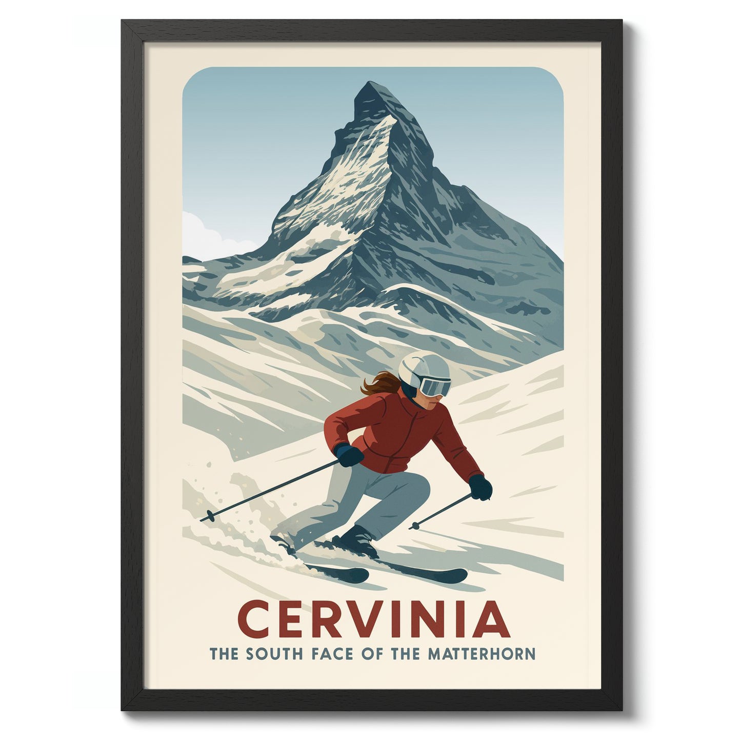 This vivid poster showcases a skier gliding down the snowy slopes with the majestic Matterhorn's south face looming grandly in Cervinia, Italy. The dynamic graphic style captures the exhilaration of skiing against the dramatic Alpine backdrop, highlighting the blend of adventure and natural beauty. Ideal for those drawn to Italian ski resorts and alpine landscapes.