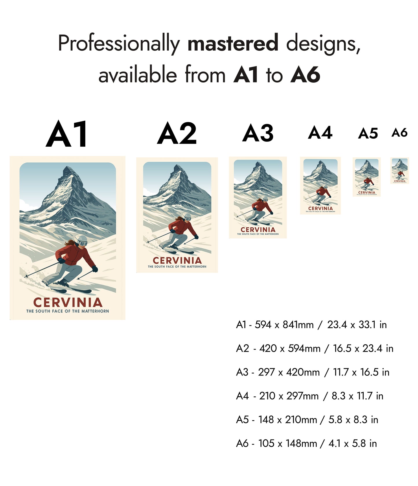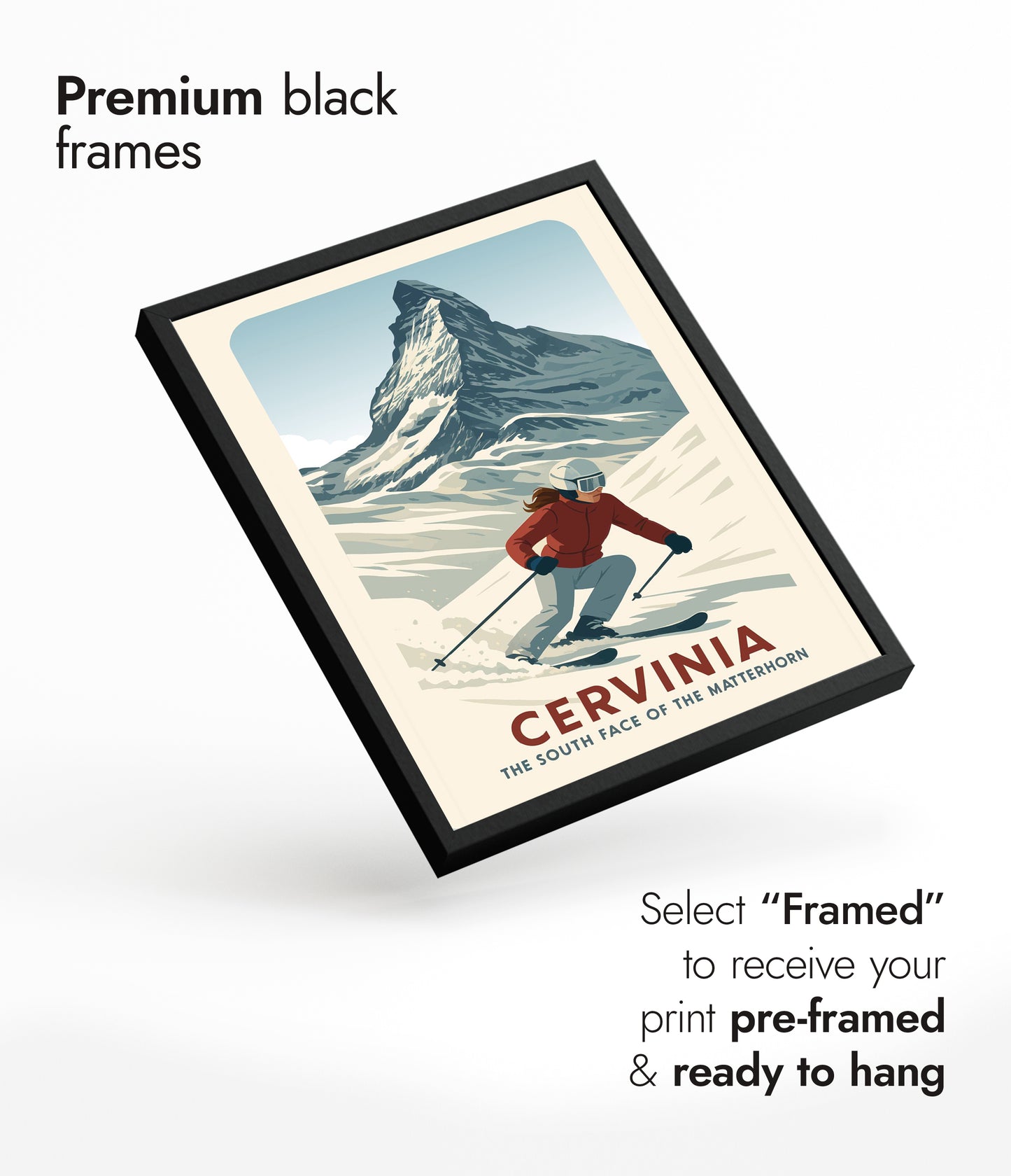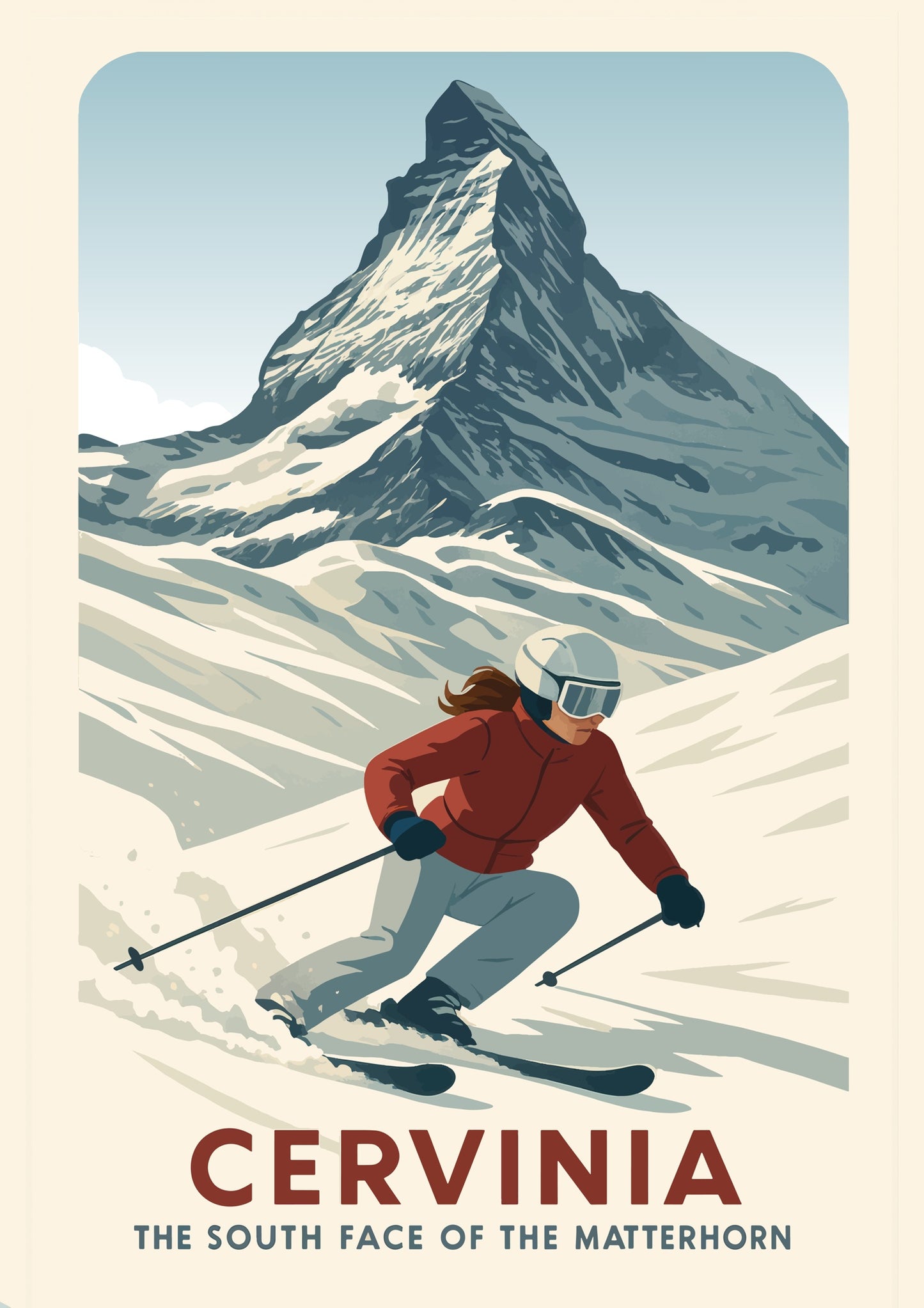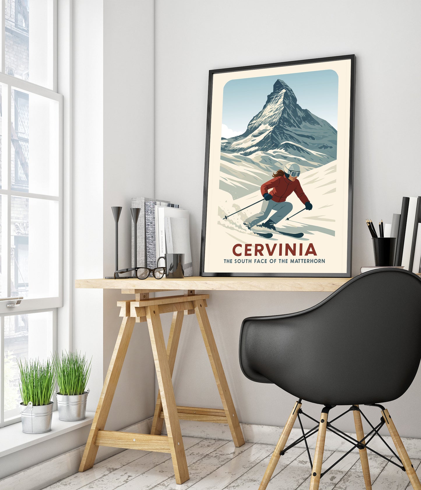 This vivid poster showcases a skier gliding down the snowy slopes with the majestic Matterhorn's south face looming grandly in Cervinia, Italy. The dynamic graphic style captures the exhilaration of skiing against the dramatic Alpine backdrop, highlighting the blend of adventure and natural beauty. Ideal for those drawn to Italian ski resorts and alpine landscapes.