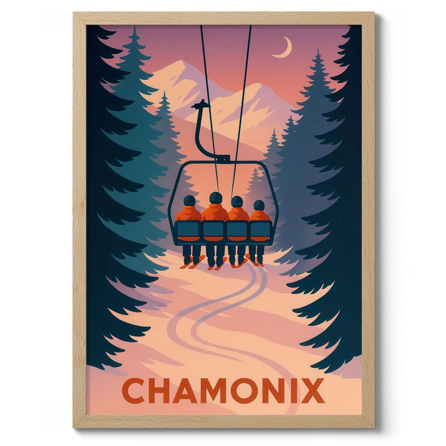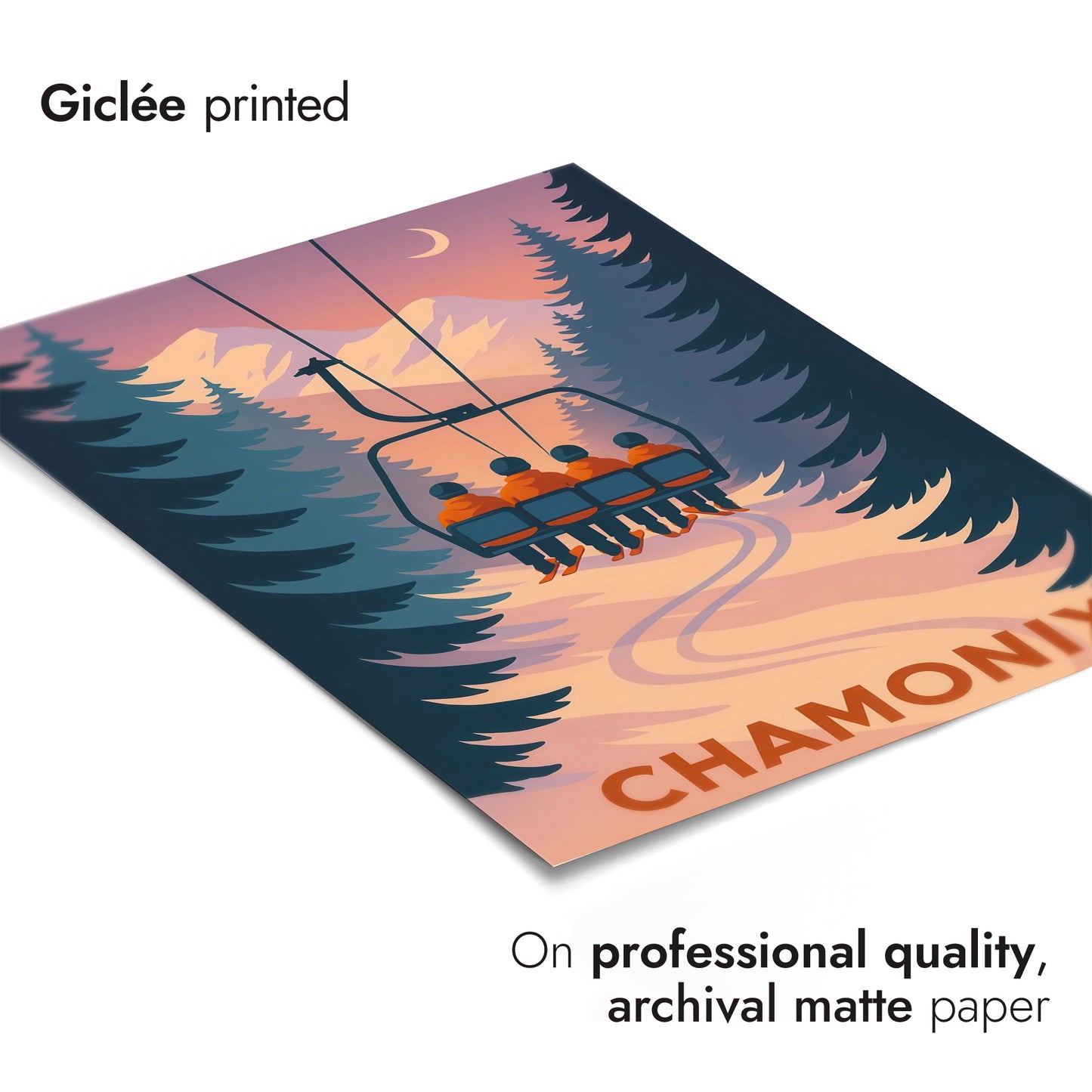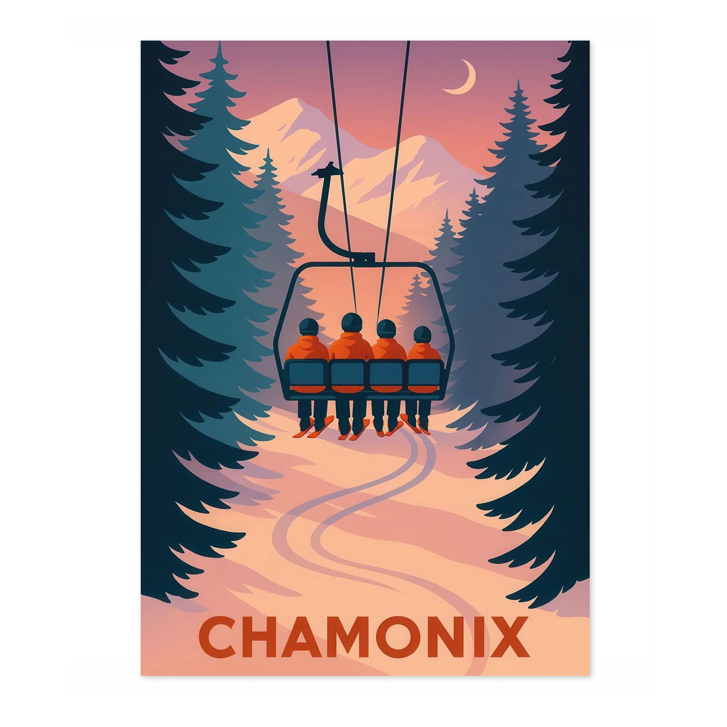 This Chamonix travel poster captures a serene alpine scene, featuring a cable car with four silhouetted figures ascending through a snow-kissed forest. With a pastel pink glow illuminating the distant mountains and a crescent moon adorning the twilight sky, this graphic illustration evokes the tranquil beauty of winter sports in a renowned alpine destination. Perfect for ski and snow enthusiasts.