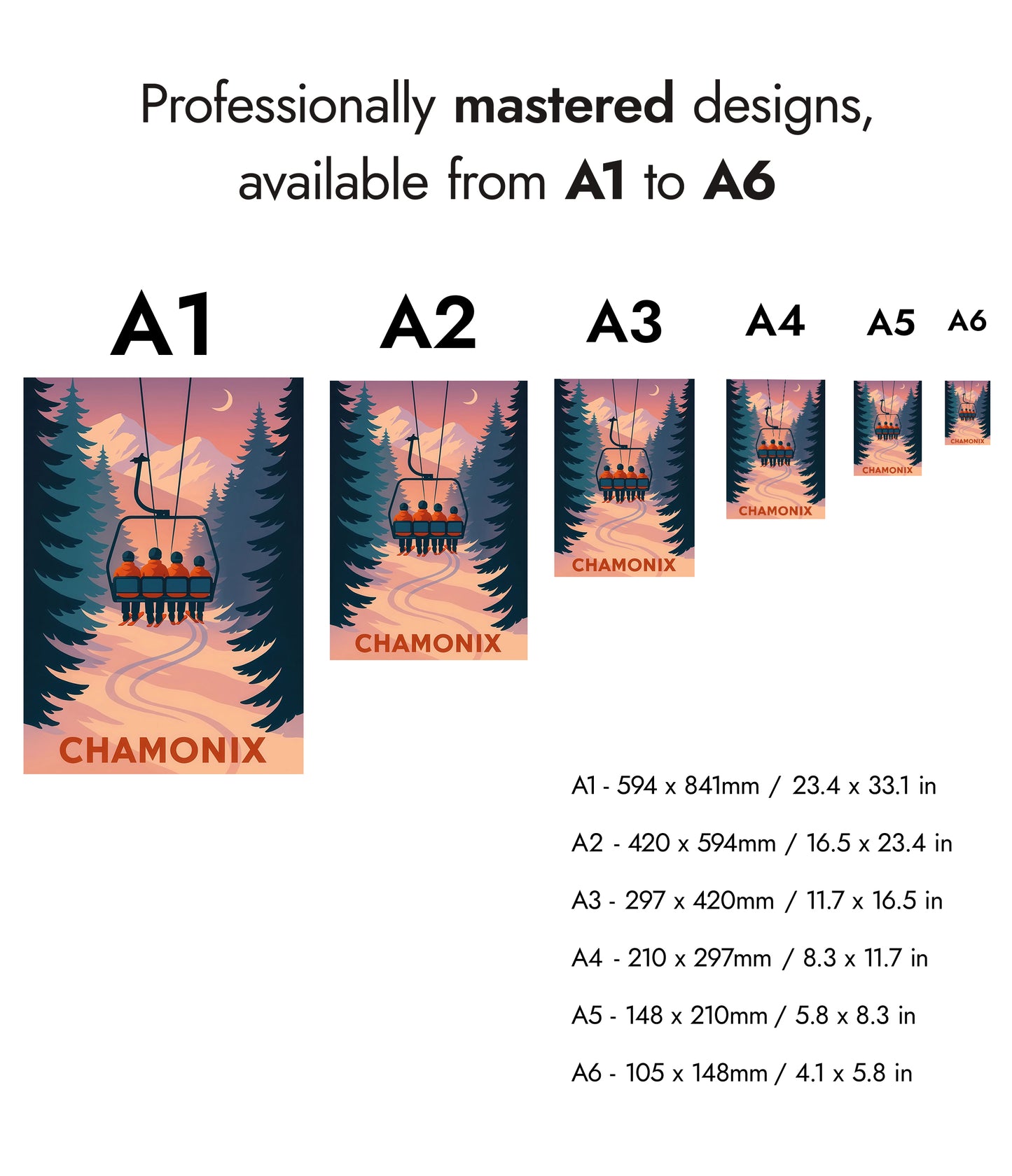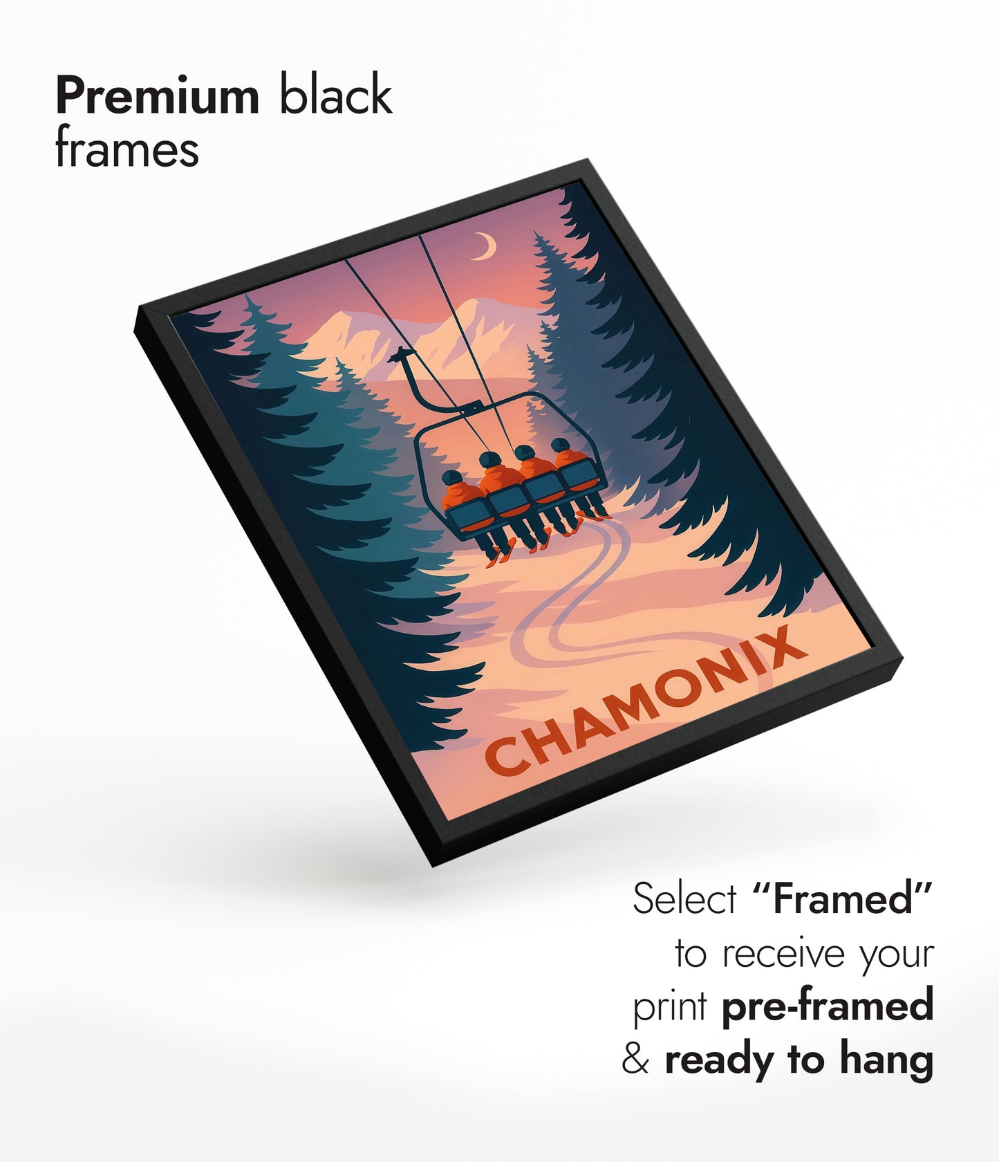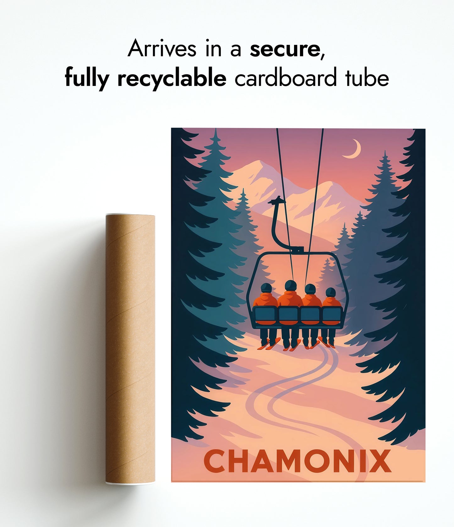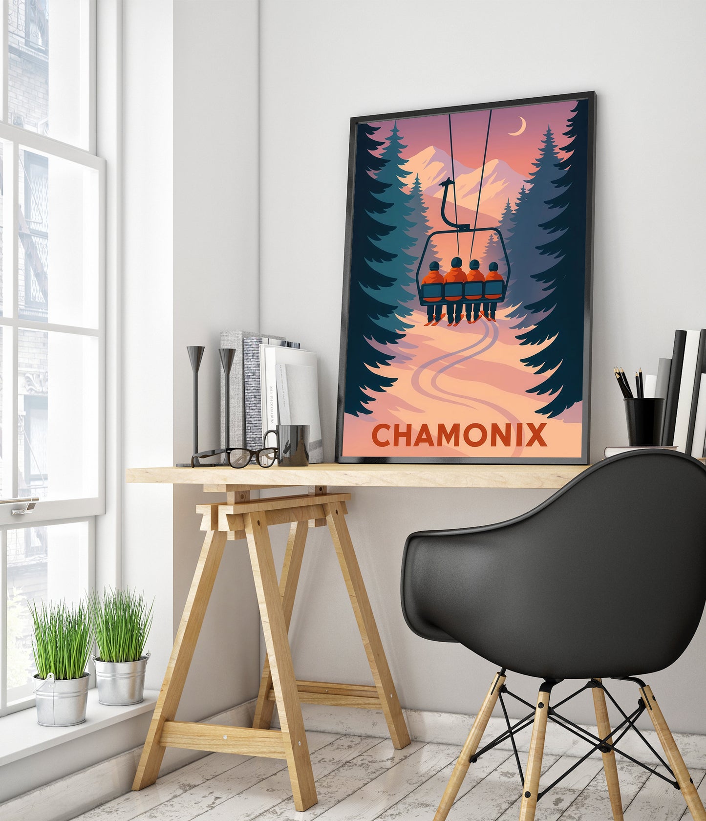 This Chamonix travel poster captures a serene alpine scene, featuring a cable car with four silhouetted figures ascending through a snow-kissed forest. With a pastel pink glow illuminating the distant mountains and a crescent moon adorning the twilight sky, this graphic illustration evokes the tranquil beauty of winter sports in a renowned alpine destination. Perfect for ski and snow enthusiasts.