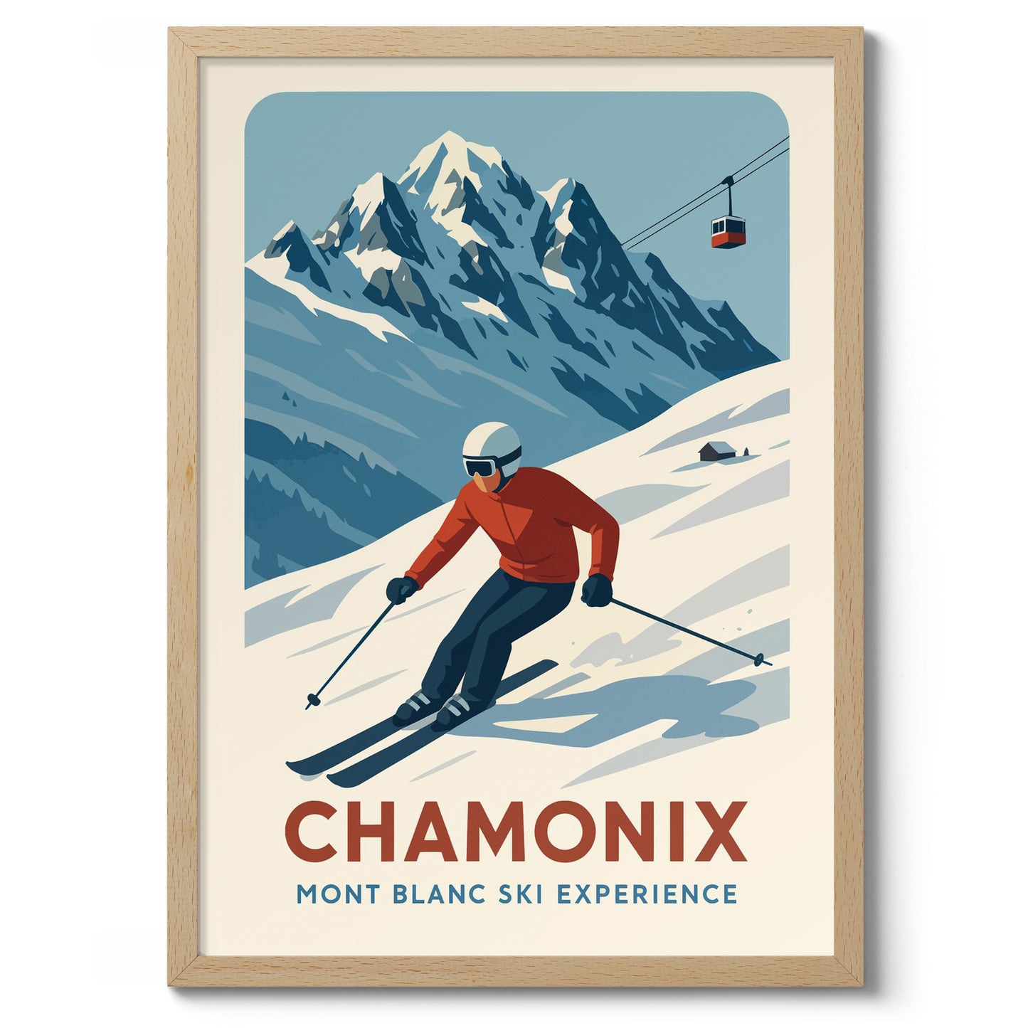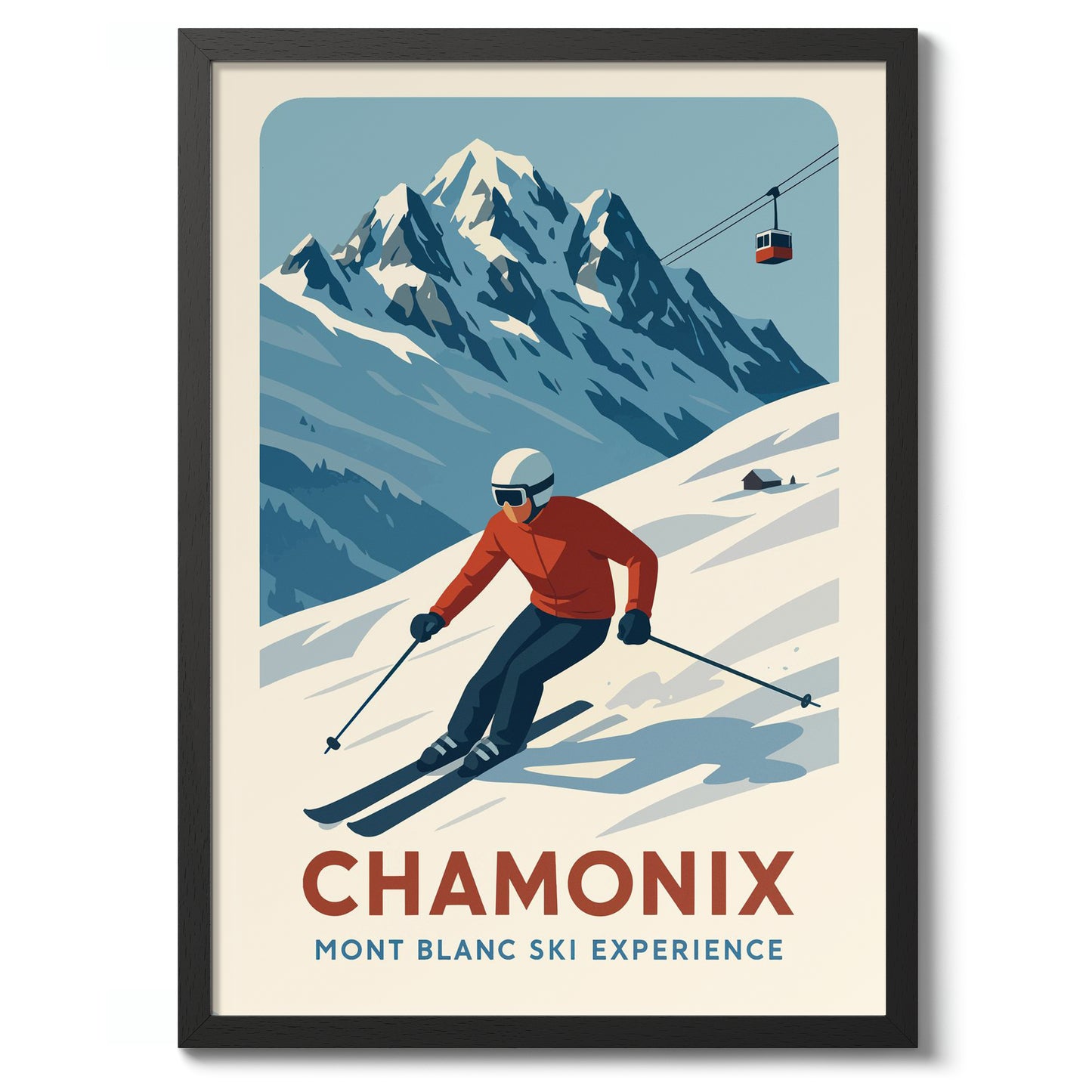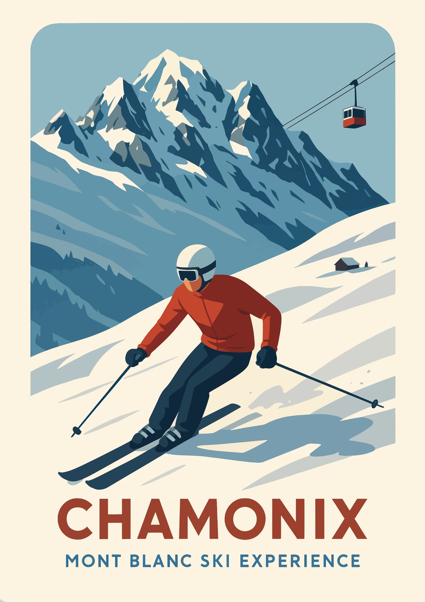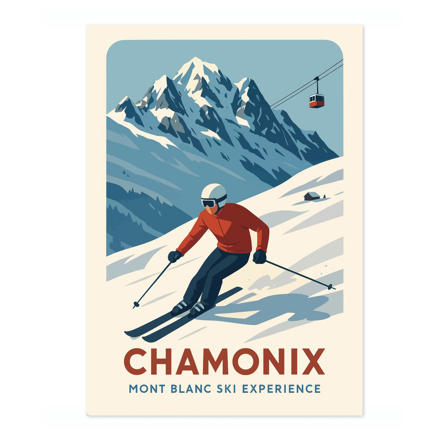 This graphic poster captures a skier elegantly descending the snow-covered slopes of Chamonix, set against the majestic backdrop of Mont Blanc. Rich in detail, it vividly brings out the thrill of alpine skiing, with a scenic cable car journey complementing the dynamic motion. Ideal for enthusiasts and collectors, this artwork encapsulates the exhilarating spirit of mountainous adventure in France.