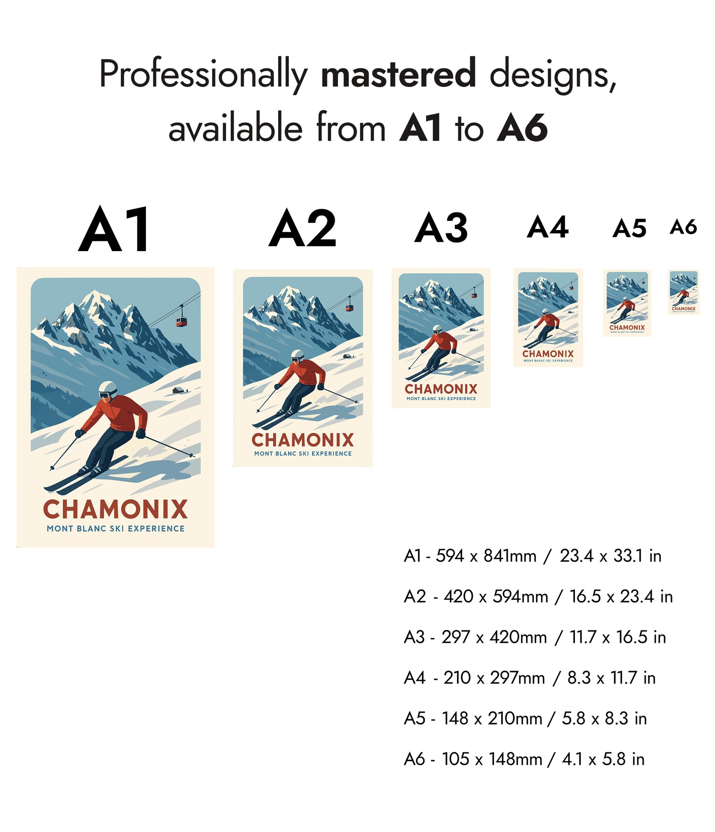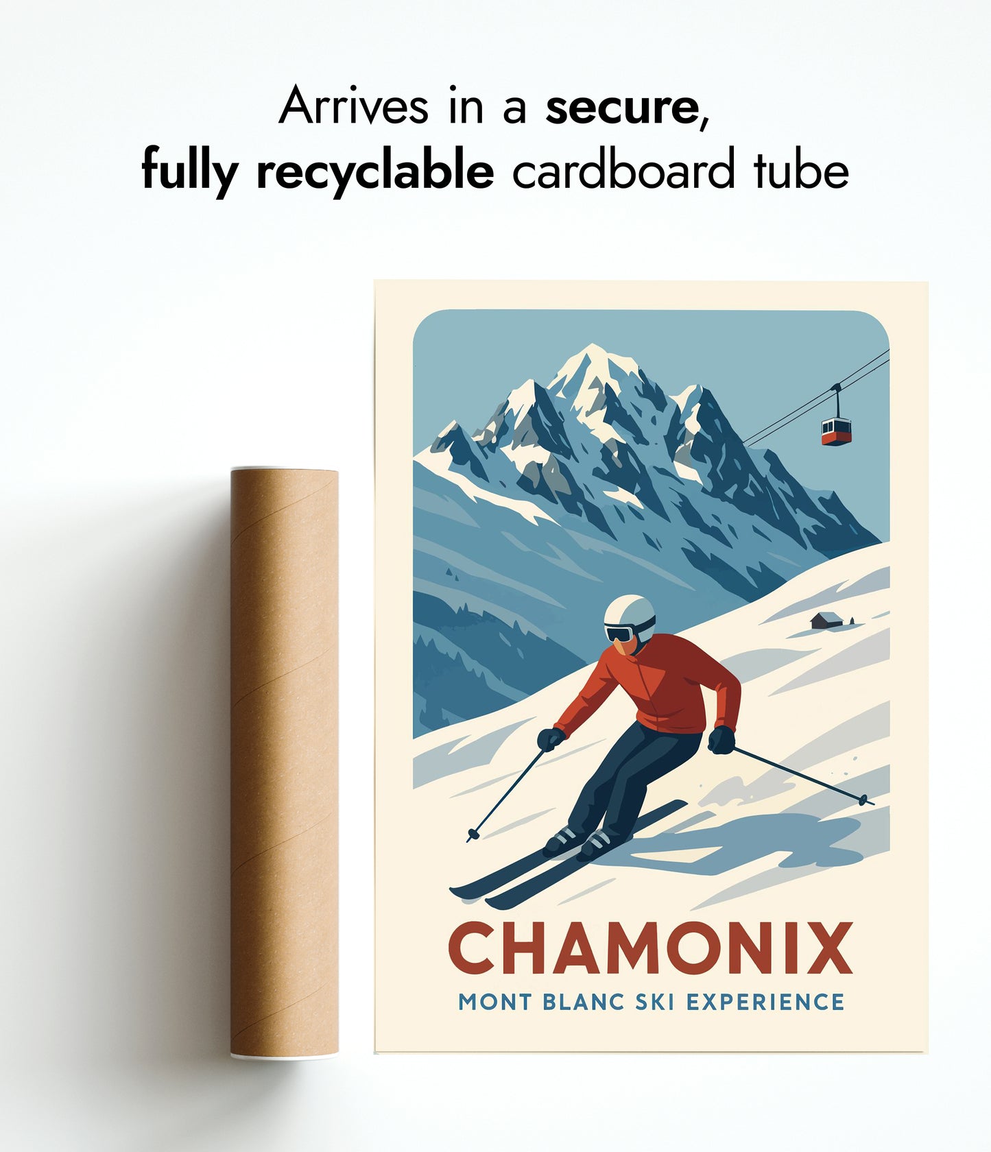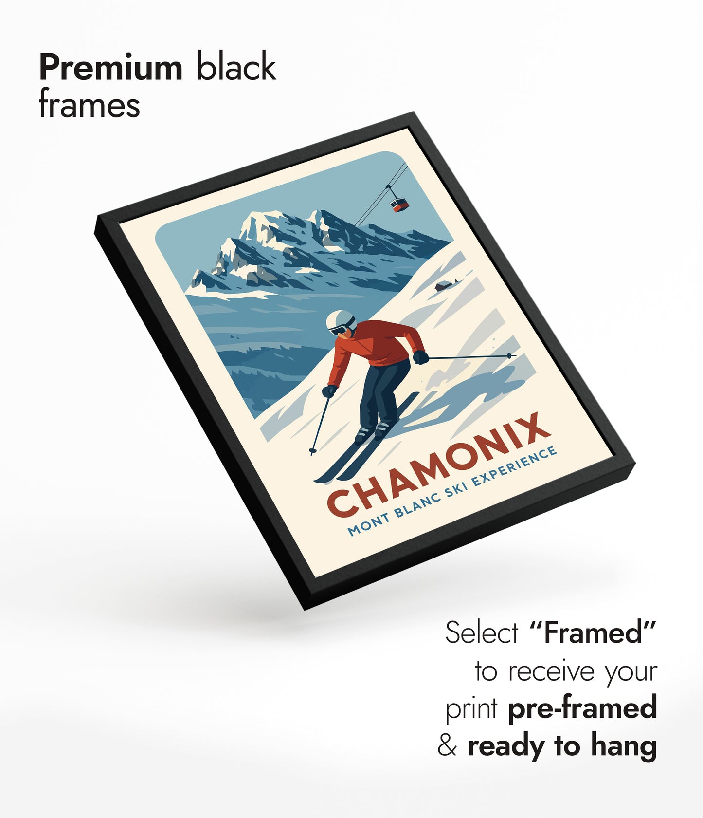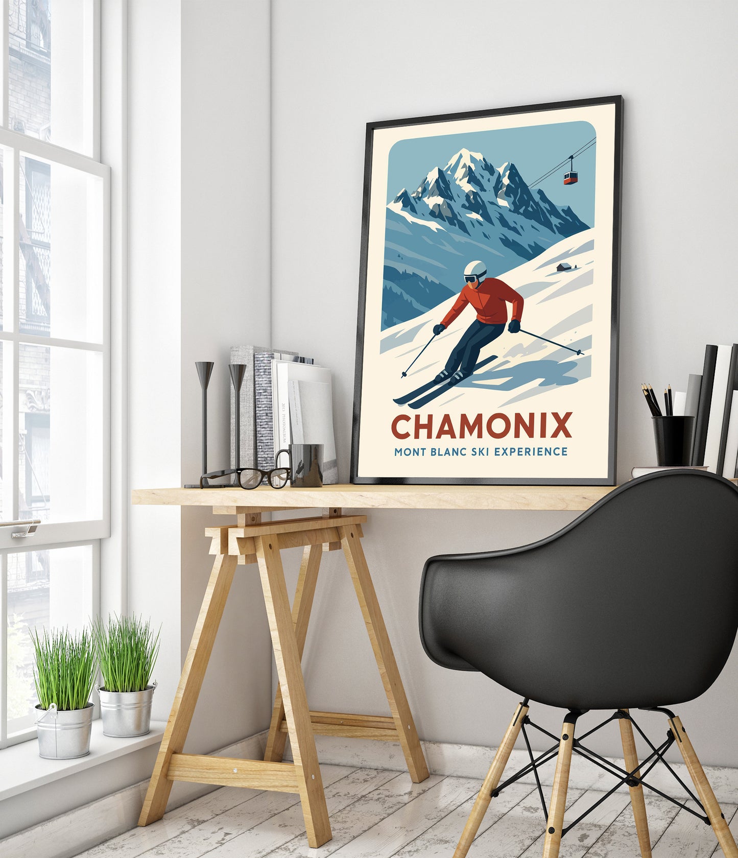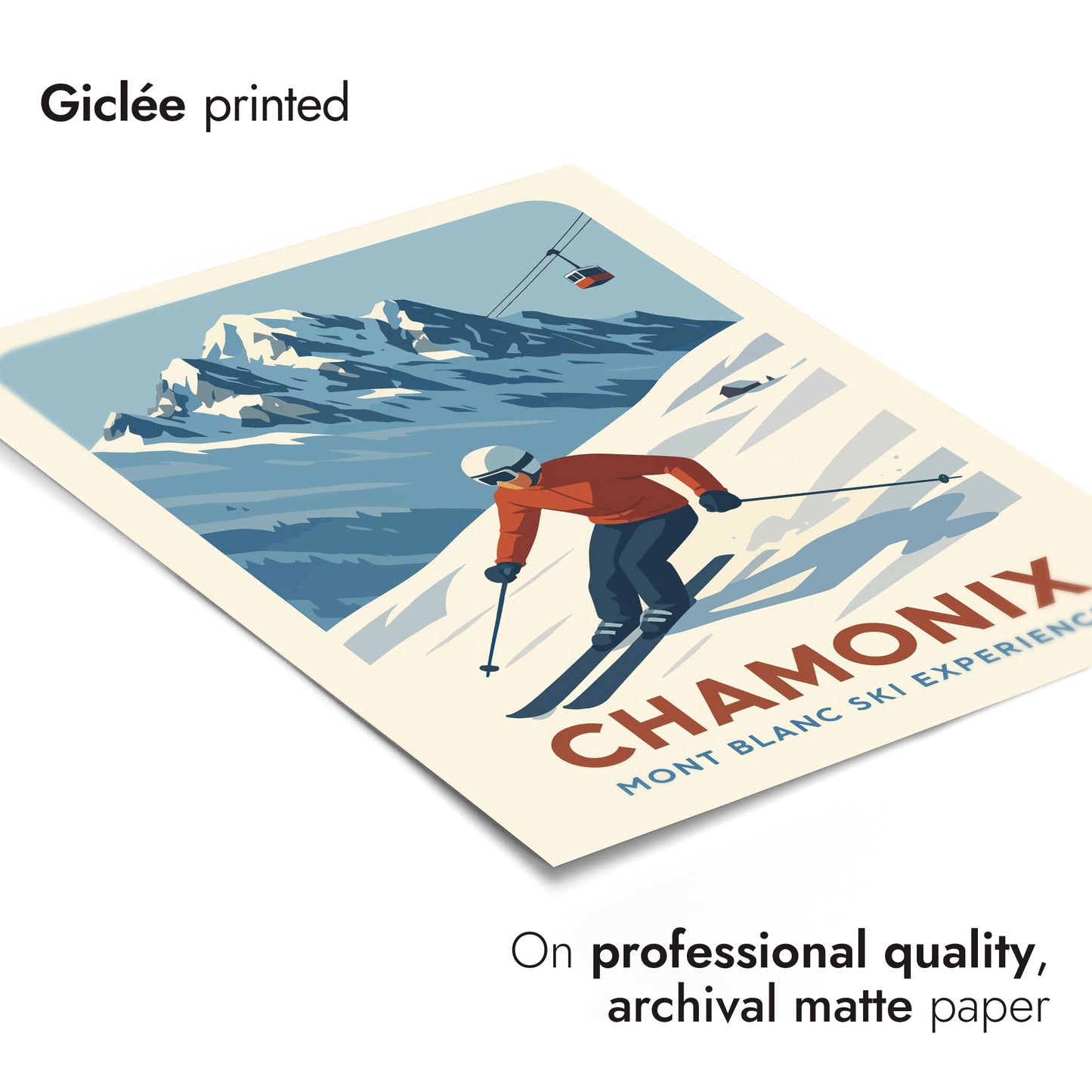 This graphic poster captures a skier elegantly descending the snow-covered slopes of Chamonix, set against the majestic backdrop of Mont Blanc. Rich in detail, it vividly brings out the thrill of alpine skiing, with a scenic cable car journey complementing the dynamic motion. Ideal for enthusiasts and collectors, this artwork encapsulates the exhilarating spirit of mountainous adventure in France.