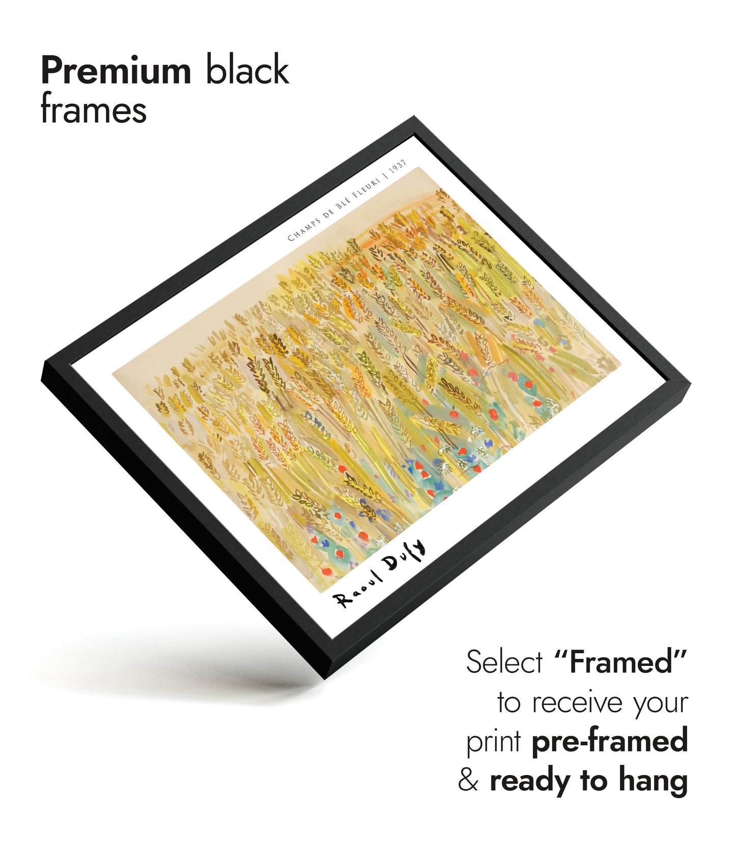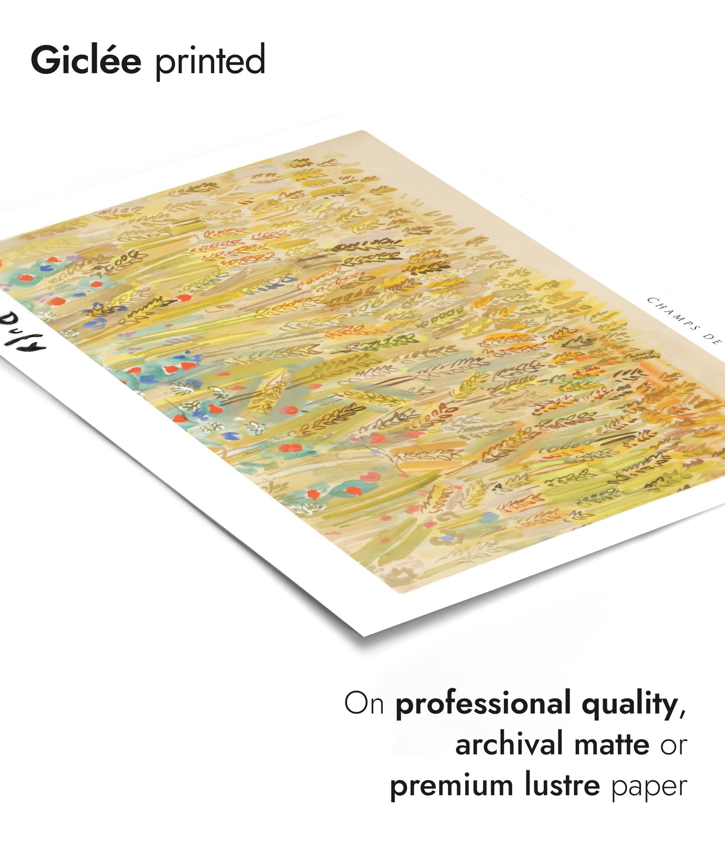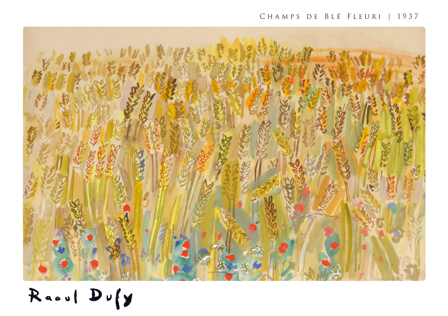 Immerse yourself in Raoul Dufy's "Champs de blé Fleurie" poster, a 1937 watercolour masterpiece showcasing a vibrant field of flowering wheat. This Fauvist landscape is alive with a rich palette of yellows, greens, and pops of red and blue flowers, capturing the serene beauty of nature in an expressive and lively manner. Perfect for art enthusiasts and nature lovers alike.