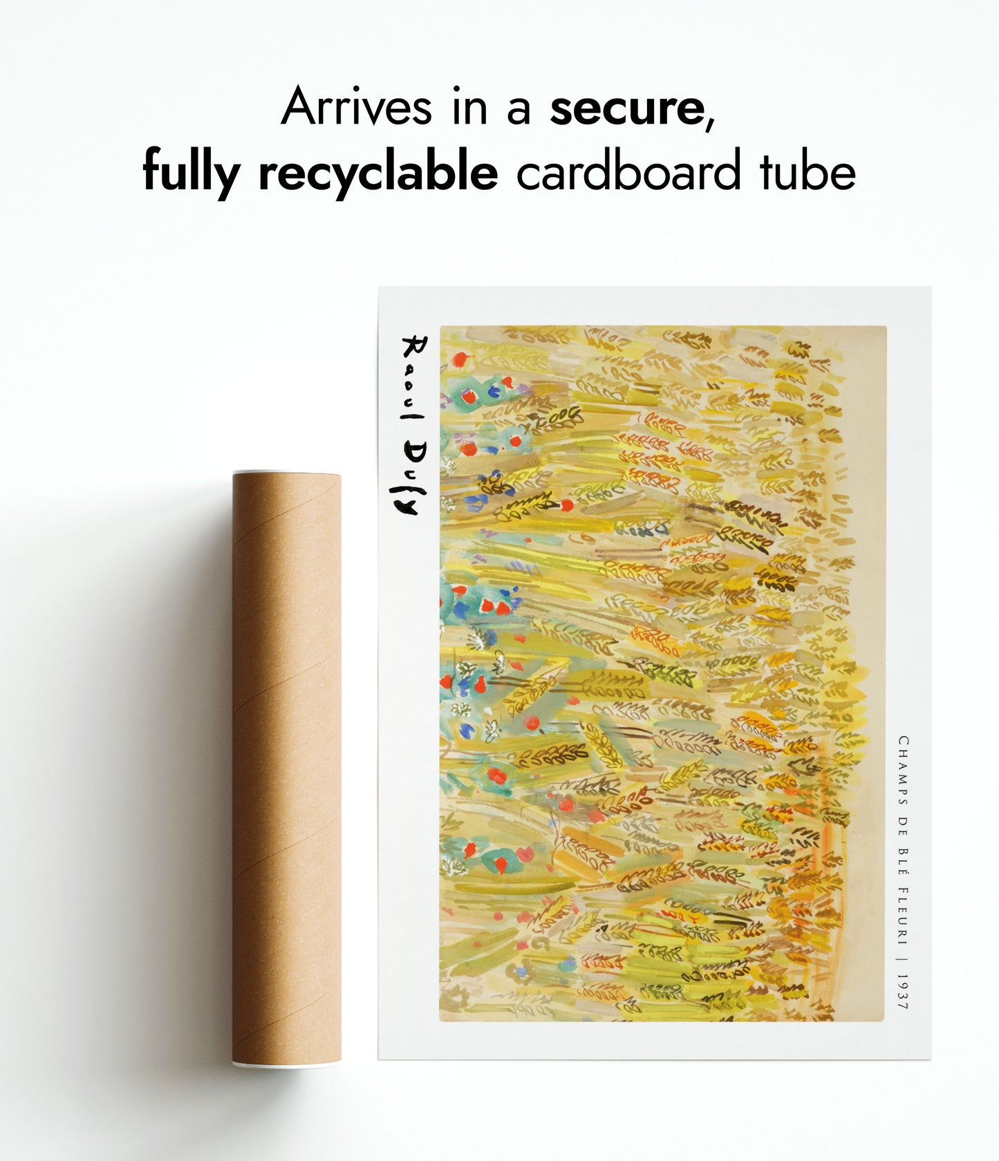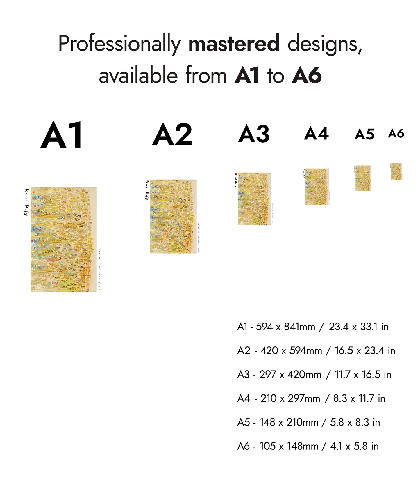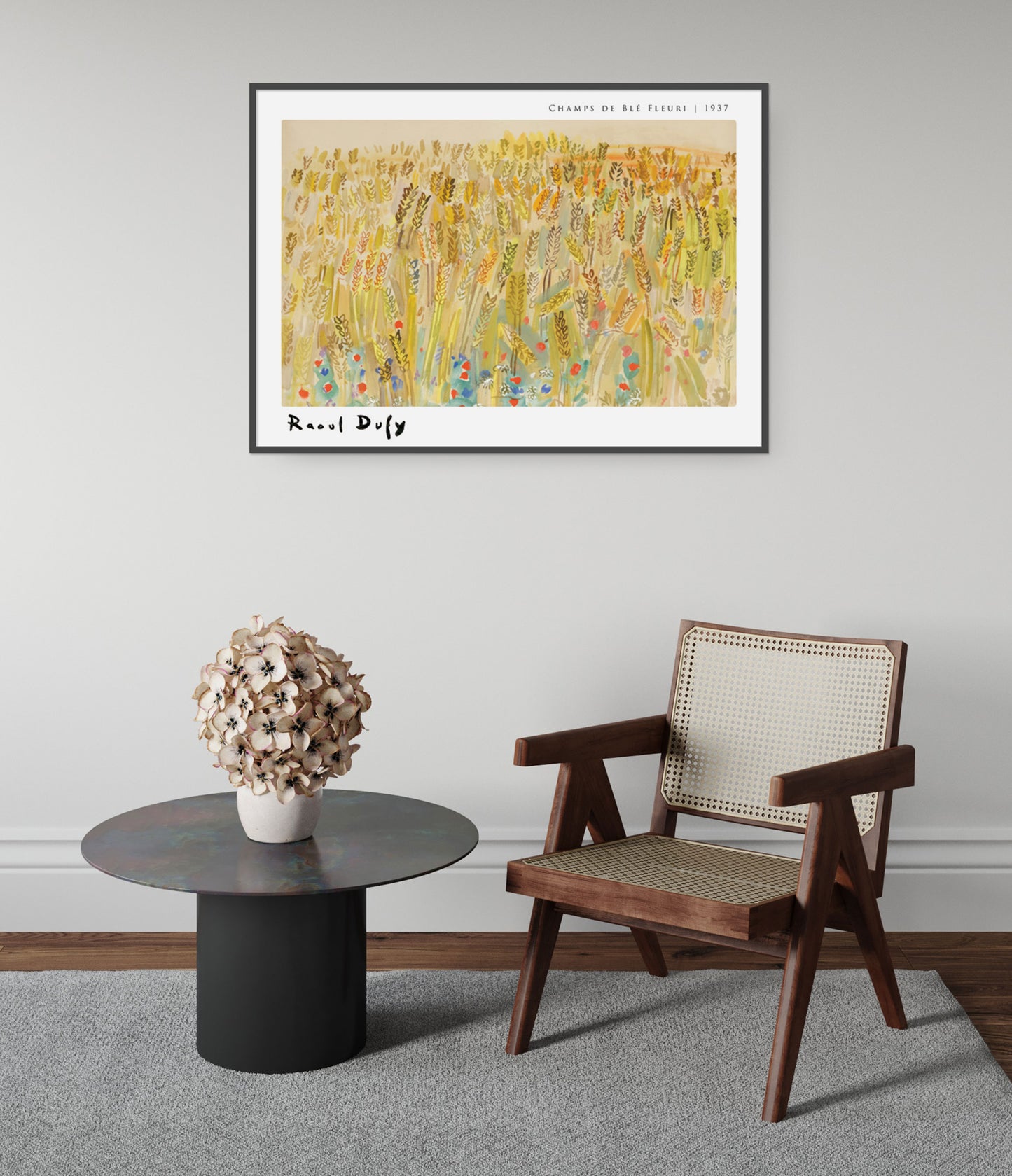 Immerse yourself in Raoul Dufy's "Champs de blé Fleurie" poster, a 1937 watercolour masterpiece showcasing a vibrant field of flowering wheat. This Fauvist landscape is alive with a rich palette of yellows, greens, and pops of red and blue flowers, capturing the serene beauty of nature in an expressive and lively manner. Perfect for art enthusiasts and nature lovers alike.