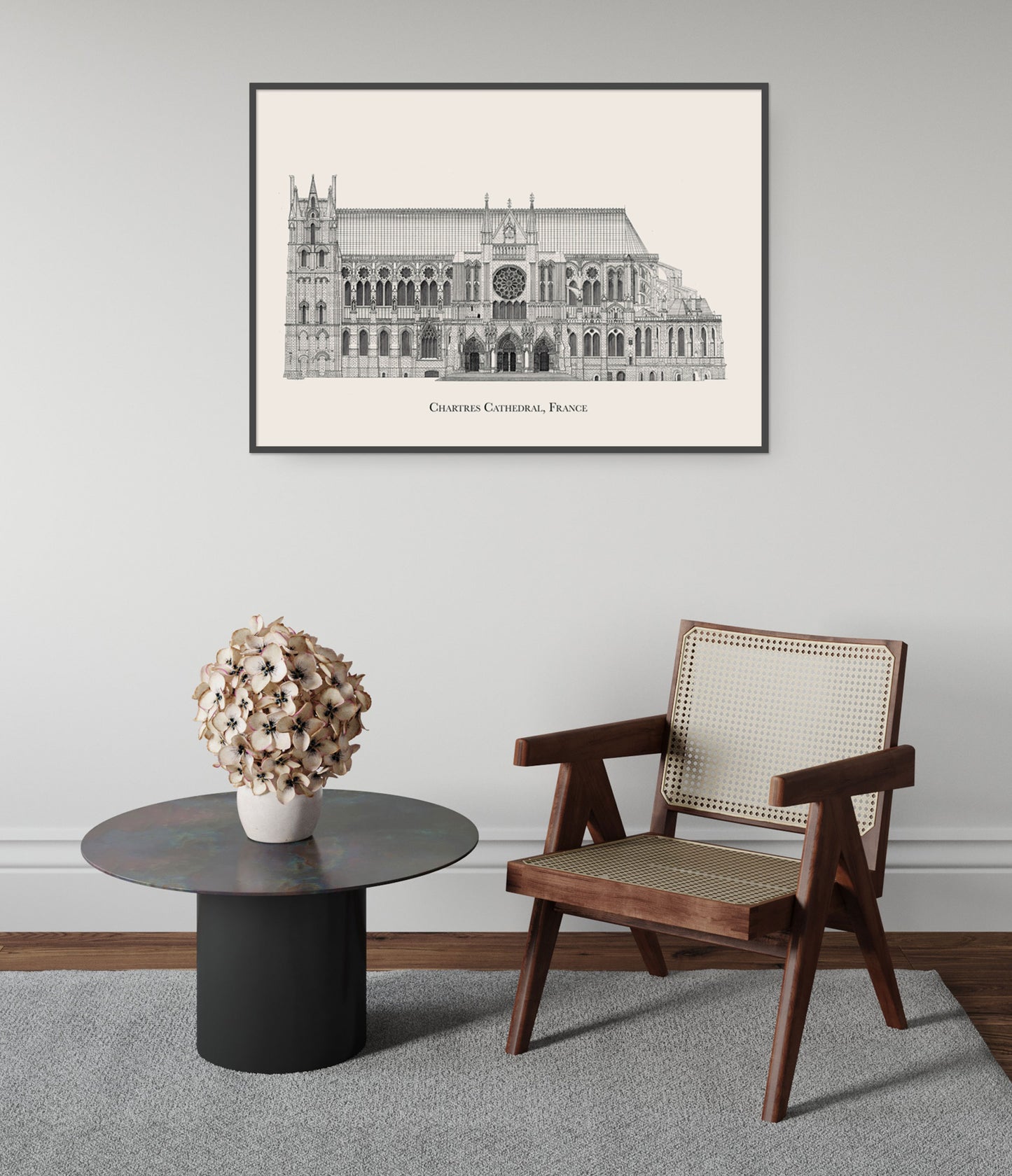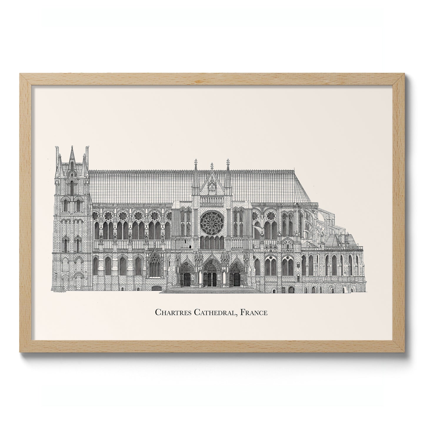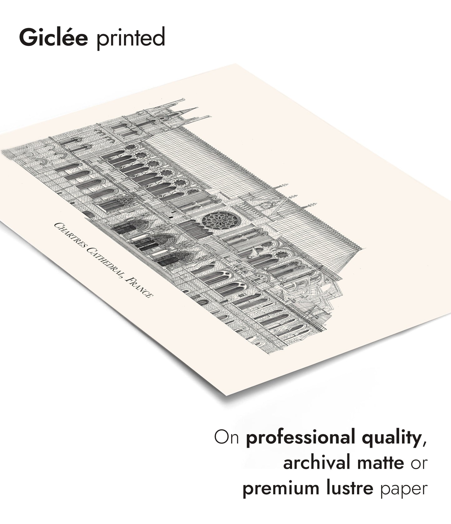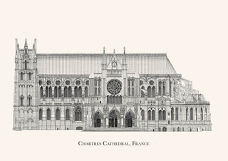 This detailed line art poster features Chartres Cathedral in France, showcasing its stunning Gothic architecture. The intricate illustration highlights the cathedral's ornate façade, distinctive towers, and iconic rose window. Perfect for admirers of European landmarks and historical architecture, this vintage-style poster offers a timeless depiction of one of France's most revered cathedrals. Ideal for travel enthusiasts and art lovers alike.