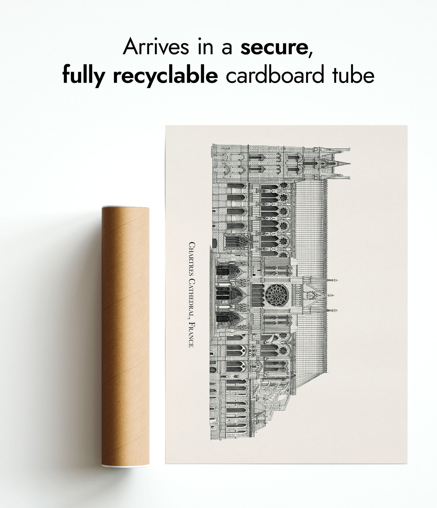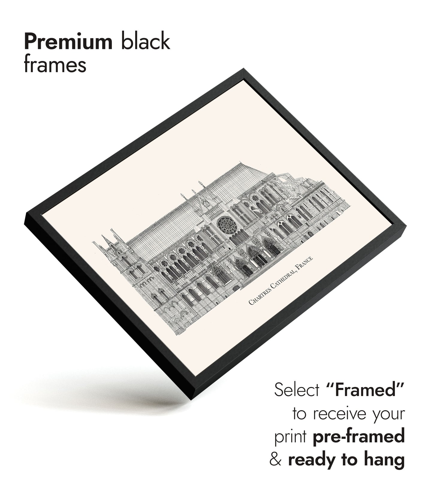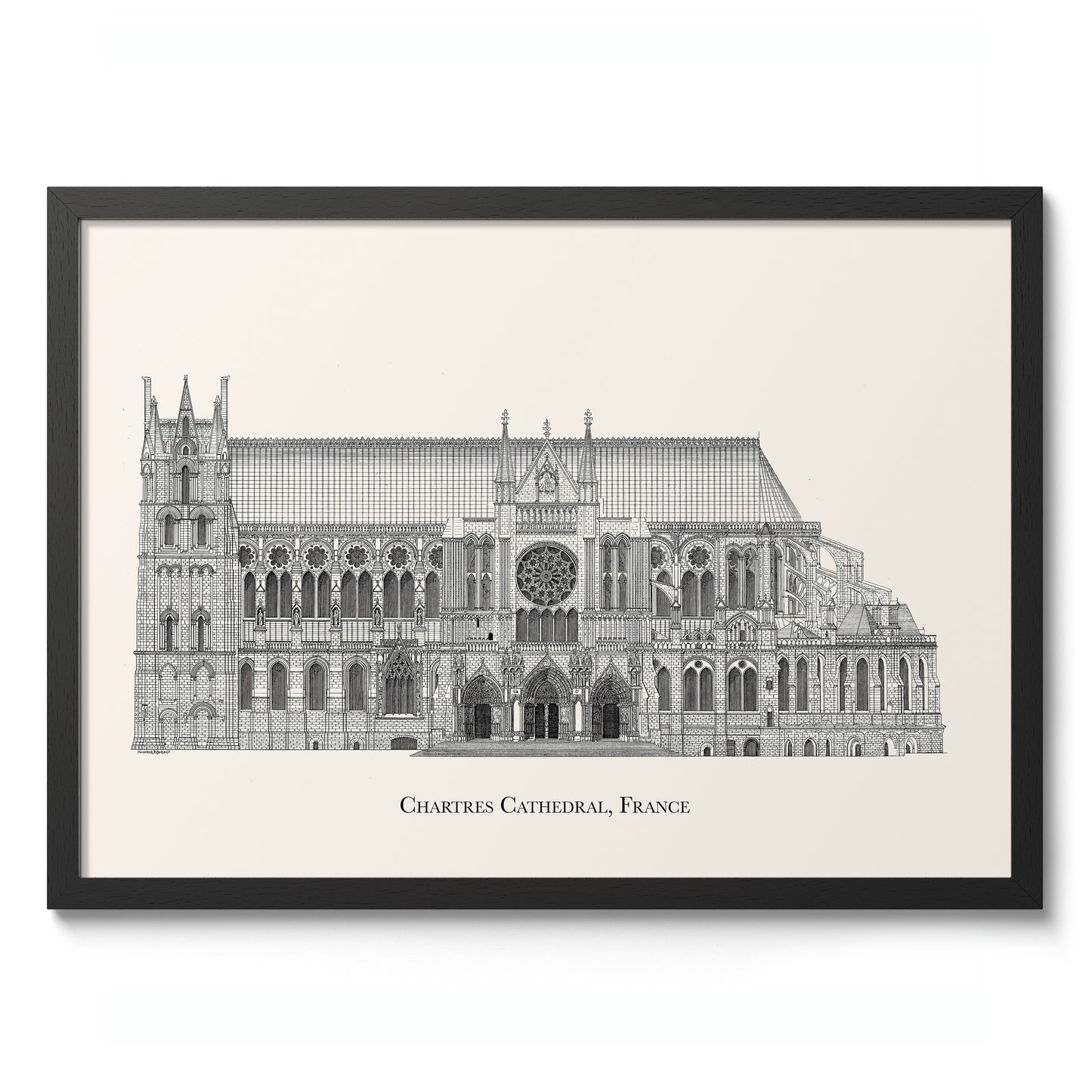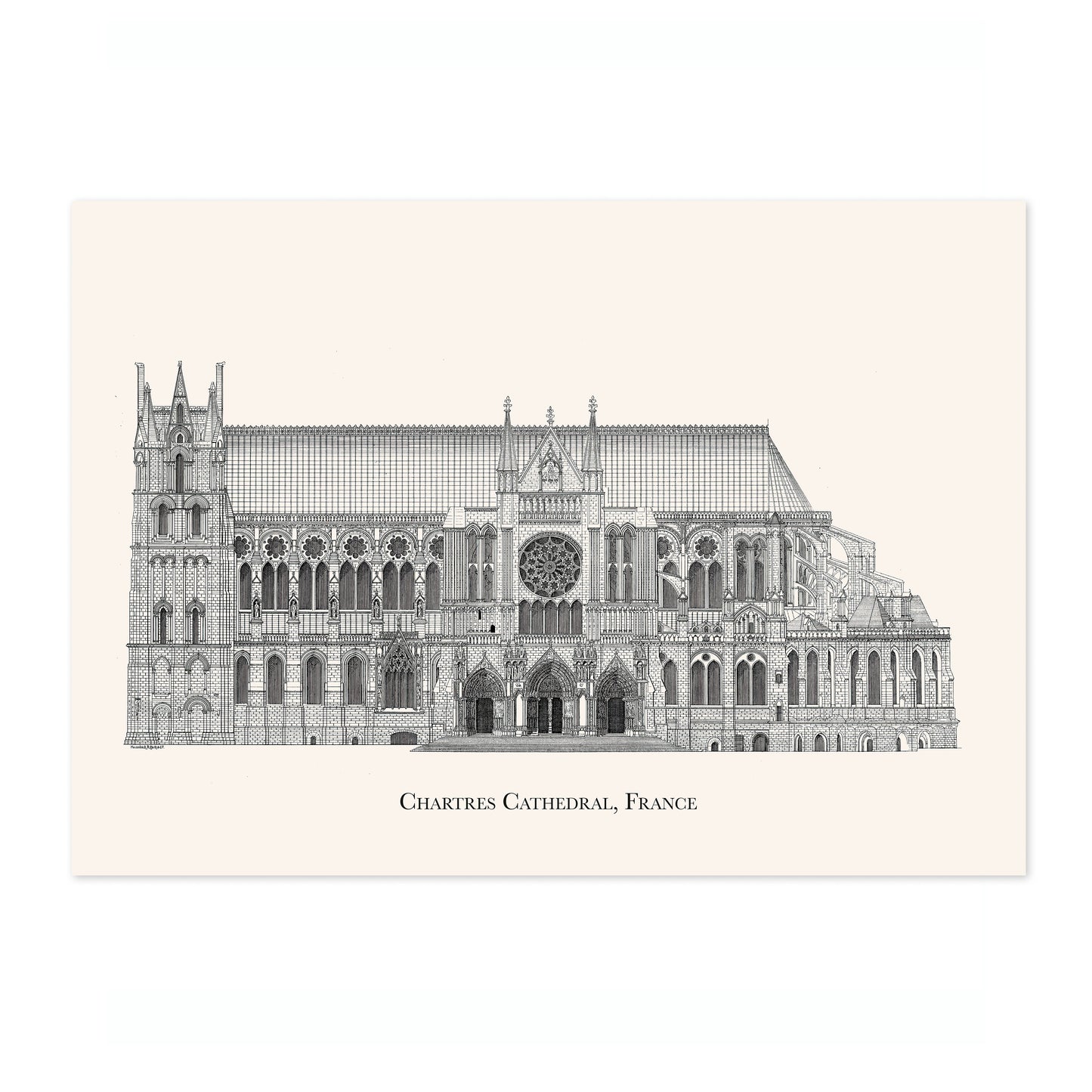 This detailed line art poster features Chartres Cathedral in France, showcasing its stunning Gothic architecture. The intricate illustration highlights the cathedral's ornate façade, distinctive towers, and iconic rose window. Perfect for admirers of European landmarks and historical architecture, this vintage-style poster offers a timeless depiction of one of France's most revered cathedrals. Ideal for travel enthusiasts and art lovers alike.
