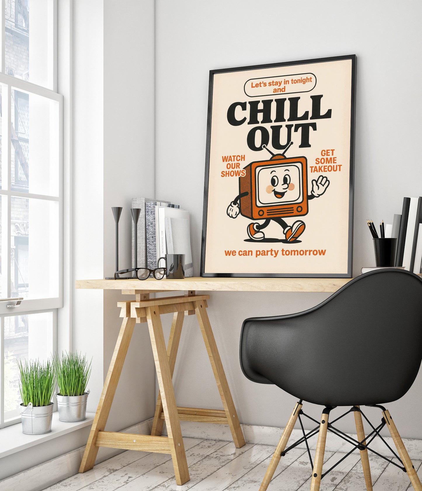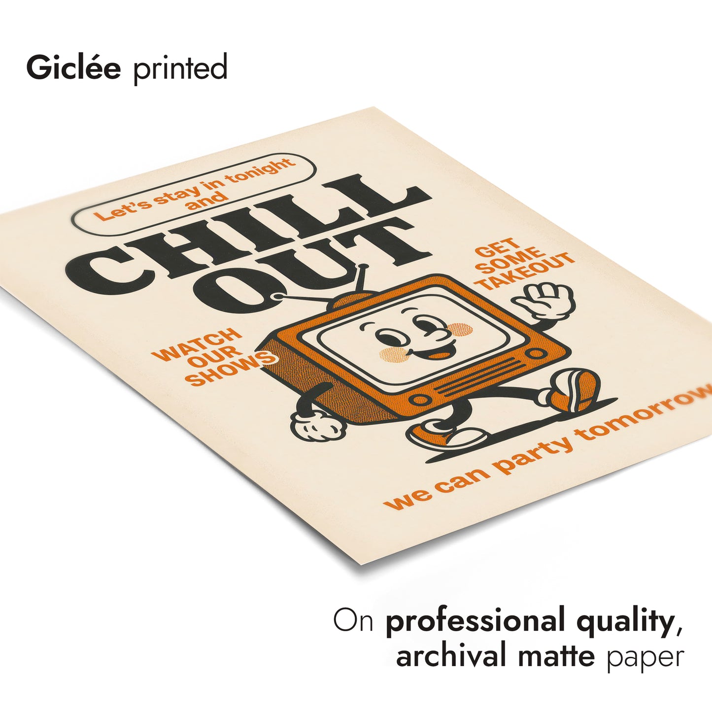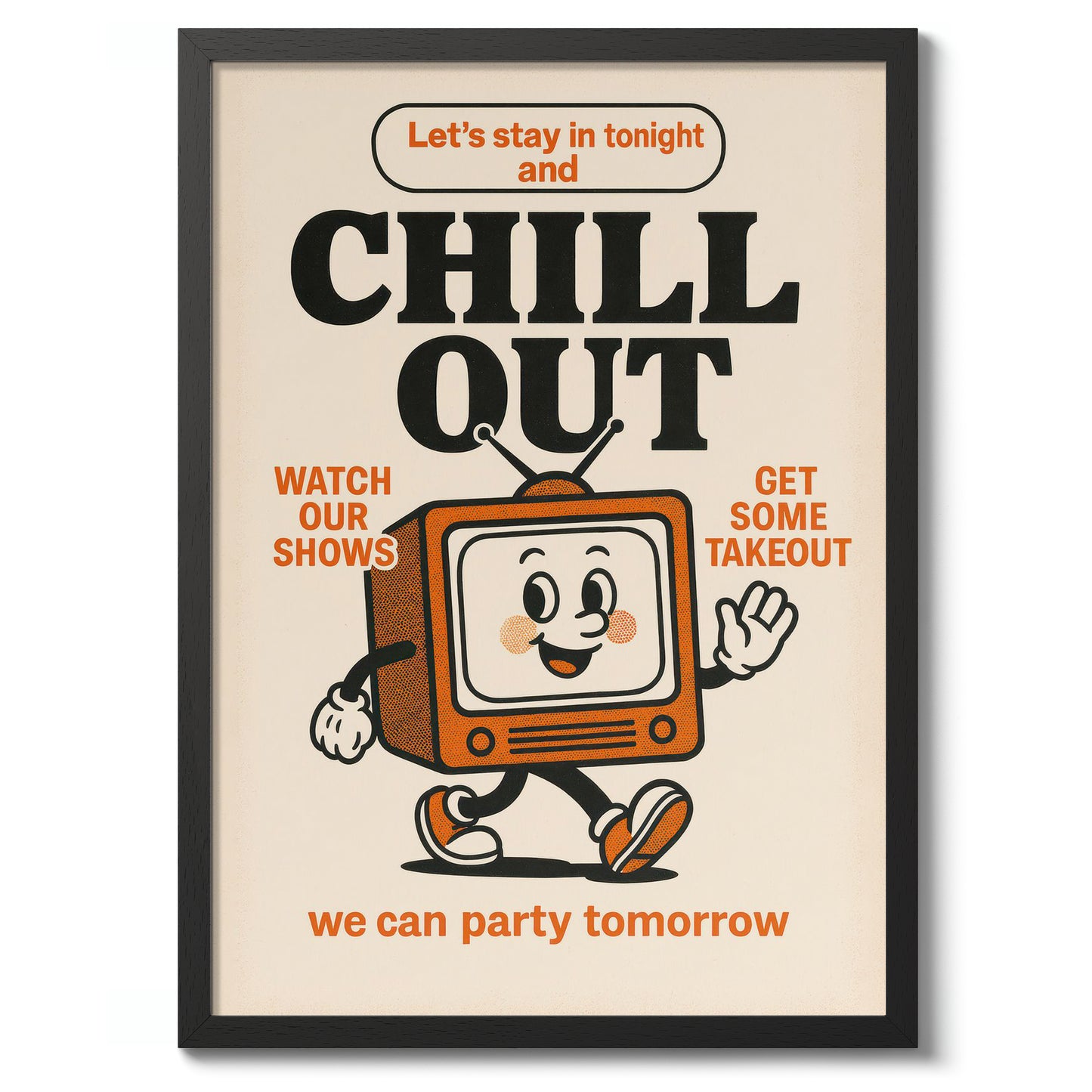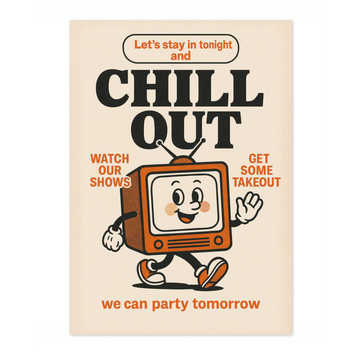 This vintage-inspired poster features a charming retro television mascot with a cheerful expression, urging viewers to "Chill Out." Encased in a beige background, bold typography and retro illustration style highlight themes of relaxation with the slogans "Watch Our Shows" and "Get Some Takeout". Ideal for adding a nostalgic touch to any space, promoting cozy, laid-back vibes.