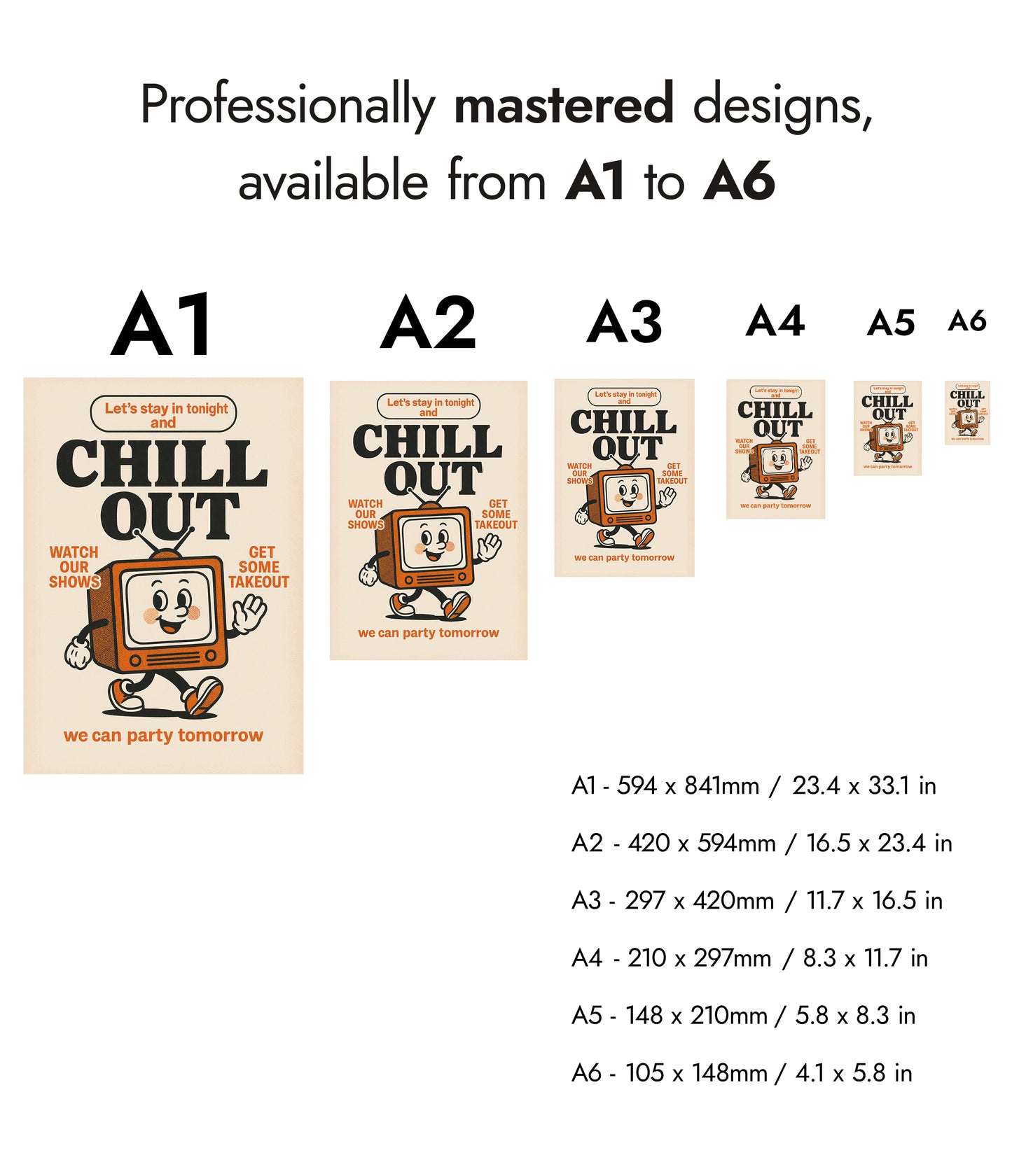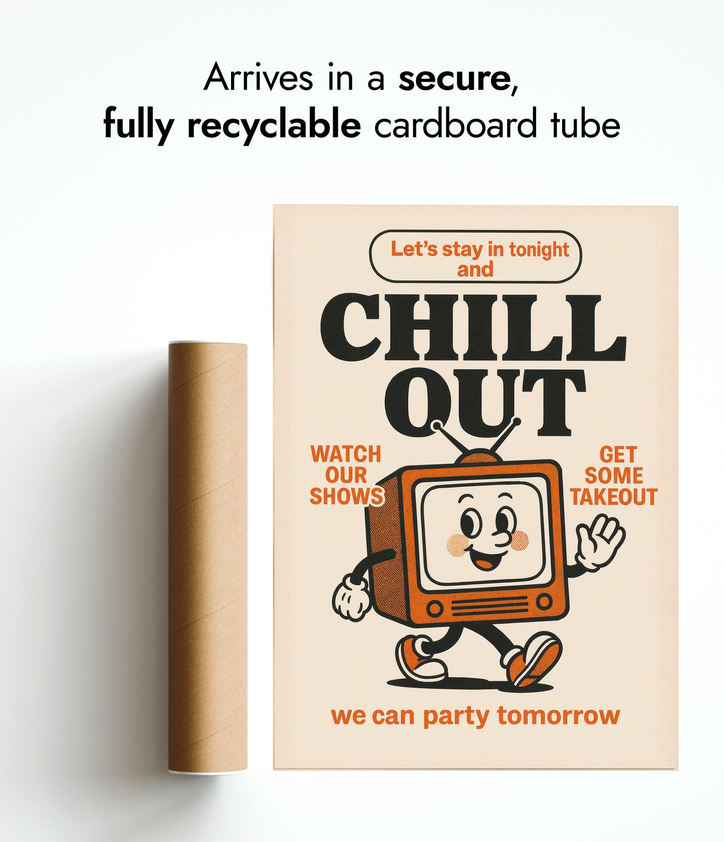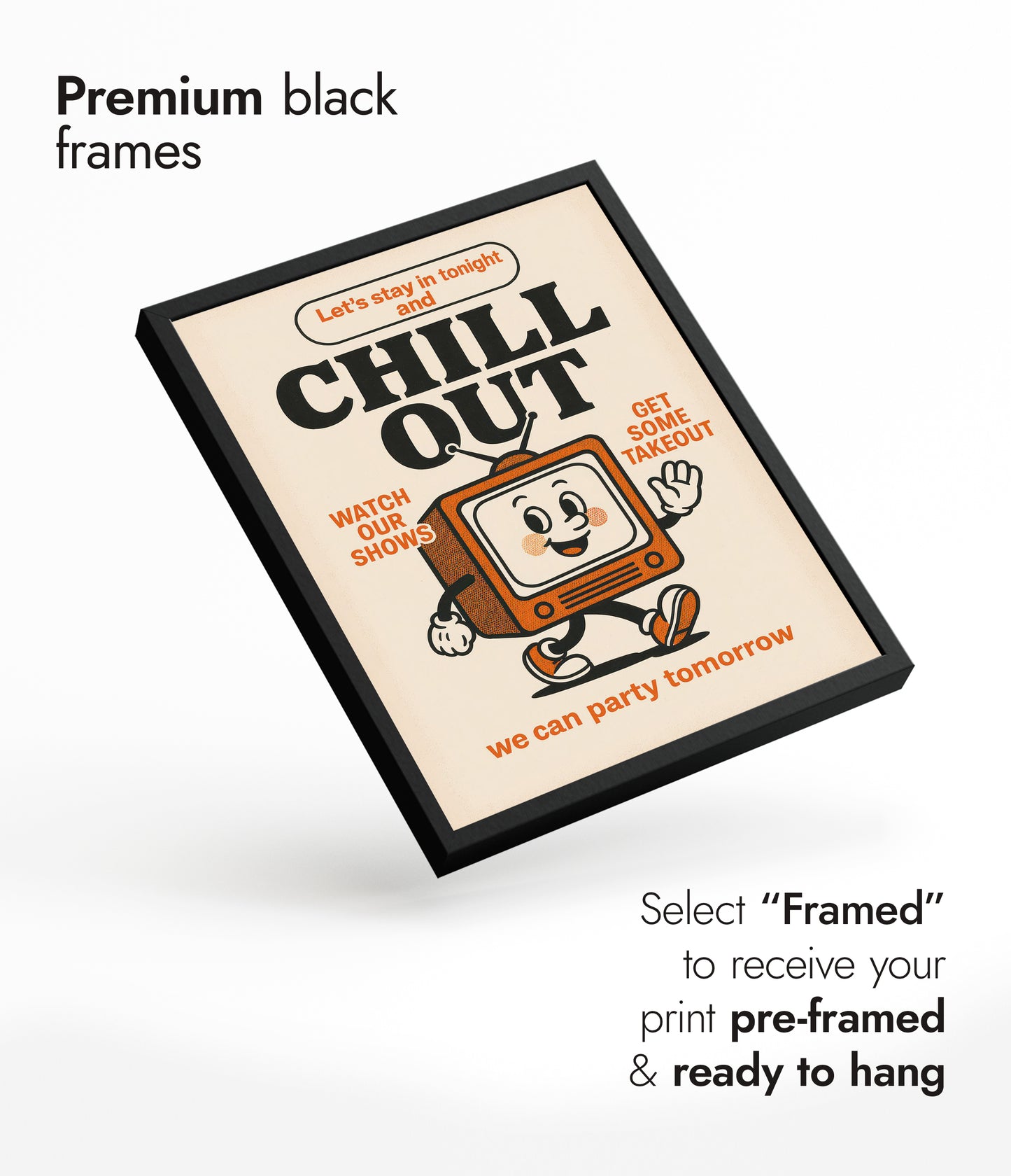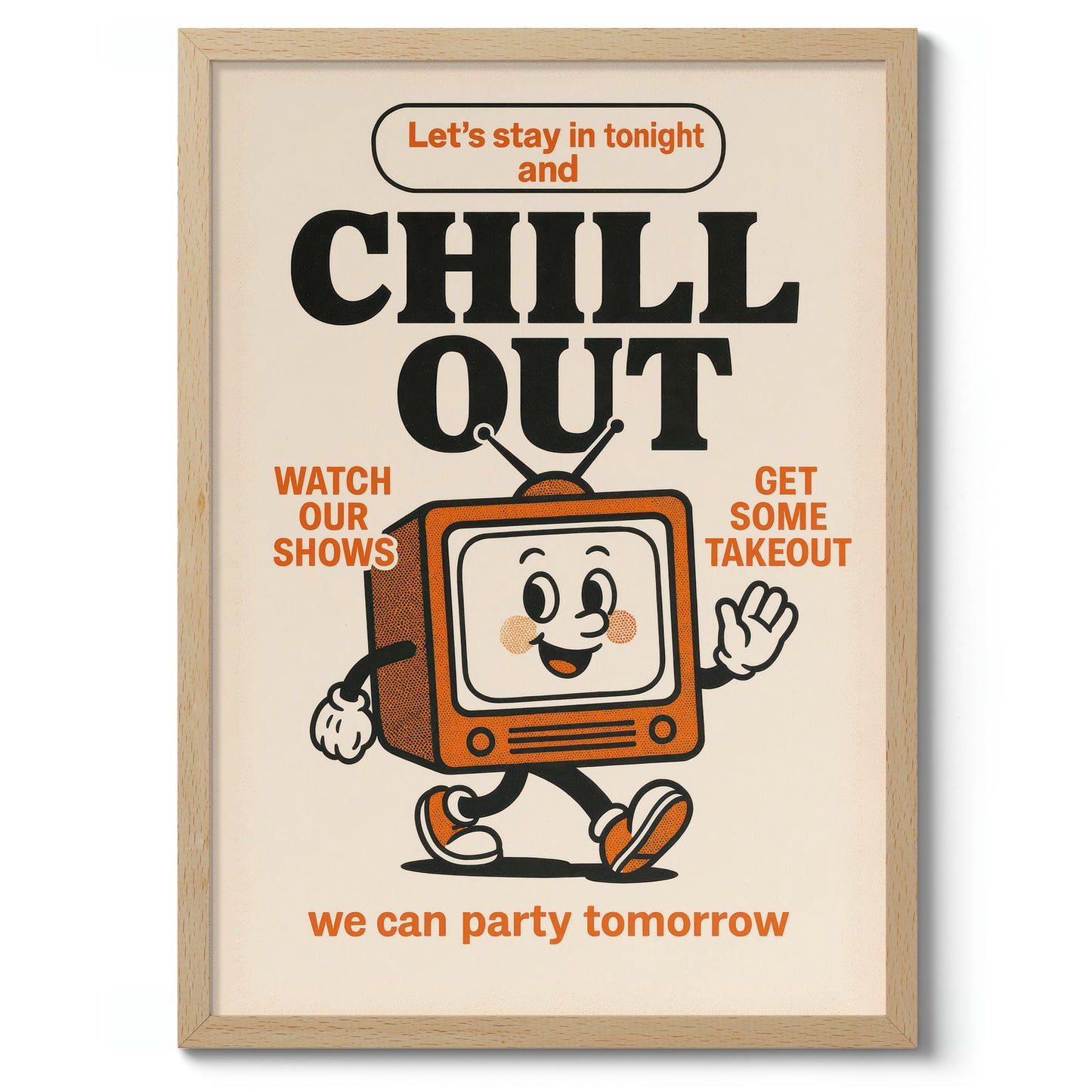 This vintage-inspired poster features a charming retro television mascot with a cheerful expression, urging viewers to "Chill Out." Encased in a beige background, bold typography and retro illustration style highlight themes of relaxation with the slogans "Watch Our Shows" and "Get Some Takeout". Ideal for adding a nostalgic touch to any space, promoting cozy, laid-back vibes.