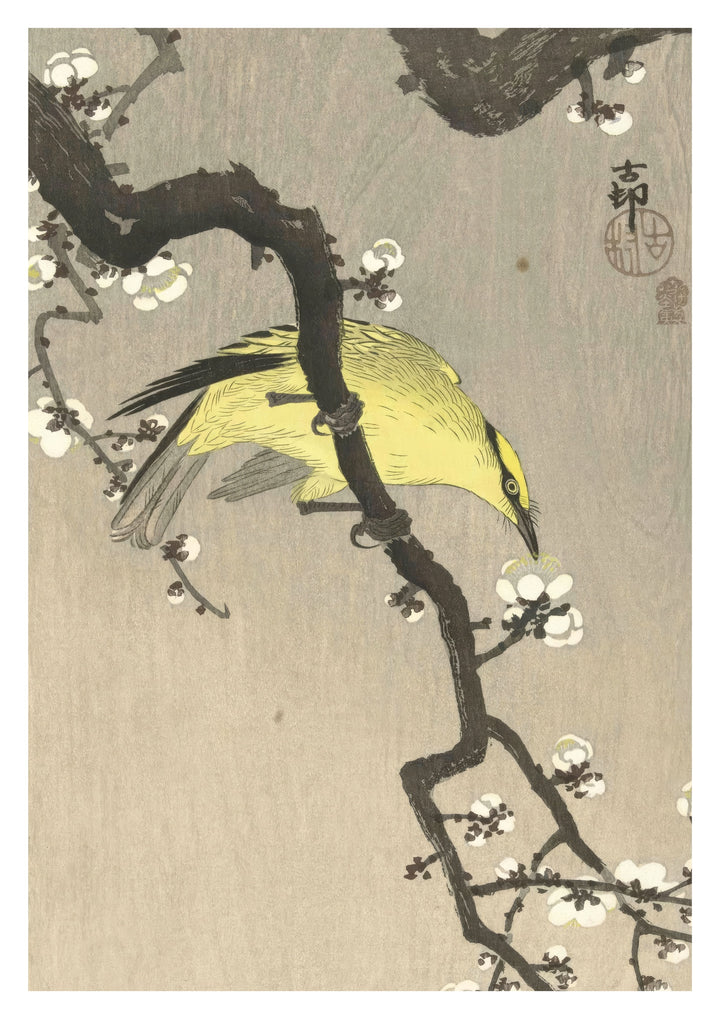 The "Chinese Oriole on Plum Blossom Branch" poster by Ohara Koson features a delicate woodblock illustration. This traditional Japanese artwork showcases a vibrant Chinese oriole perched on a flowering plum branch, set against a subtle, muted background. Ideal for enthusiasts of ukiyo-e art, this poster highlights nature's elegance and beauty through exquisite detailing and harmonious composition.