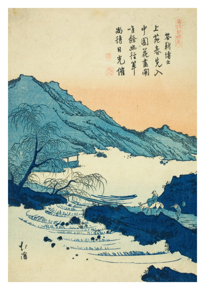 This traditional woodblock poster by Totoya Hokkei features a serene mountain landscape with a winding river and distant bridge. The rich blue and earthy tones capture the tranquil beauty of the scene, evoking a sense of calm. Delicate brushstrokes and intricate details highlight the traditional Ukiyo-e style, making this poster a timeless piece of Japanese art.