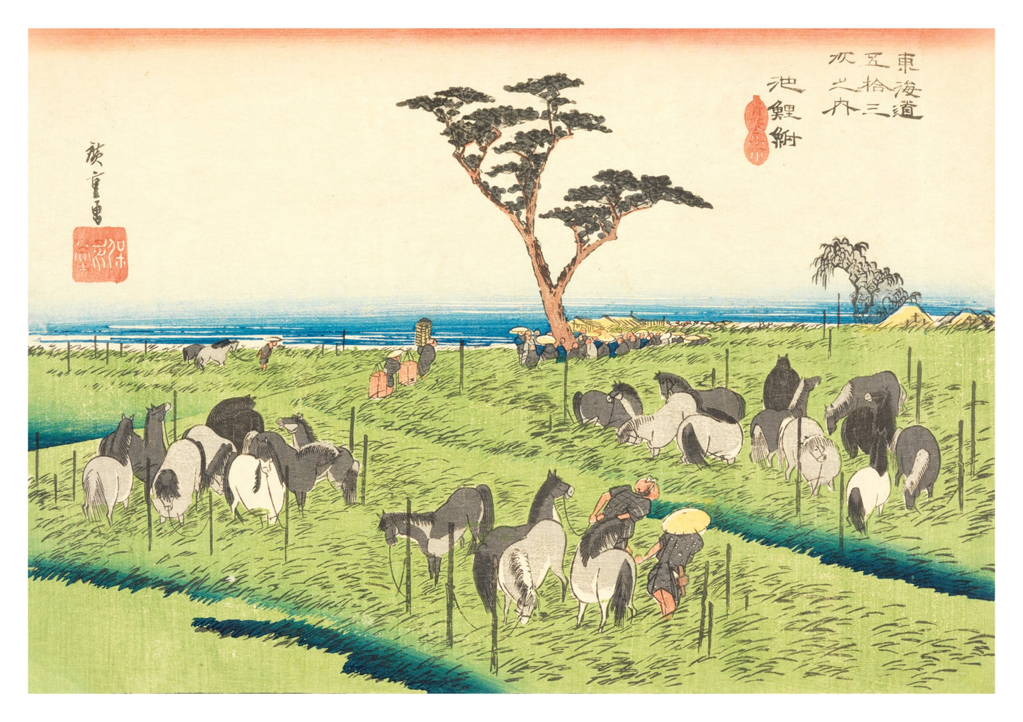 "Chiryu, the Horse Fair" by Utagawa Kuniyoshi is a traditional Japanese woodblock print capturing a serene rural landscape. It features farmers and horses in a lush green field, with a tranquil blue sea and a lone pine tree in the background. This illustration showcases the beauty of everyday life, making it an elegant choice for any poster collection.
