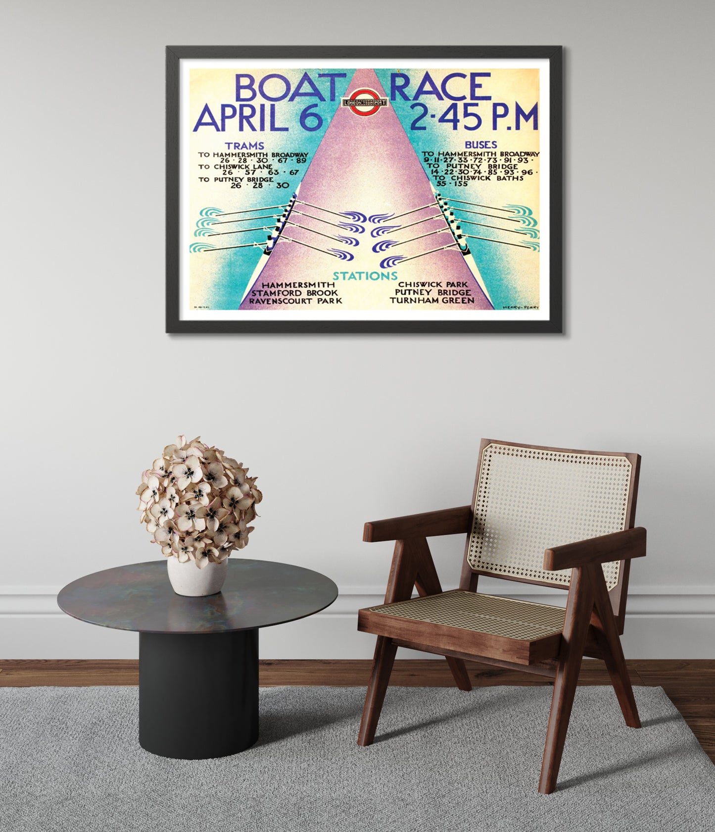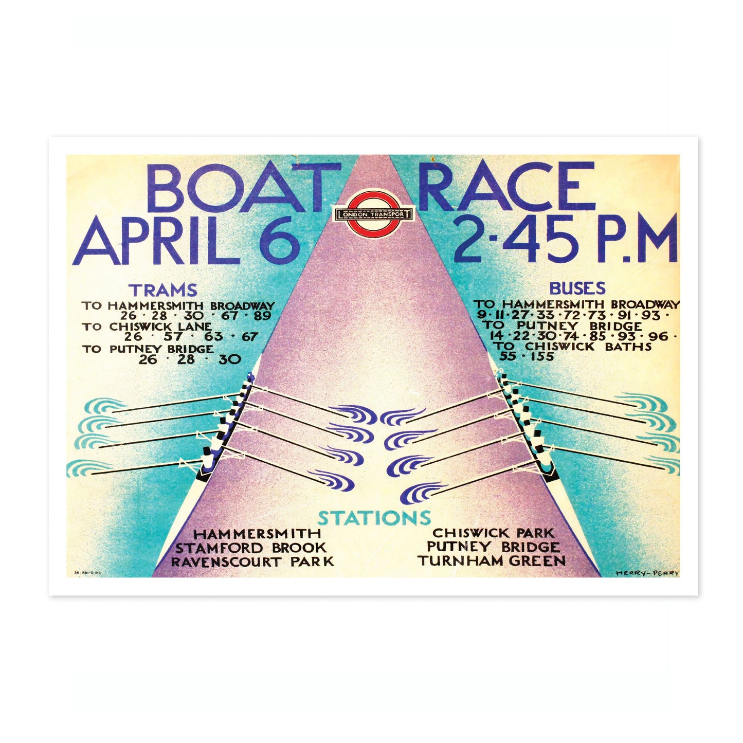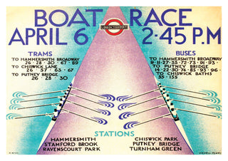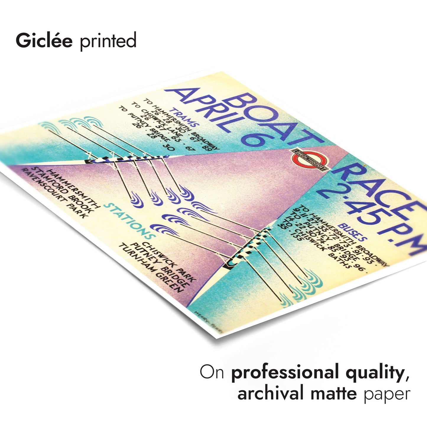 This vintage-style poster captures the excitement of the Chiswick Boat Race with dynamic oars extending from racing boats. Featuring a purple and blue color scheme, it highlights London Underground transport details for spectators. Ideal for fans of sports and rowing, this illustration evokes the spirit of a classic Thames event. Perfect for adding a historical touch to any space.