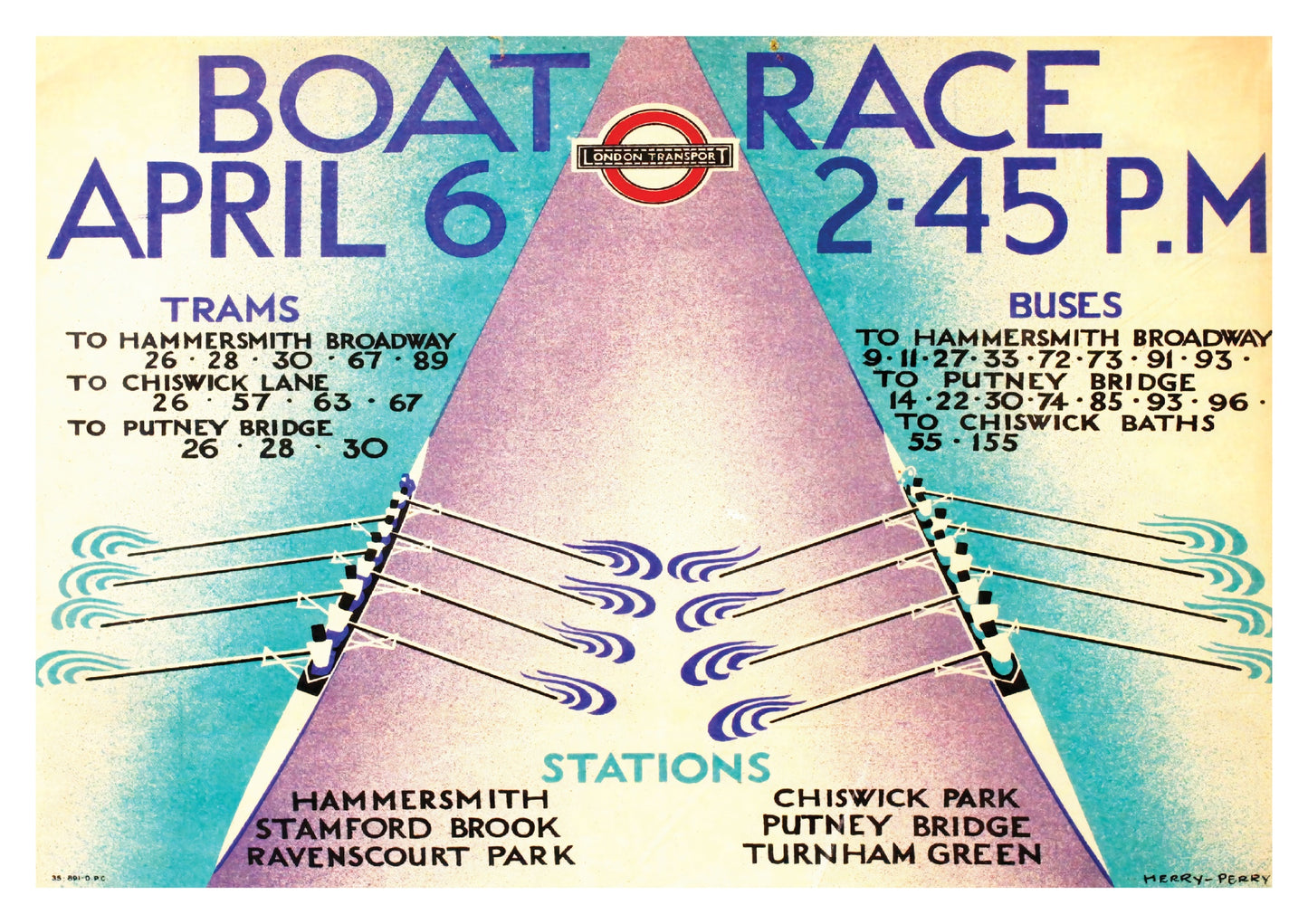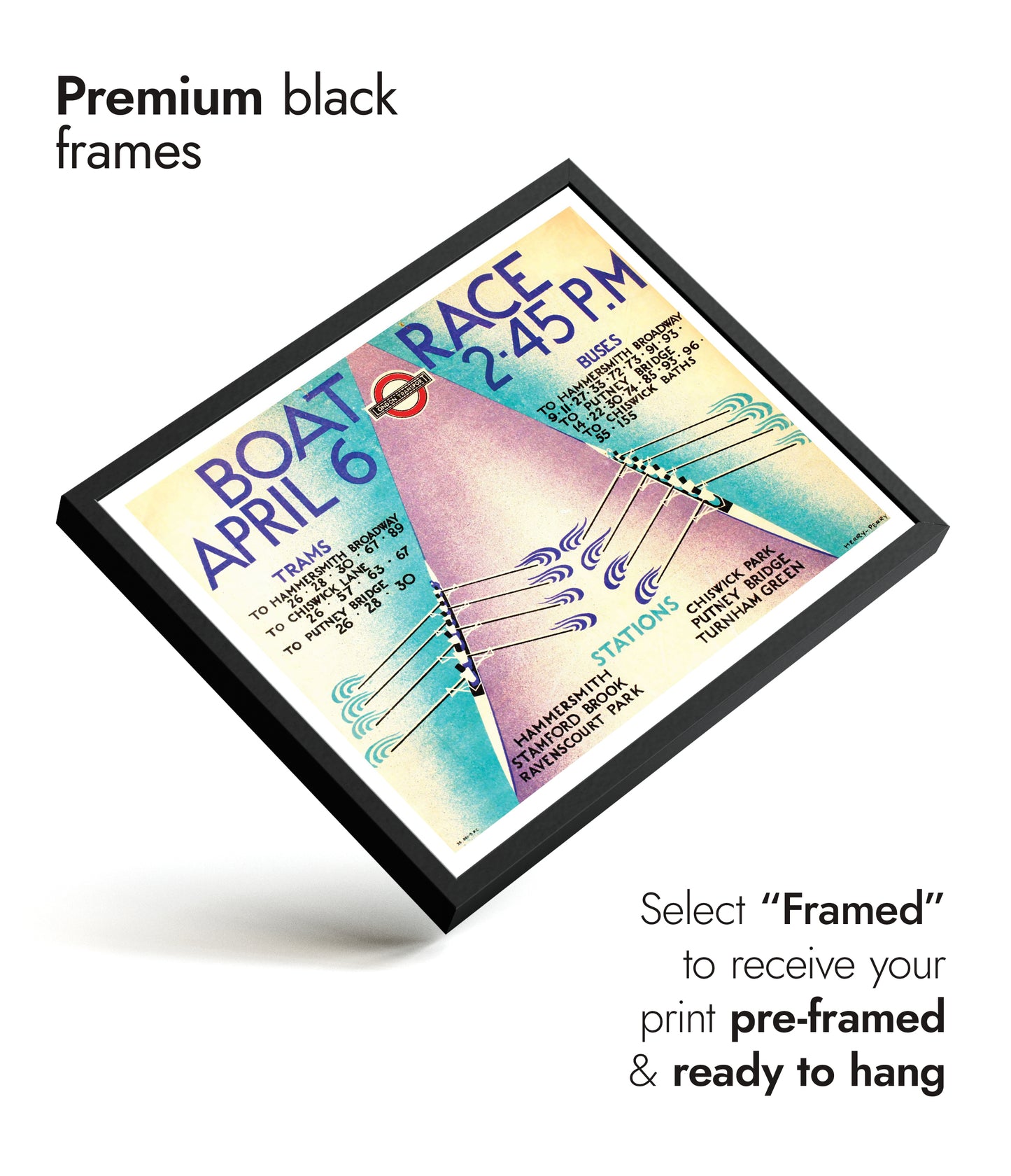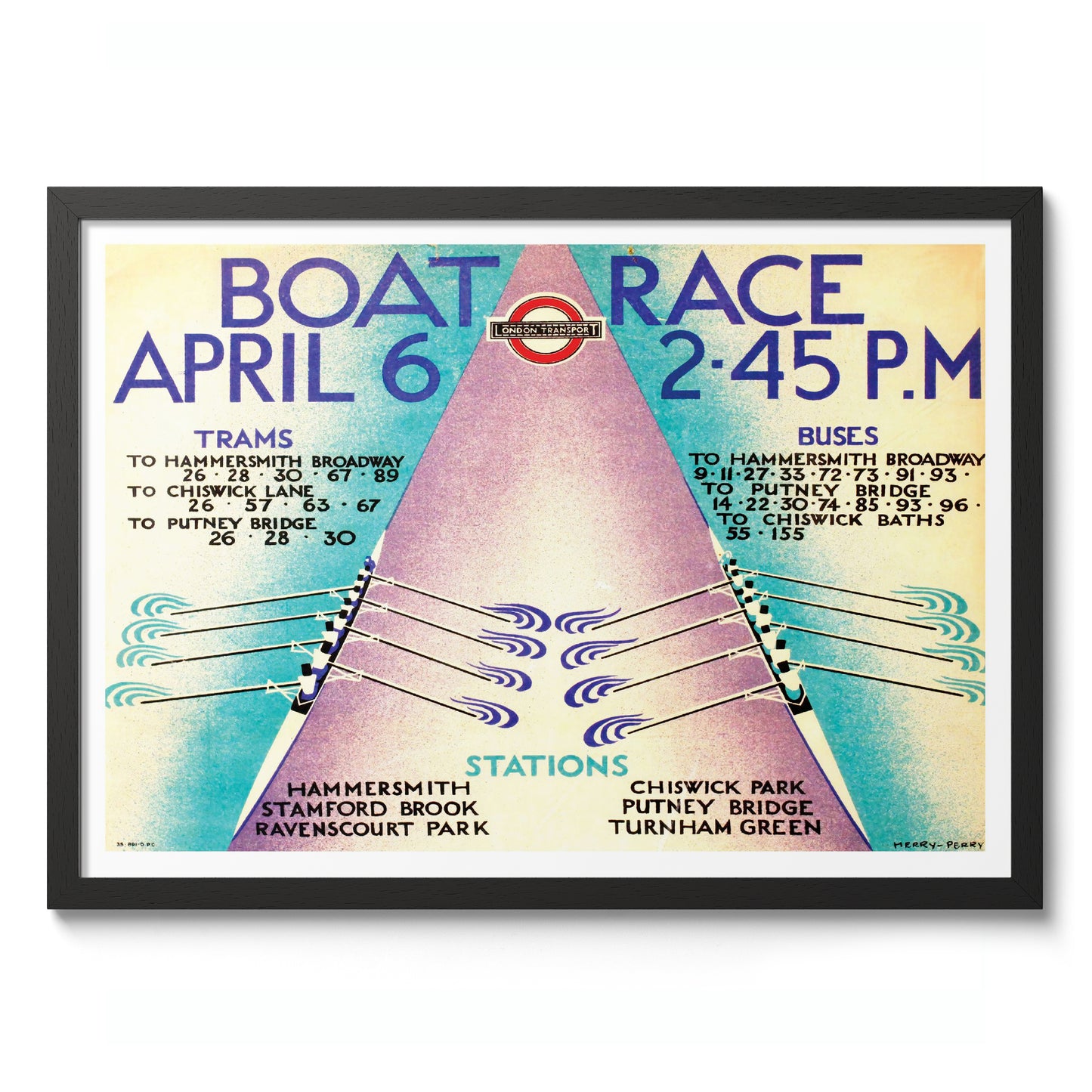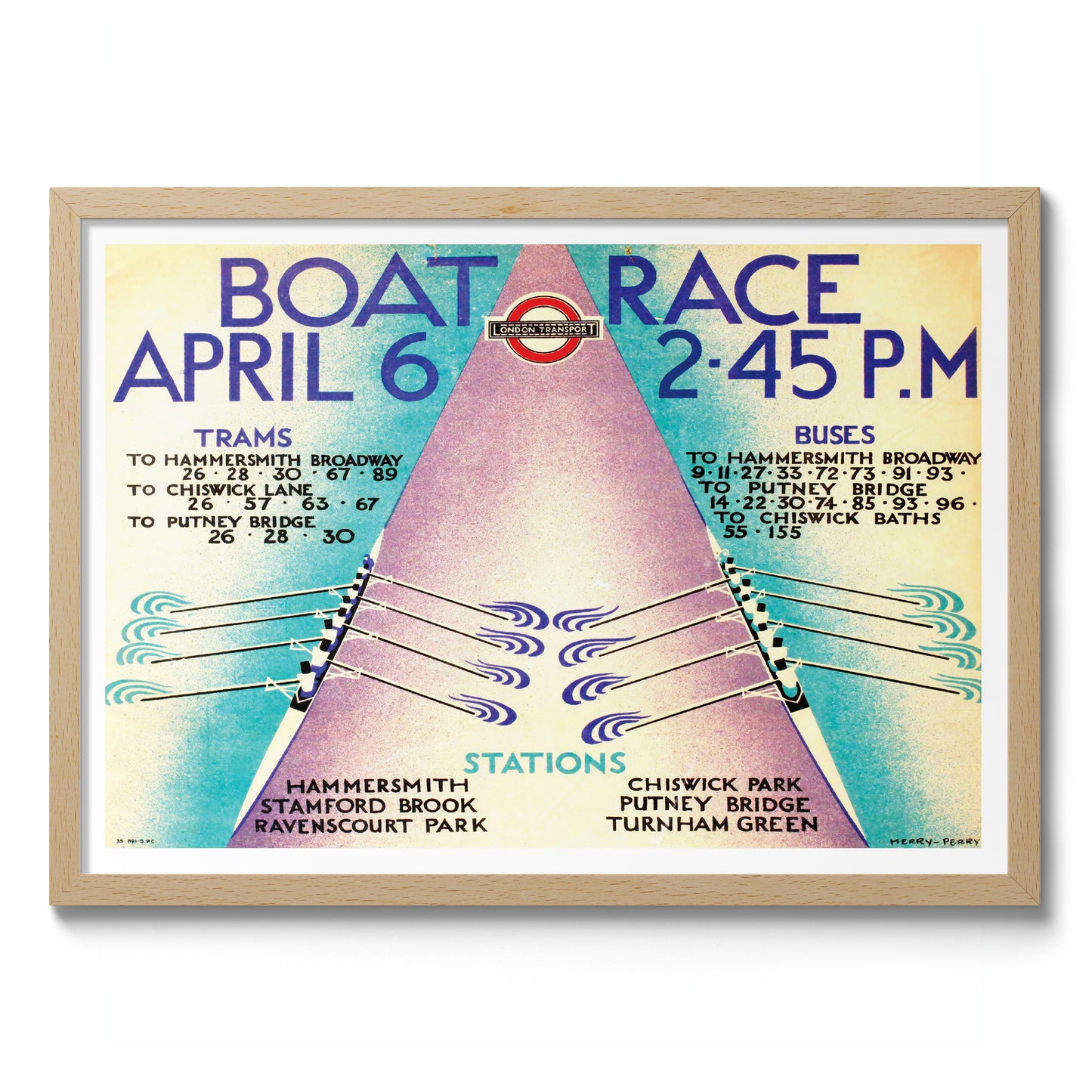 This vintage-style poster captures the excitement of the Chiswick Boat Race with dynamic oars extending from racing boats. Featuring a purple and blue color scheme, it highlights London Underground transport details for spectators. Ideal for fans of sports and rowing, this illustration evokes the spirit of a classic Thames event. Perfect for adding a historical touch to any space.