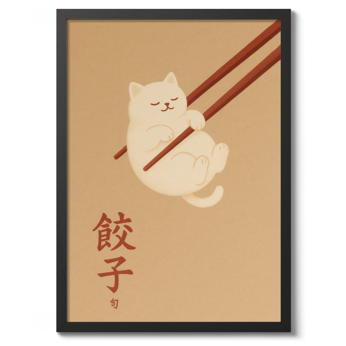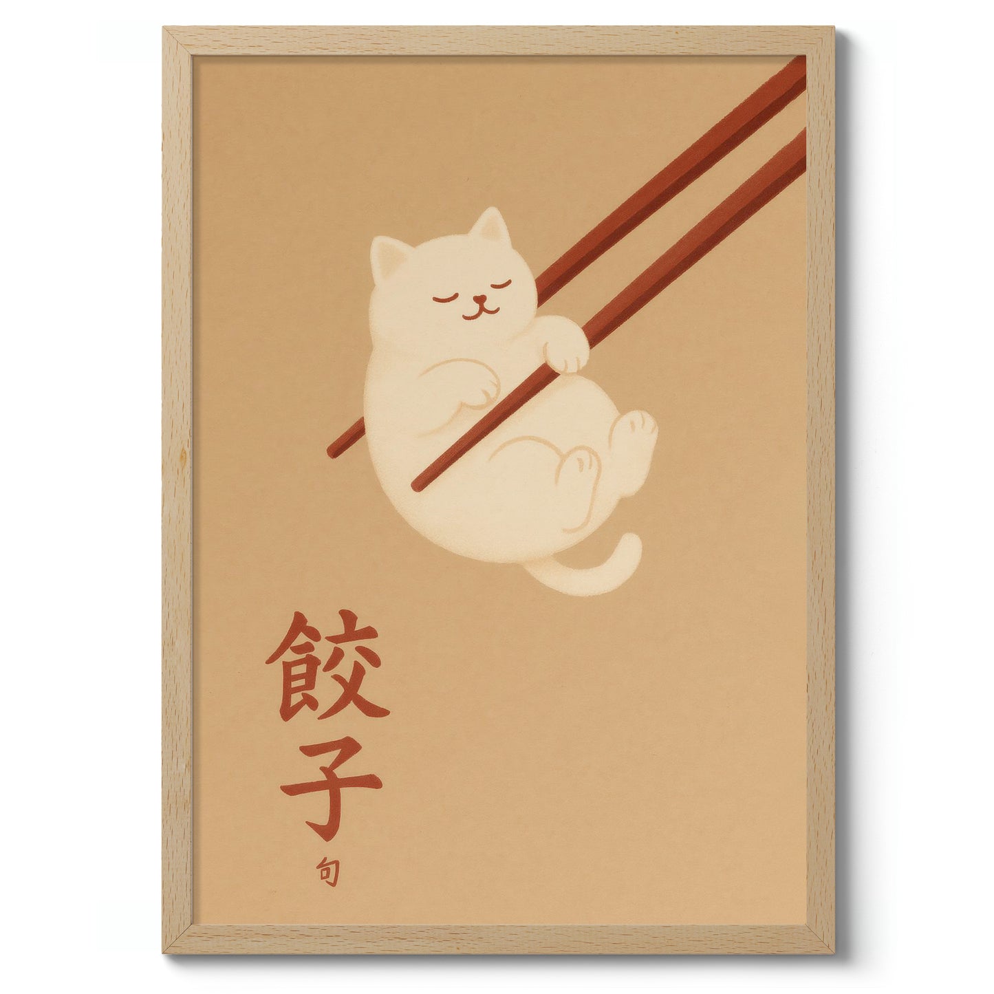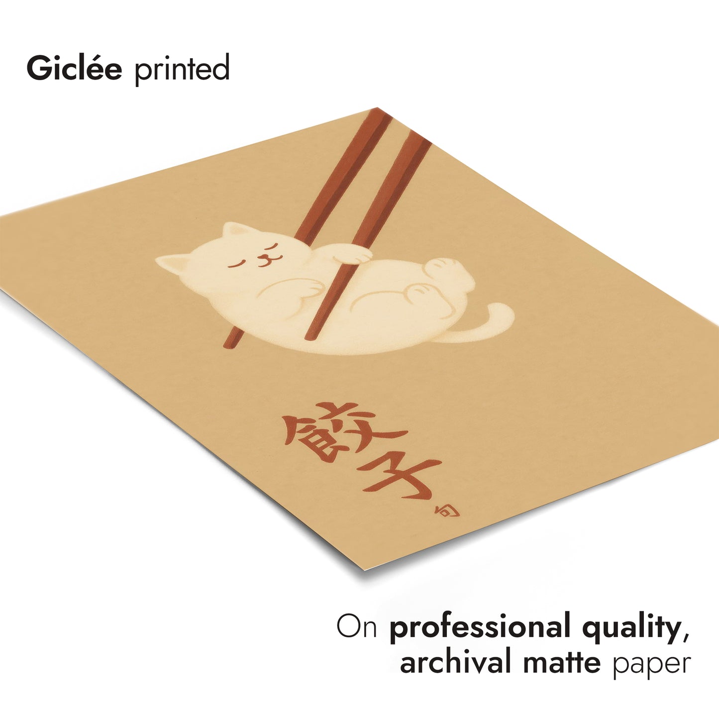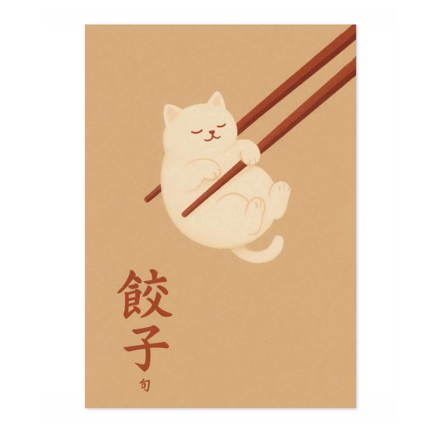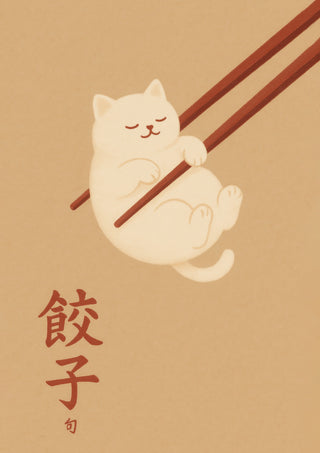 This charming poster titled "Chopstick Cat" features a peaceful white cat comfortably lounging on a pair of chopsticks against a warm beige background. The minimalist illustration, imbued with modern graphic style, exudes a tranquil, whimsical tone. Japanese characters add cultural flair, enhancing the playful theme of this delightful art print. Ideal for cat and sushi lovers.