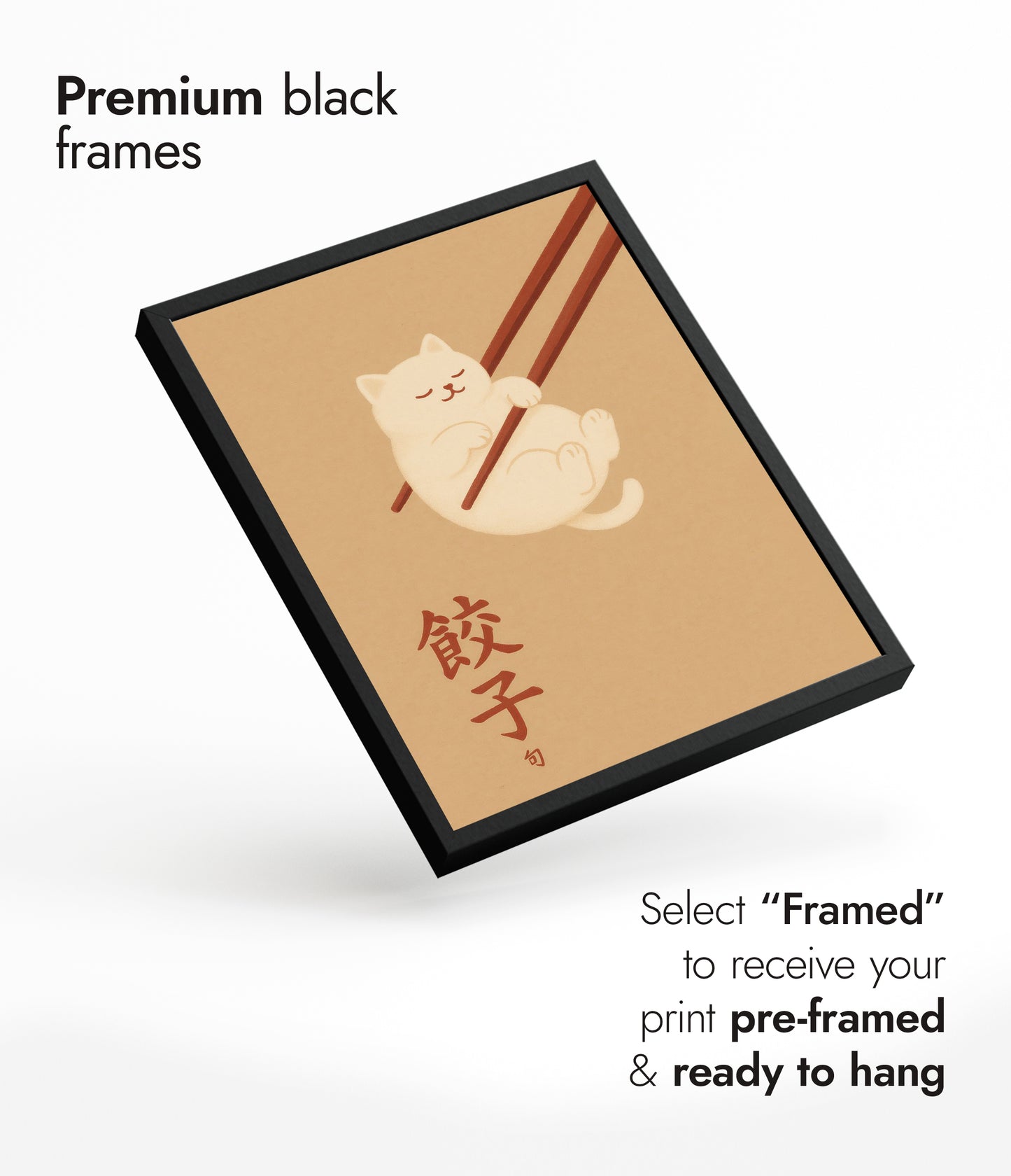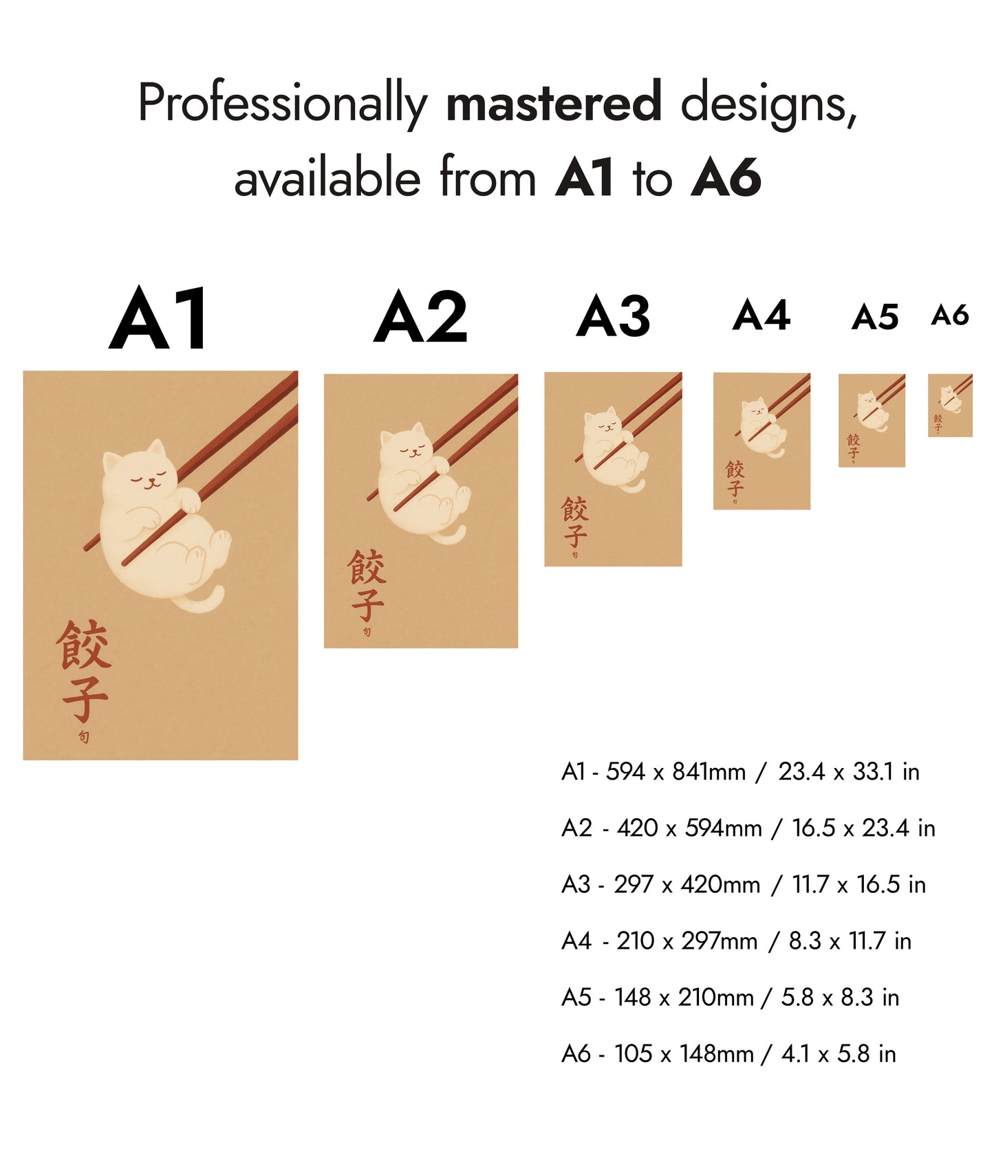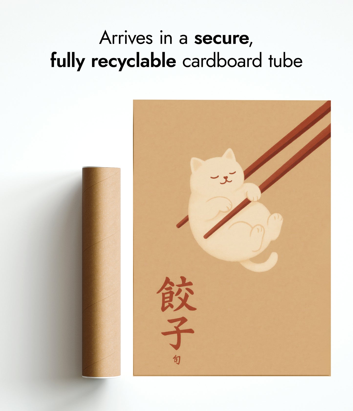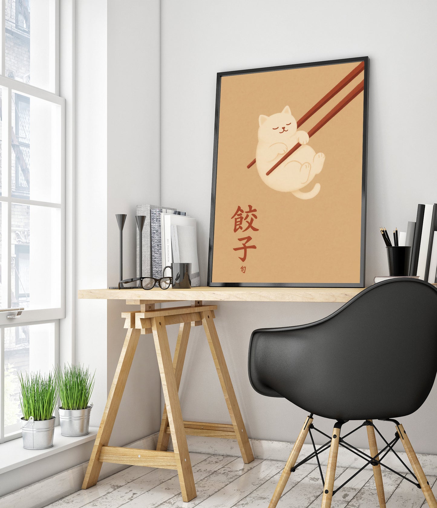 This charming poster titled "Chopstick Cat" features a peaceful white cat comfortably lounging on a pair of chopsticks against a warm beige background. The minimalist illustration, imbued with modern graphic style, exudes a tranquil, whimsical tone. Japanese characters add cultural flair, enhancing the playful theme of this delightful art print. Ideal for cat and sushi lovers.
