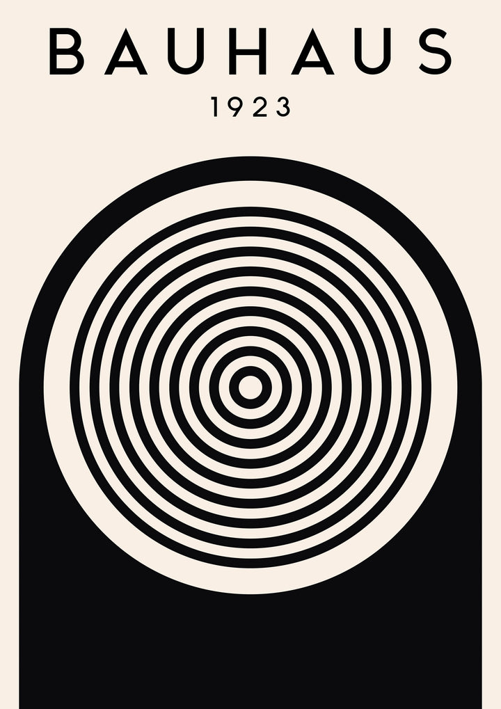 This striking Bauhaus 1923 poster features a minimalist black-and-white design with concentric circles, capturing the essence of geometric abstraction. Perfect for fans of mid-century modern art, this graphic piece exemplifies the Bauhaus movement’s emphasis on form and function. The bold, monochromatic palette and clean lines make it an ideal statement piece for contemporary interiors.