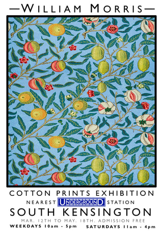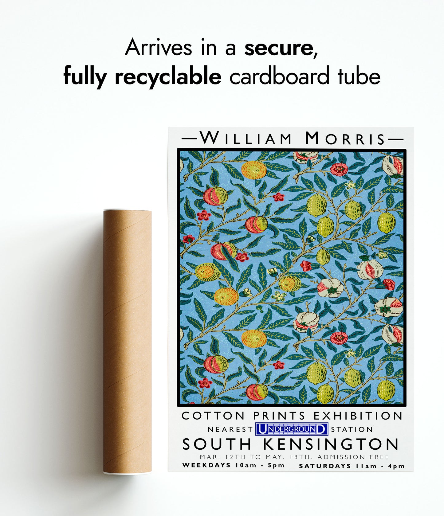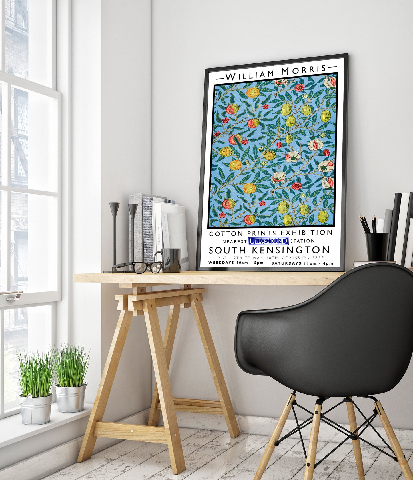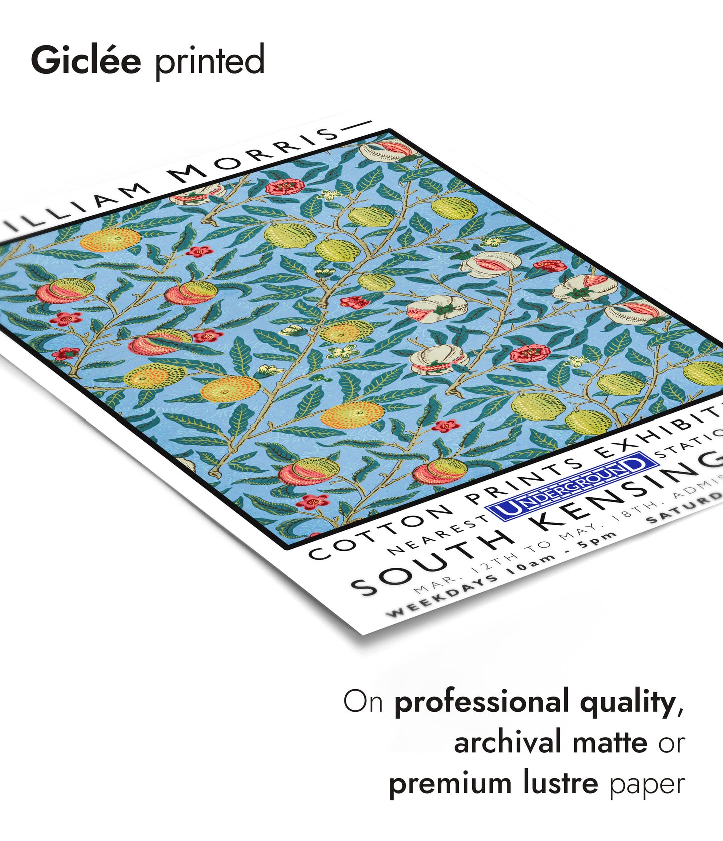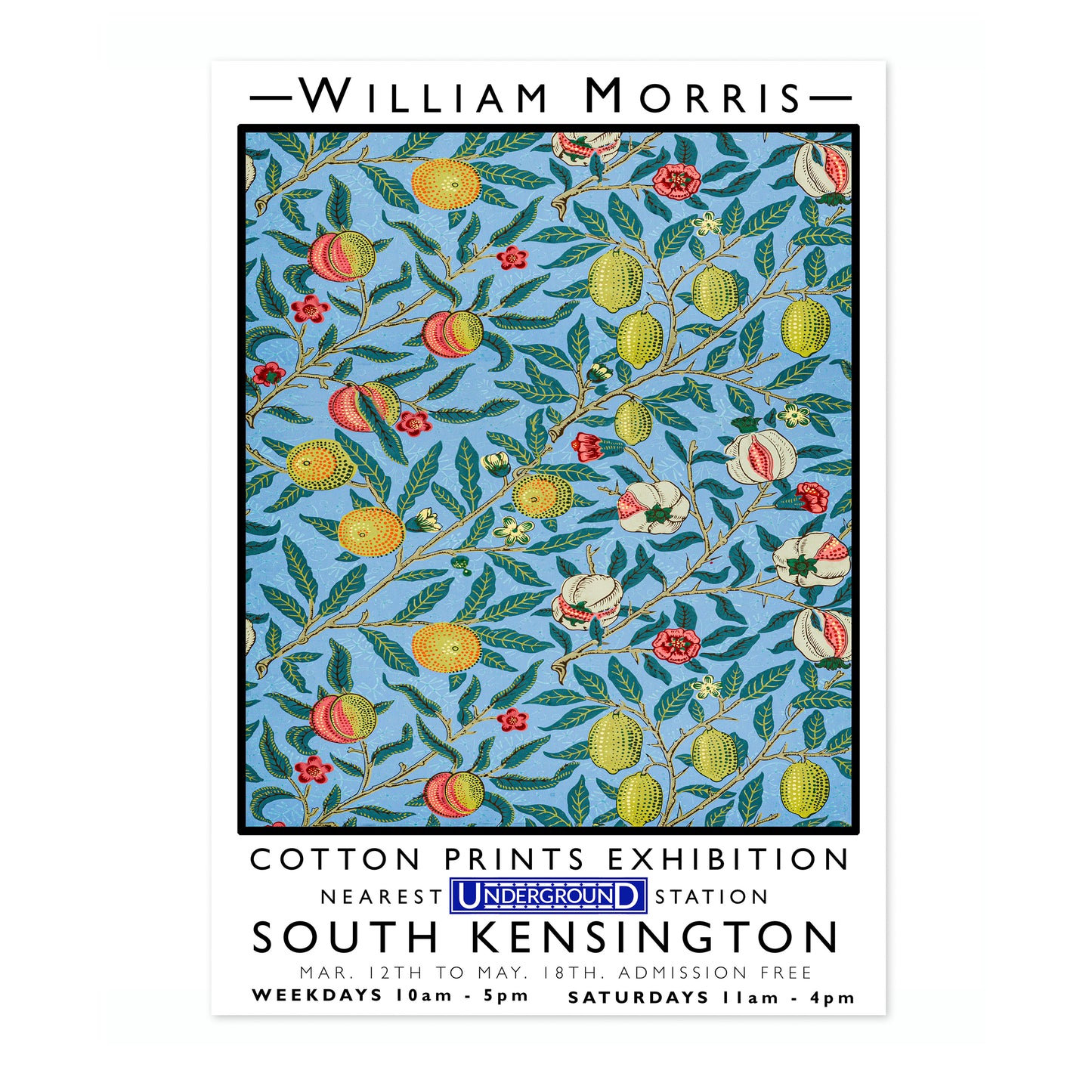 The "Citrus" poster by William Morris features a vibrant and intricate design with lemons, oranges, and lush green leaves set against a pale blue background. This vintage exhibition poster highlights Morris's signature textile artistry, reminiscent of classic floral and fruit patterns. Ideal for fans of graphic and vintage styles, this piece also pays homage to London's historical art exhibitions.