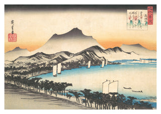 "Clearing Weather at Awazu" is a traditional woodblock poster by Utagawa Hiroshige, showcasing serene landscapes of mountains and lakes. The artwork features detailed boats sailing on a calm lake with lush tree-lined shores in the foreground. The poster captures the peaceful ambiance of nature with intricate lines and subtle colour gradients, embodying the essence of ukiyo-e style.
