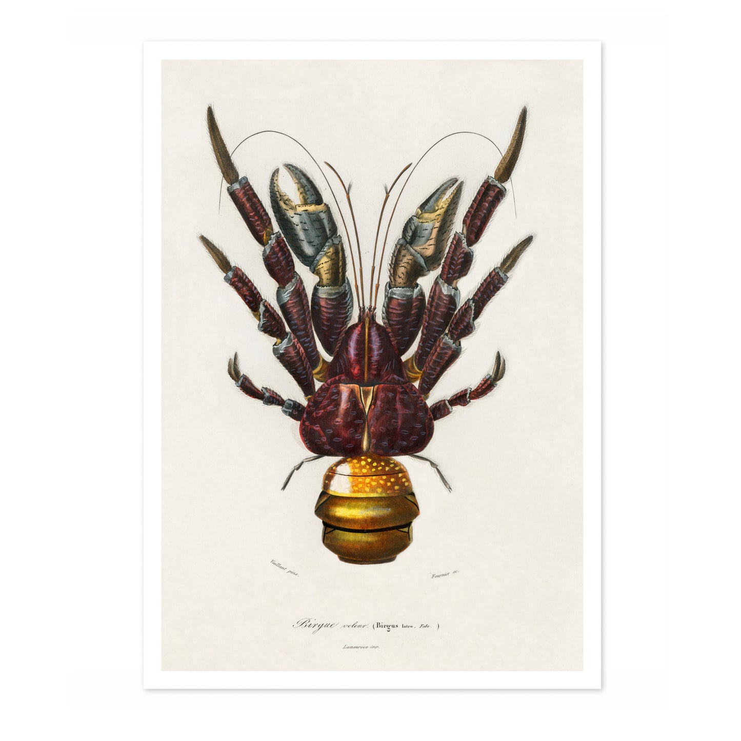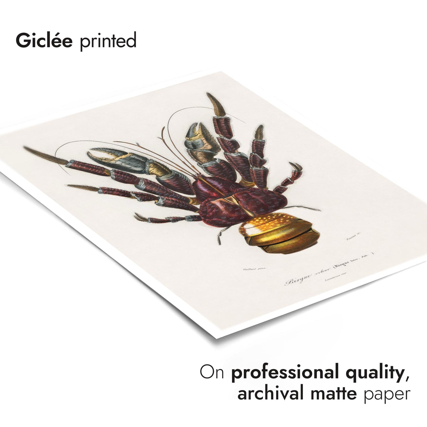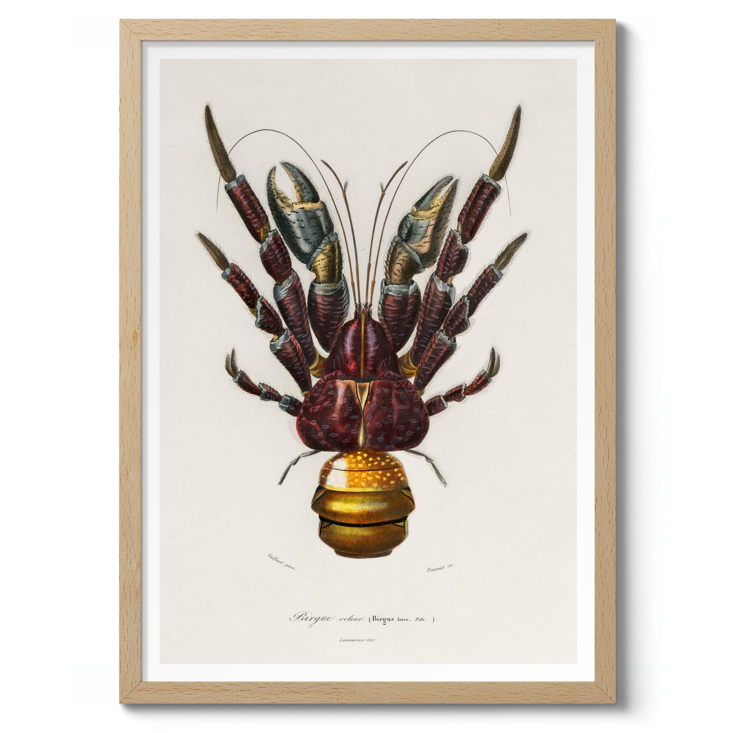 This vintage poster titled "Coconut Crab" by Charles D'Orbigny features a detailed zoological illustration. The central focus is a meticulously depicted coconut crab with vivid reds and browns that highlight its unique anatomy. Perfect for adding a touch of nature and scientific curiosity to any space. Ideal for lovers of vintage illustration and marine life themes.