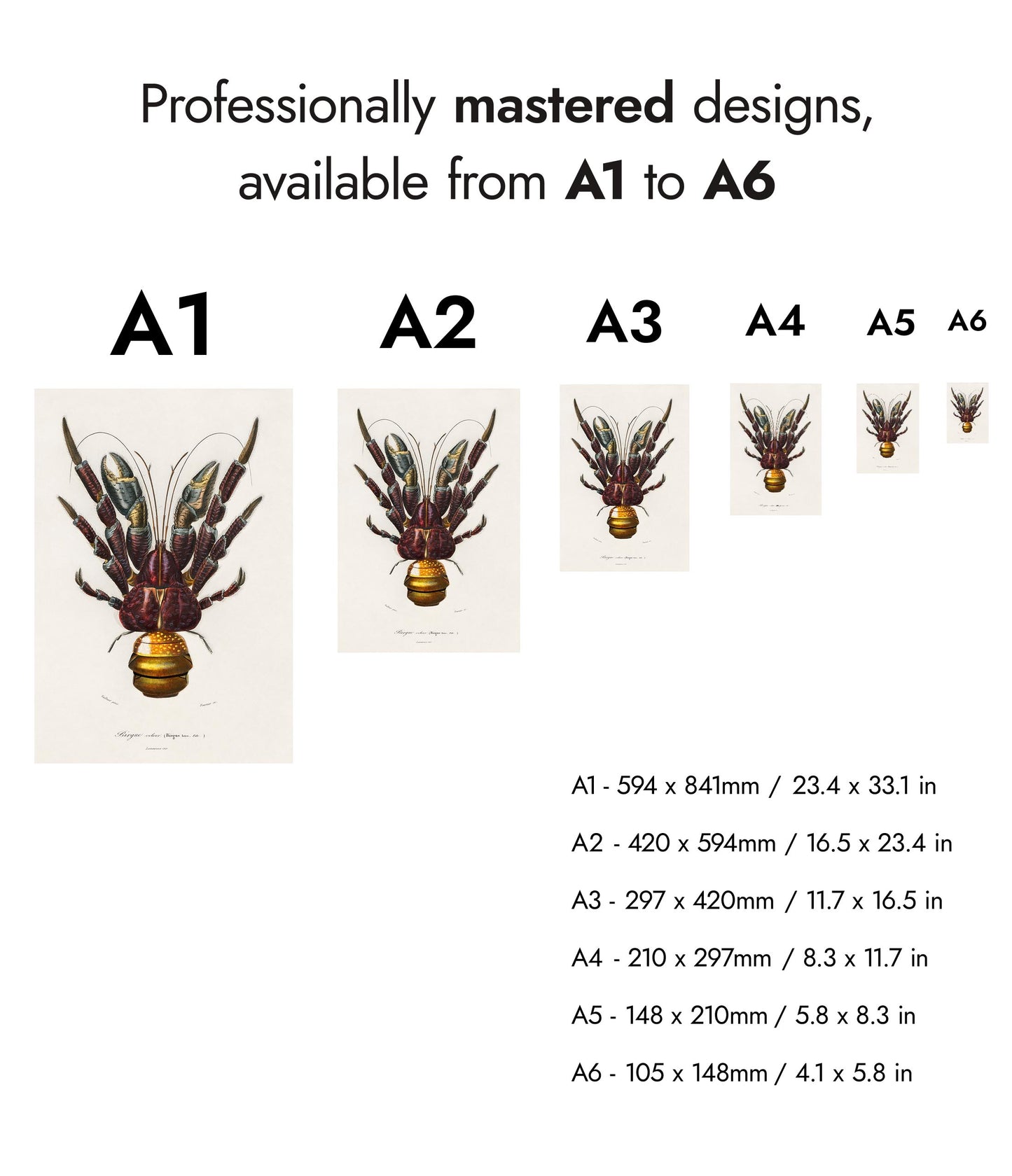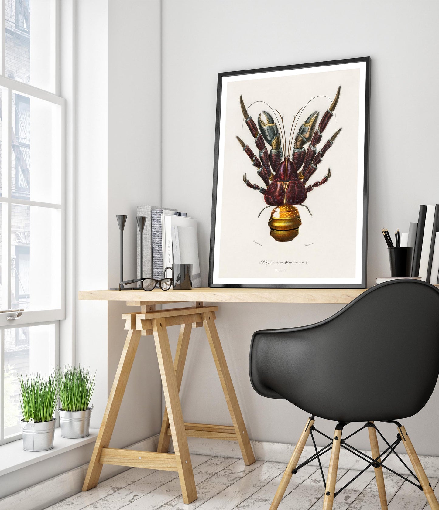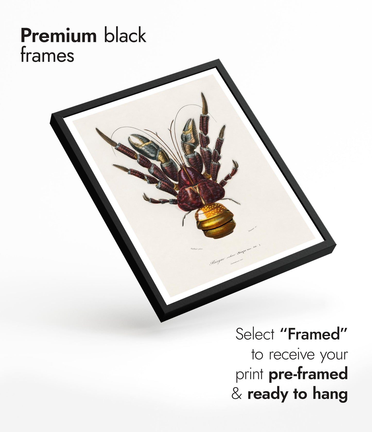 This vintage poster titled "Coconut Crab" by Charles D'Orbigny features a detailed zoological illustration. The central focus is a meticulously depicted coconut crab with vivid reds and browns that highlight its unique anatomy. Perfect for adding a touch of nature and scientific curiosity to any space. Ideal for lovers of vintage illustration and marine life themes.