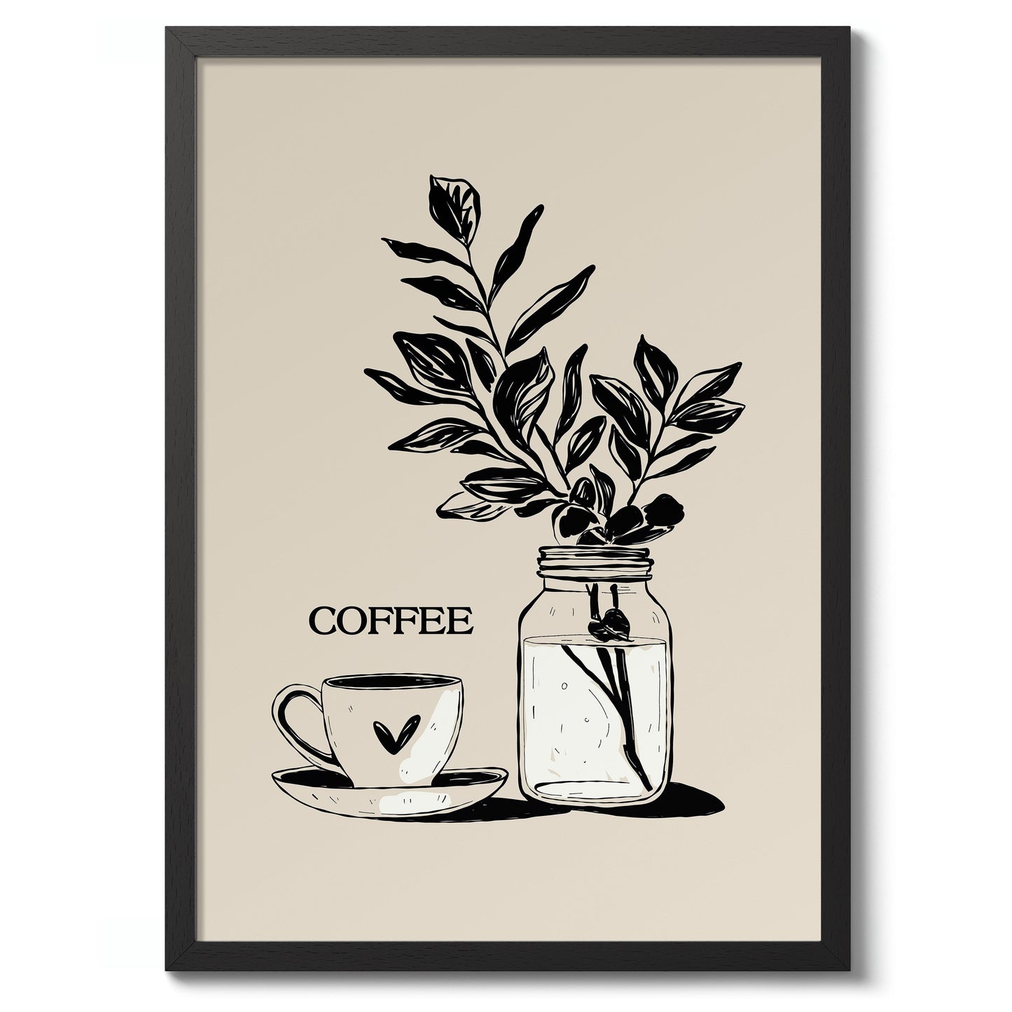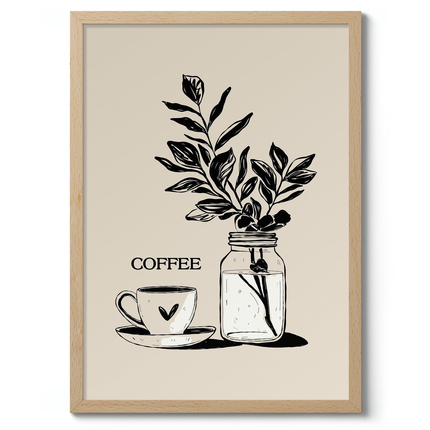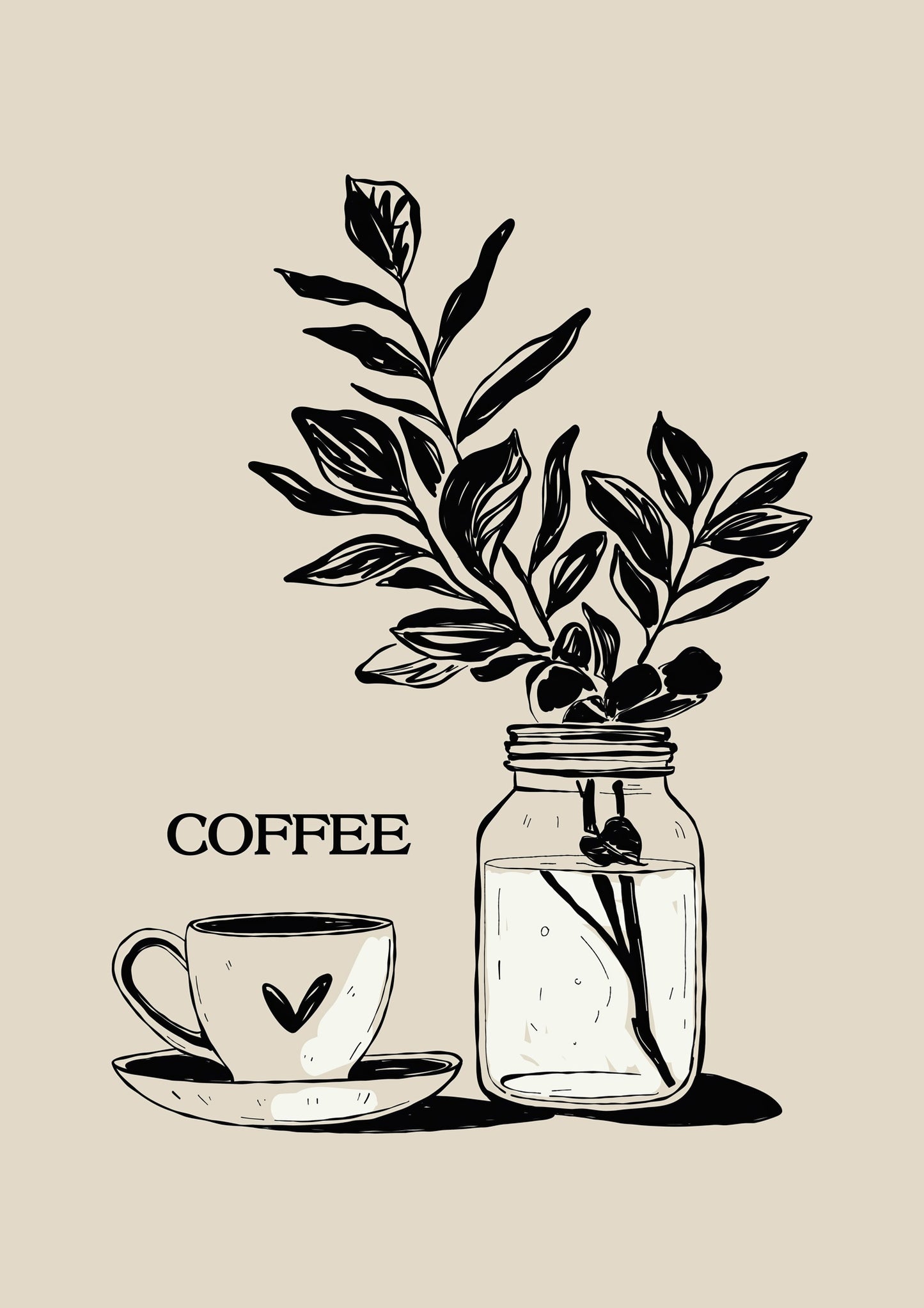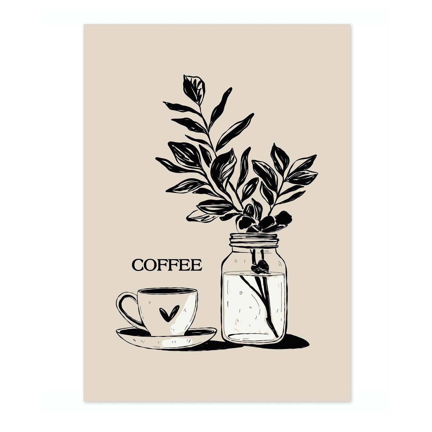This elegant illustration poster features a simplistic black and white design of a coffee cup alongside a mason jar filled with leafy branches. Titled "Coffee," this art print celebrates modern minimalism with its clean lines and understated aesthetic, making it ideal for kitchen or café decor. Perfect for coffee enthusiasts and lovers of minimalistic art.