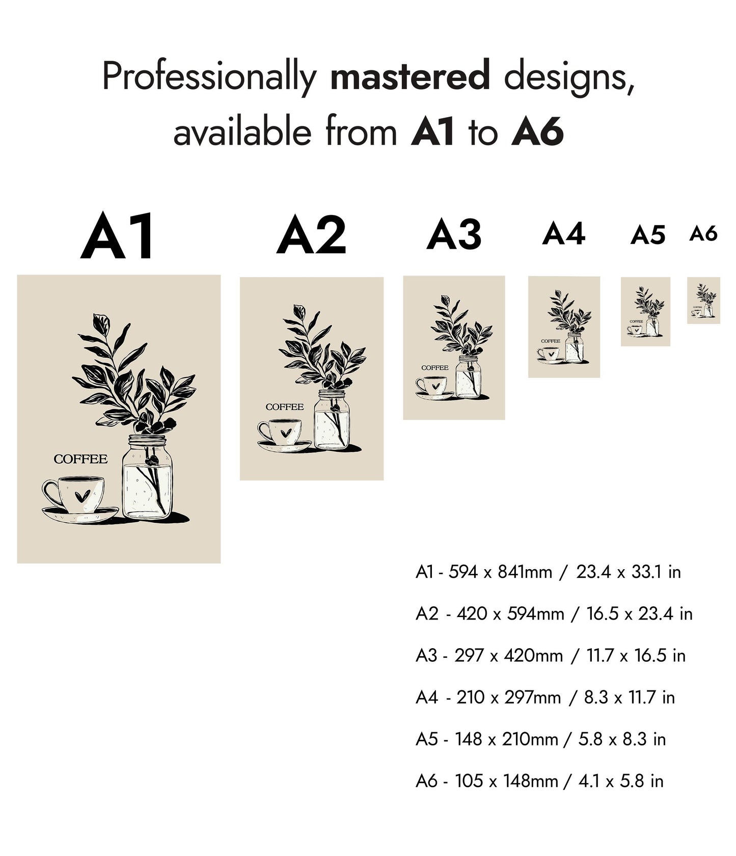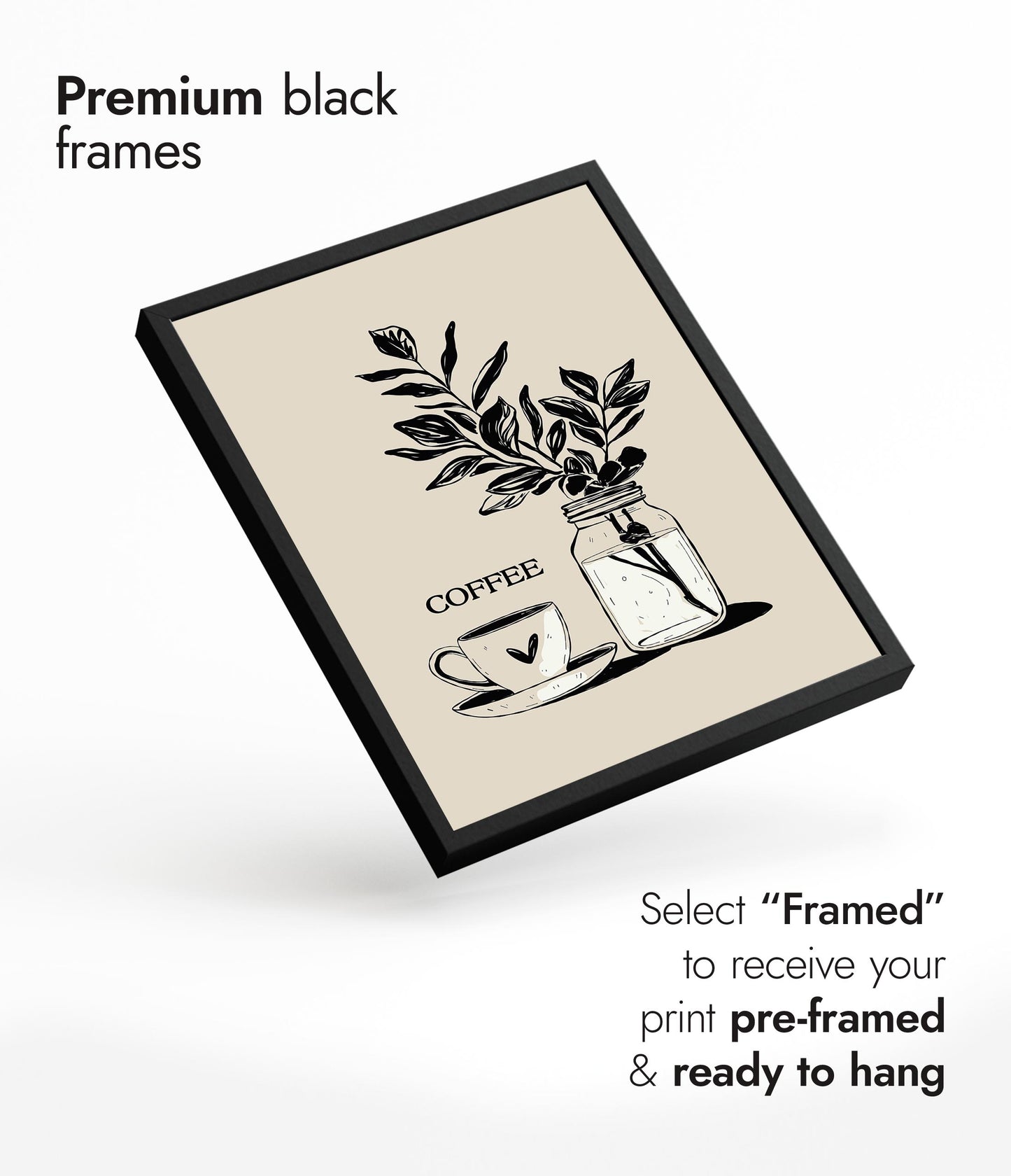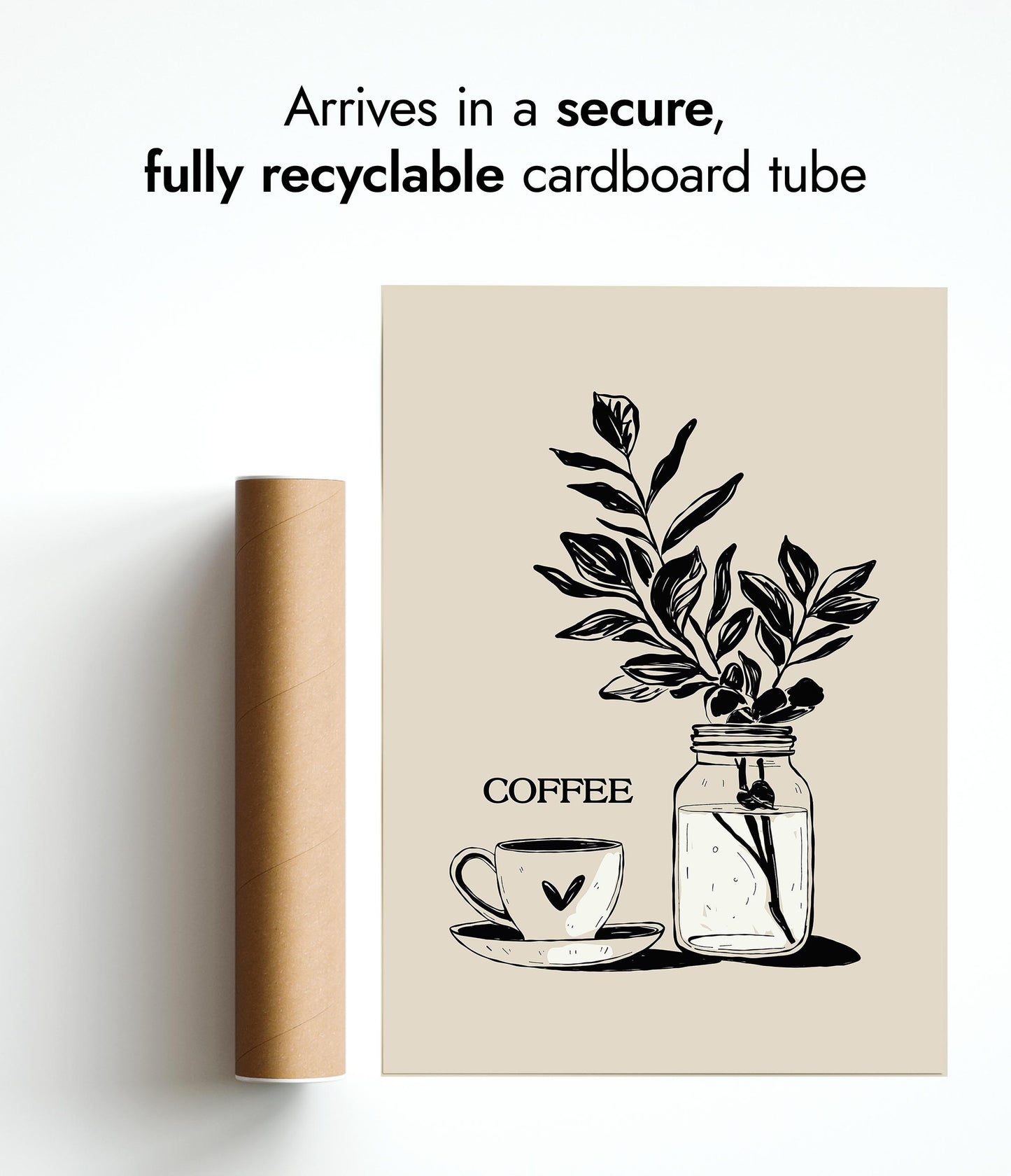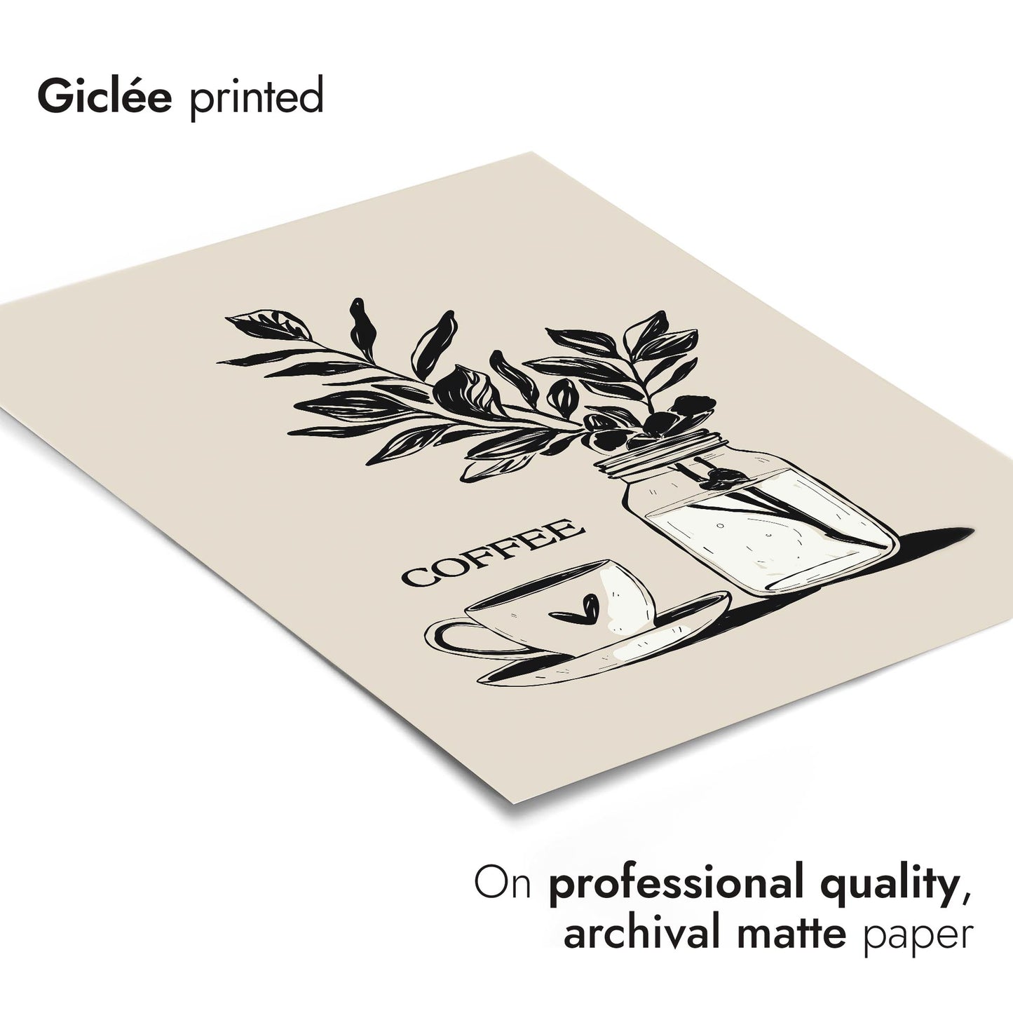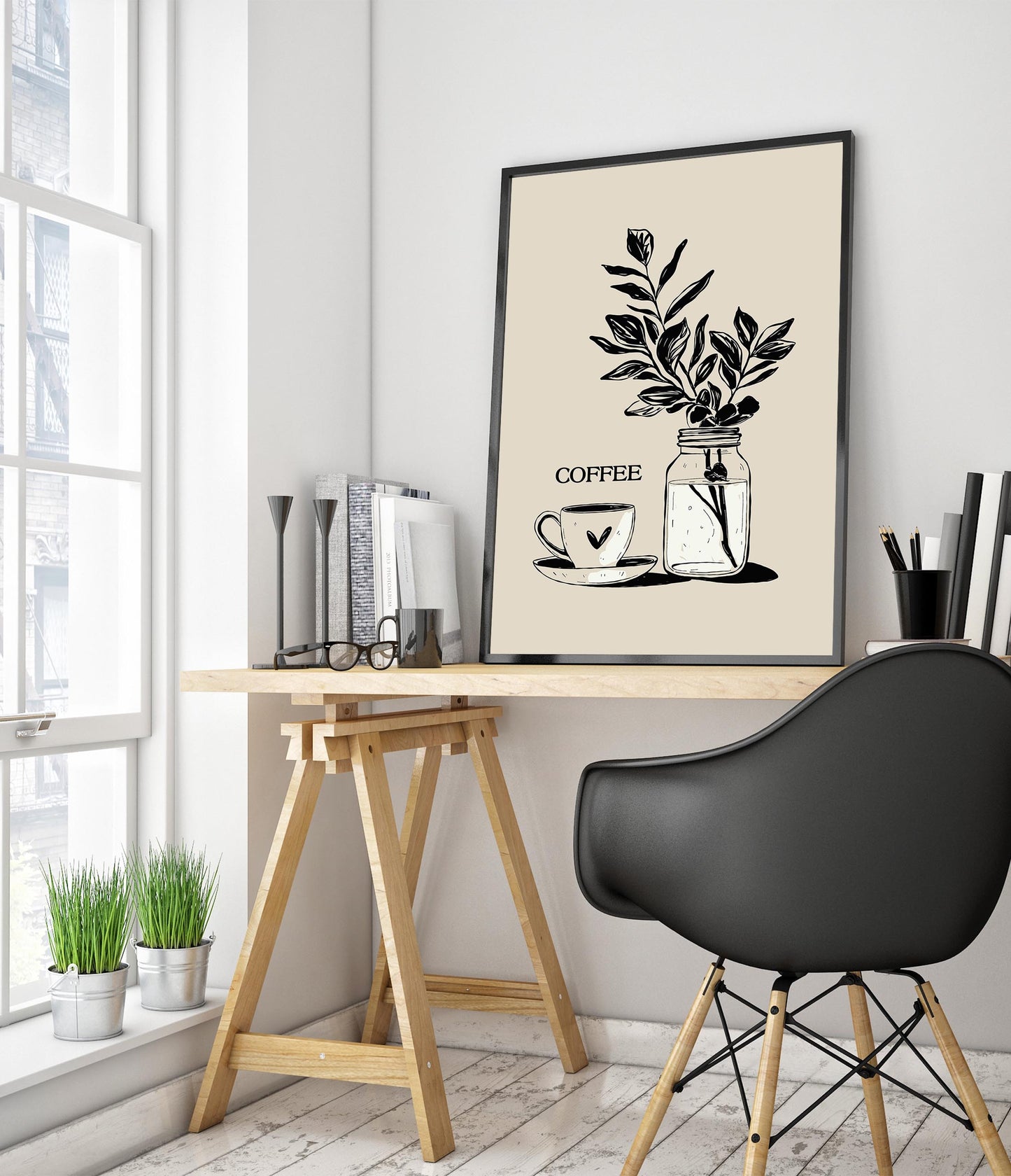 This elegant illustration poster features a simplistic black and white design of a coffee cup alongside a mason jar filled with leafy branches. Titled "Coffee," this art print celebrates modern minimalism with its clean lines and understated aesthetic, making it ideal for kitchen or café decor. Perfect for coffee enthusiasts and lovers of minimalistic art.