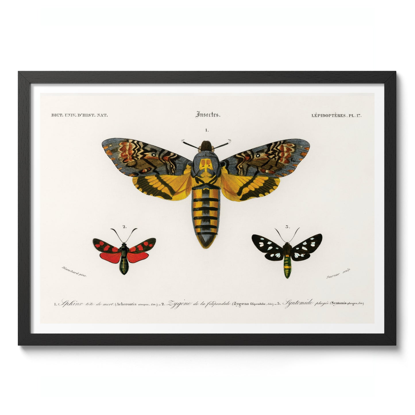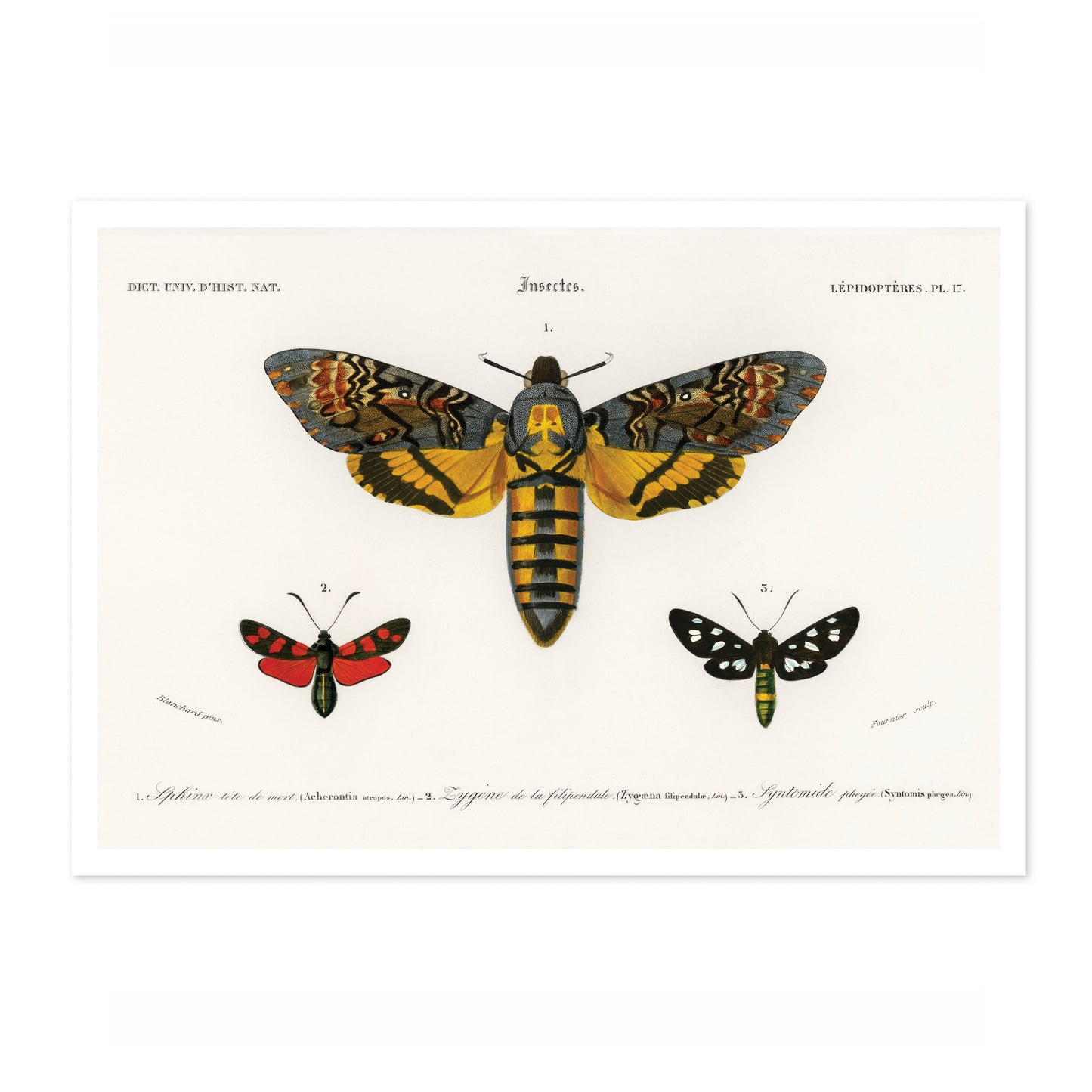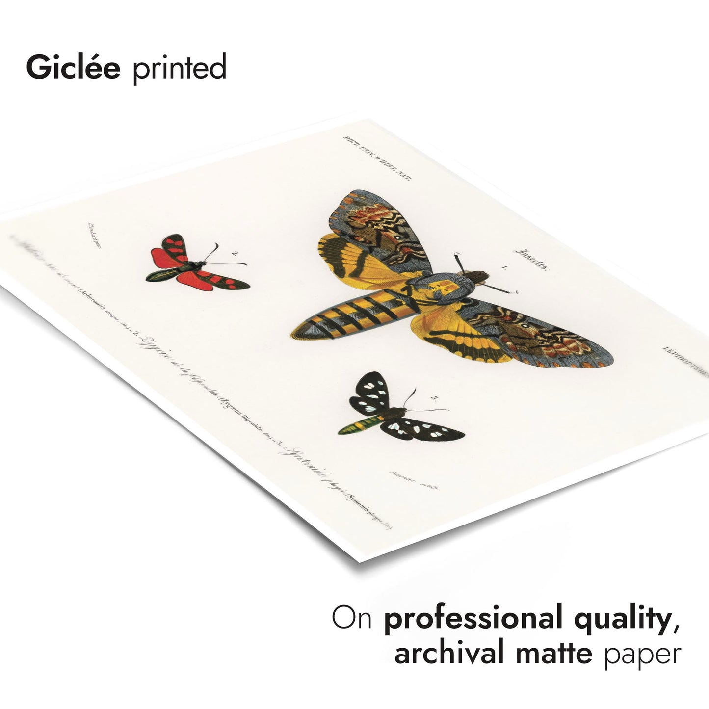 This vintage "Collection of Moths" poster by Charles D'Orbigny showcases three intricately detailed moth illustrations. The central moth, with its vivid patterns, is surrounded by two smaller moths, highlighting the diversity within the species. The classic typography and scientific notation add an educational touch, making it perfect for nature and zoology enthusiasts. Ideal for adding a historical and artistic flair to any space.